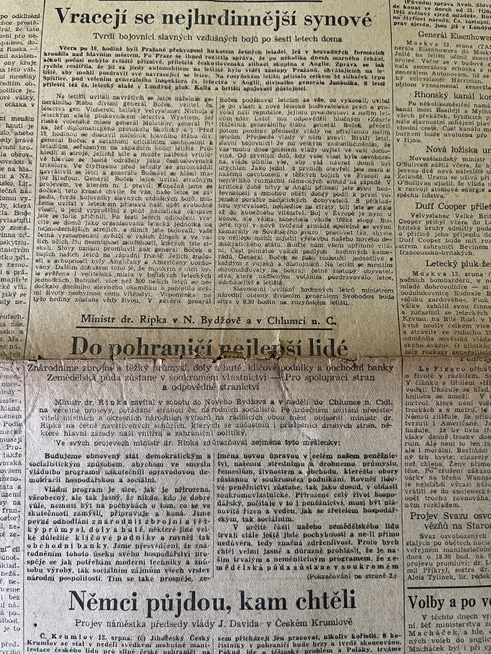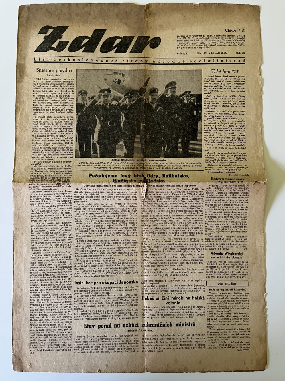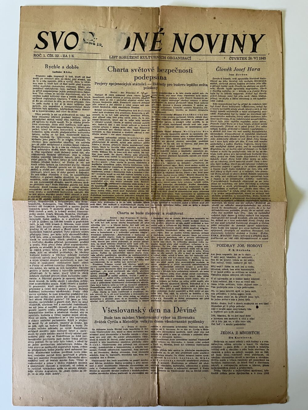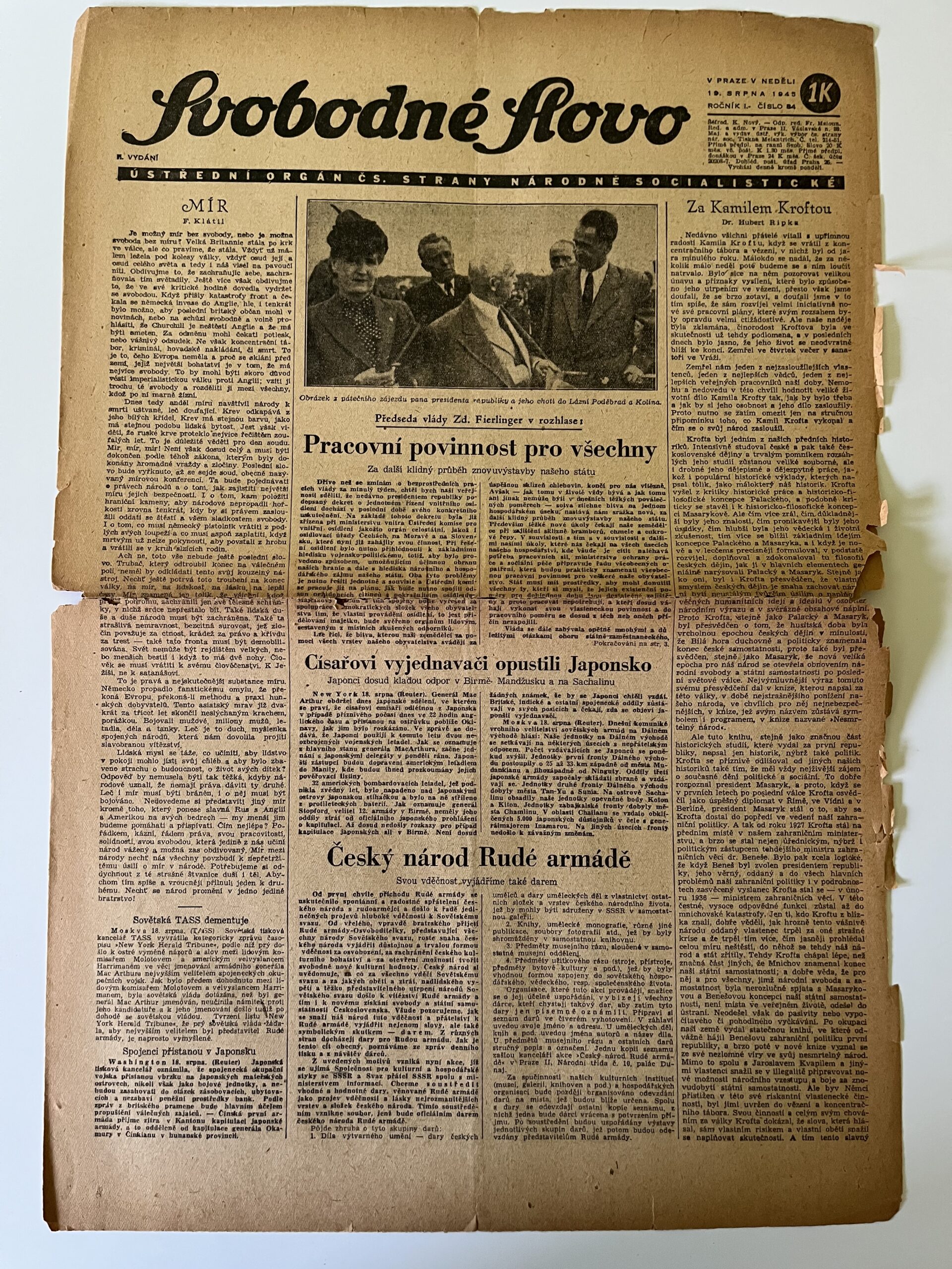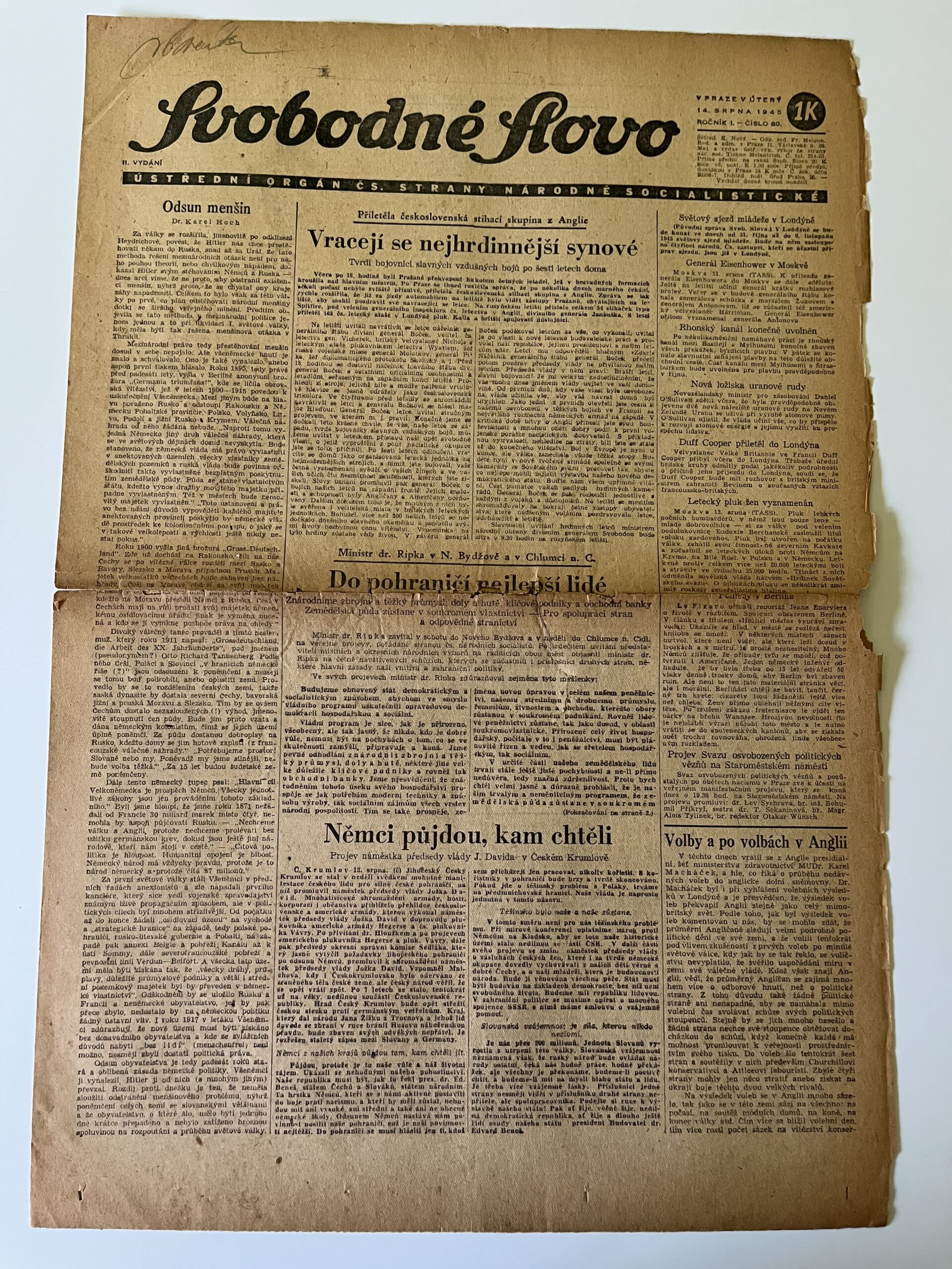 8 (K3-3) Svobodné Slovo,Zdar,Lidová demokracie. Rozměr jedné strany 32 x 47 cm. Celek novin obsahuje 5 x Svobodné Slovo 14.srpna 1945 – Vracejí se nejhrdinnější synové po šesti letech doma…aj., 4 strany. Svobodné Slovo 20.května 1945 – Do Národních výborů pracovníky z odboje. Všichni do radostné práce. Čeští vlastenci se vracejí…aj., 4 strany. Svobodné Slovo 19.května 1945 – Očista veřejného života pokračuje. Podniky musí sloužit národu…aj. 4 strany. Svobodné Slovo 19.srpna 1945 – Pracovní povinnost pro všechny. Český národ Rudé armádě…aj., 4 strany. Svobodné Slovo 22.srpna 1945 – Vrátili se jako vítězové. Okupace Japonska započne v neděli…aj., 4 strany. Večerní Svobodné Slovo 23.května 1945 – Na barikádách padlo 1632 Čechů…aj. 1 list. Lidová demokracie 21.srpna 1945 – Americké okupační síly do Japonska. Československé bratrstvo…aj. 4 strany. Svobodné noviny 28.června 1945 – Charta světové bezpečnosti podepsána. Všeslovanský den na Děvíně…aj. 4 strany. Zdar Zlín 25. a 26. září 1945 – Maršál Montgomery navštívil Československo. Baťova nemocnice zveřejněna…aj. 4 strany. Některé noviny jsou v přehybu poškozeny.