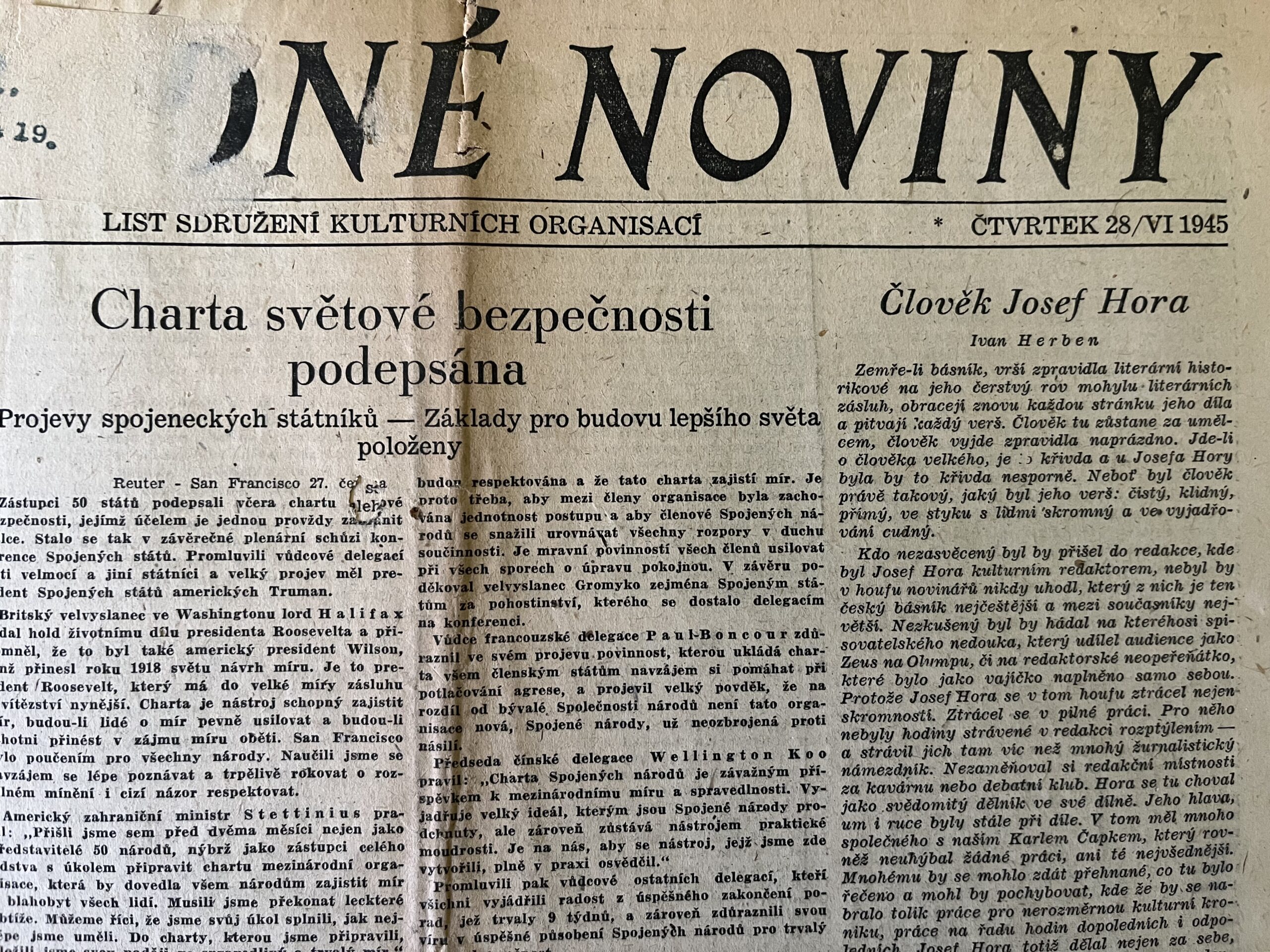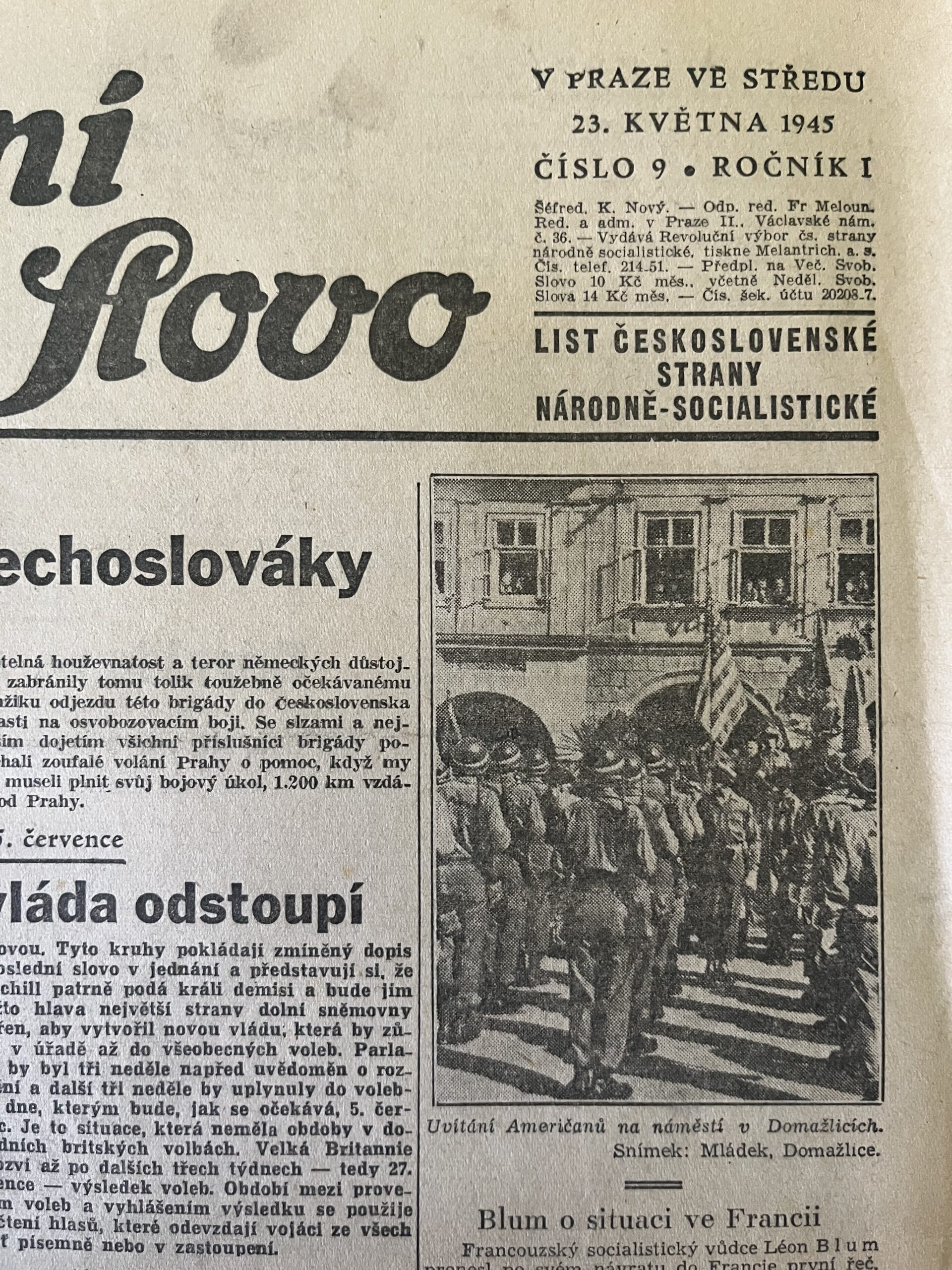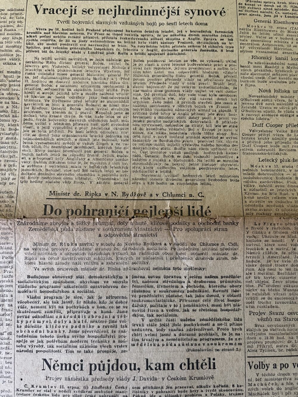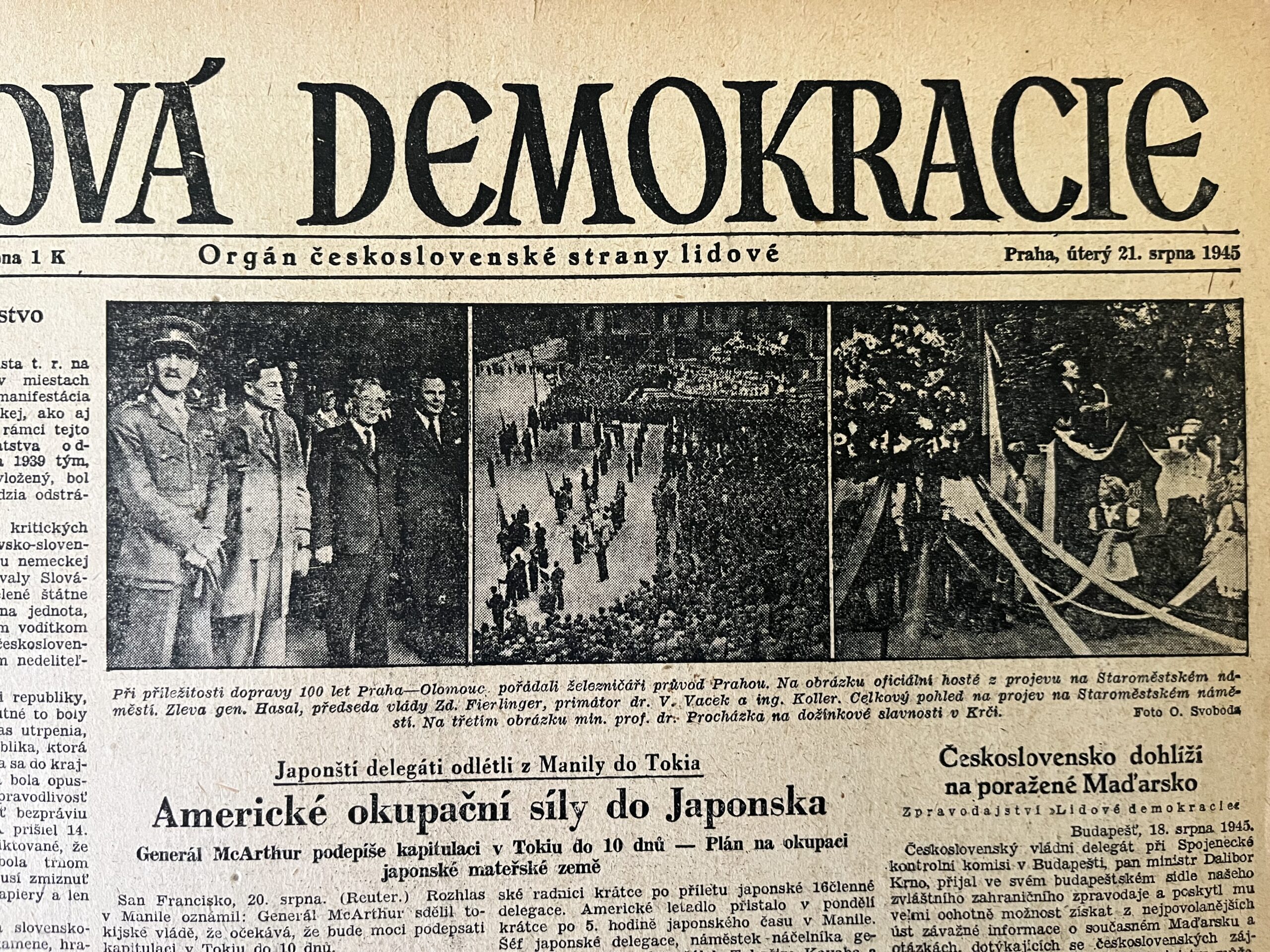 8 (K3-3) Svobodné Slovo,Zdar,Lidová demokracie. Rozměr jedné strany 32 x 47 cm. Celek novin obsahuje 5 x Svobodné Slovo 14.srpna 1945 – Vracejí se nejhrdinnější synové po šesti letech doma…aj., 4 strany. Svobodné Slovo 20.května 1945 – Do Národních výborů pracovníky z odboje. Všichni do radostné práce. Čeští vlastenci se vracejí…aj., 4 strany. Svobodné Slovo 19.května 1945 – Očista veřejného života pokračuje. Podniky musí sloužit národu…aj. 4 strany. Svobodné Slovo 19.srpna 1945 – Pracovní povinnost pro všechny. Český národ Rudé armádě…aj., 4 strany. Svobodné Slovo 22.srpna 1945 – Vrátili se jako vítězové. Okupace Japonska započne v neděli…aj., 4 strany. Večerní Svobodné Slovo 23.května 1945 – Na barikádách padlo 1632 Čechů…aj. 1 list. Lidová demokracie 21.srpna 1945 – Americké okupační síly do Japonska. Československé bratrstvo…aj. 4 strany. Svobodné noviny 28.června 1945 – Charta světové bezpečnosti podepsána. Všeslovanský den na Děvíně…aj. 4 strany. Zdar Zlín 25. a 26. září 1945 – Maršál Montgomery navštívil Československo. Baťova nemocnice zveřejněna…aj. 4 strany. Některé noviny jsou v přehybu poškozeny.