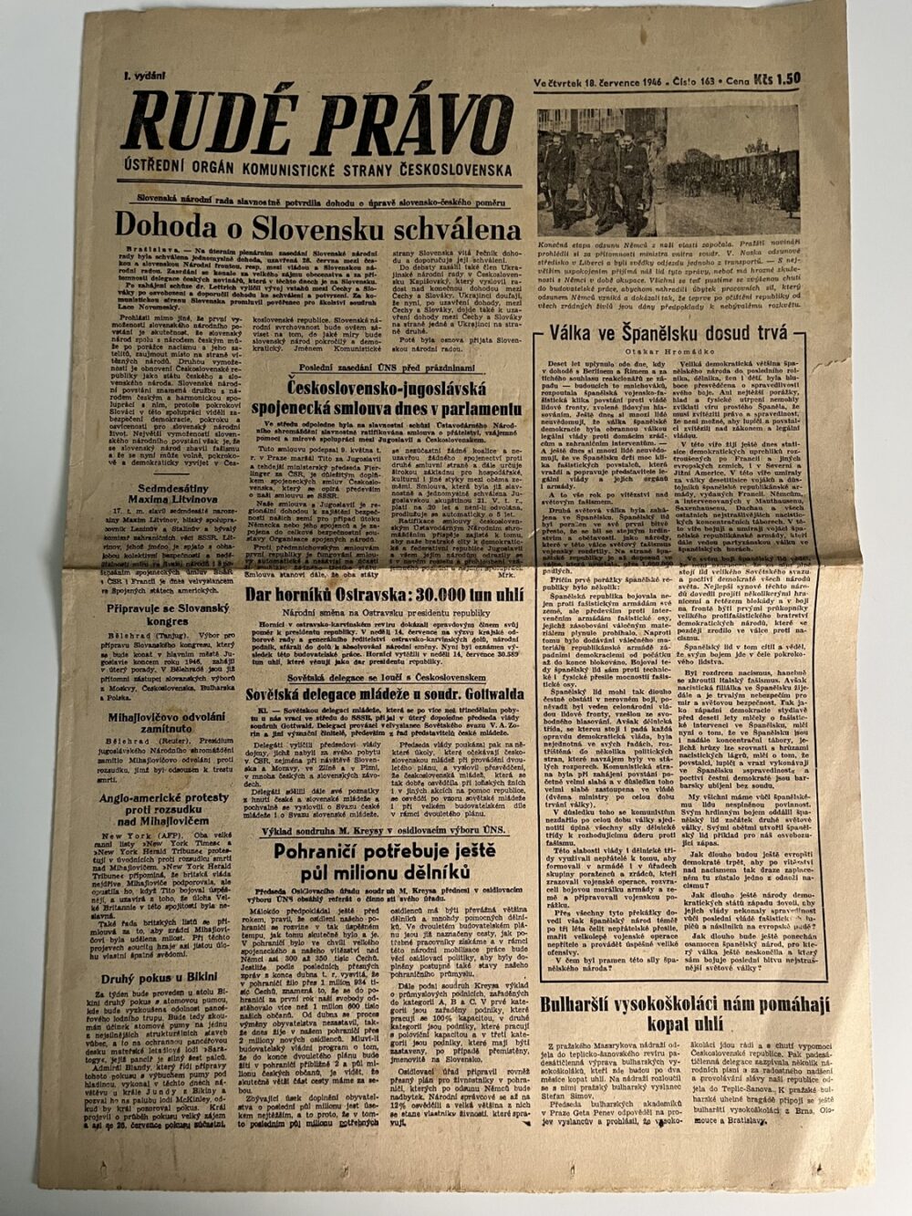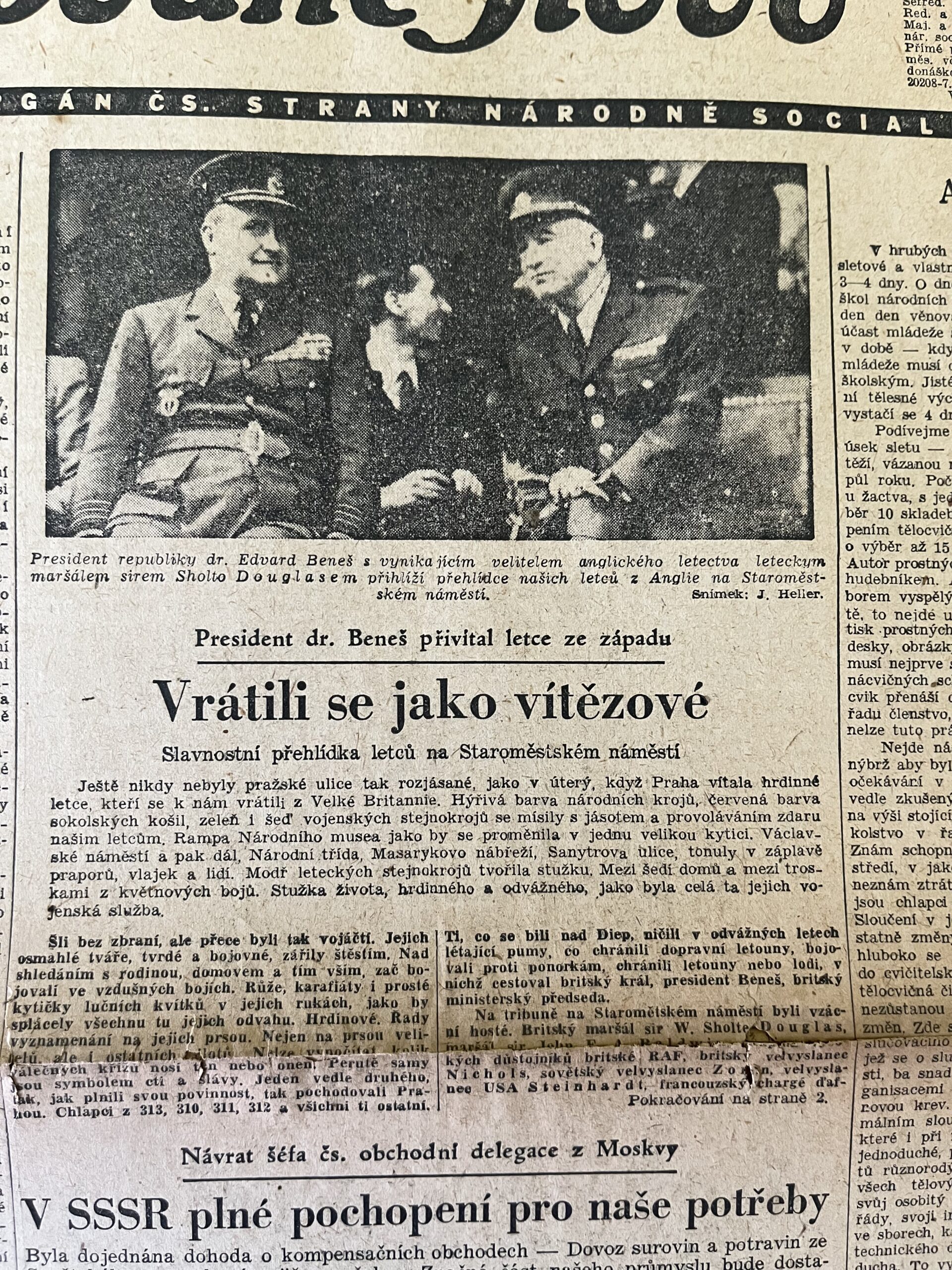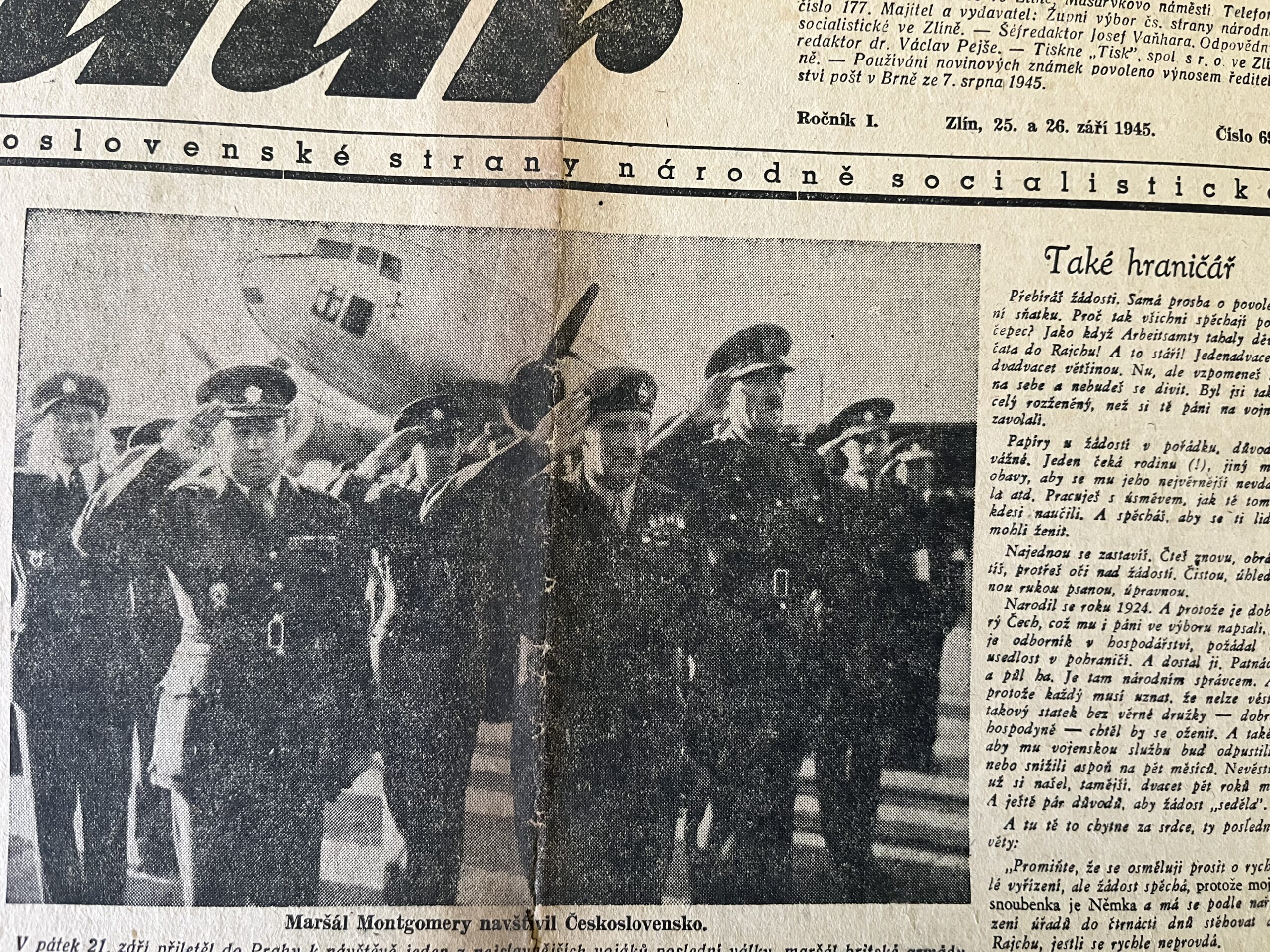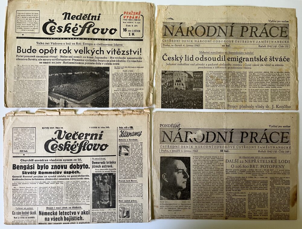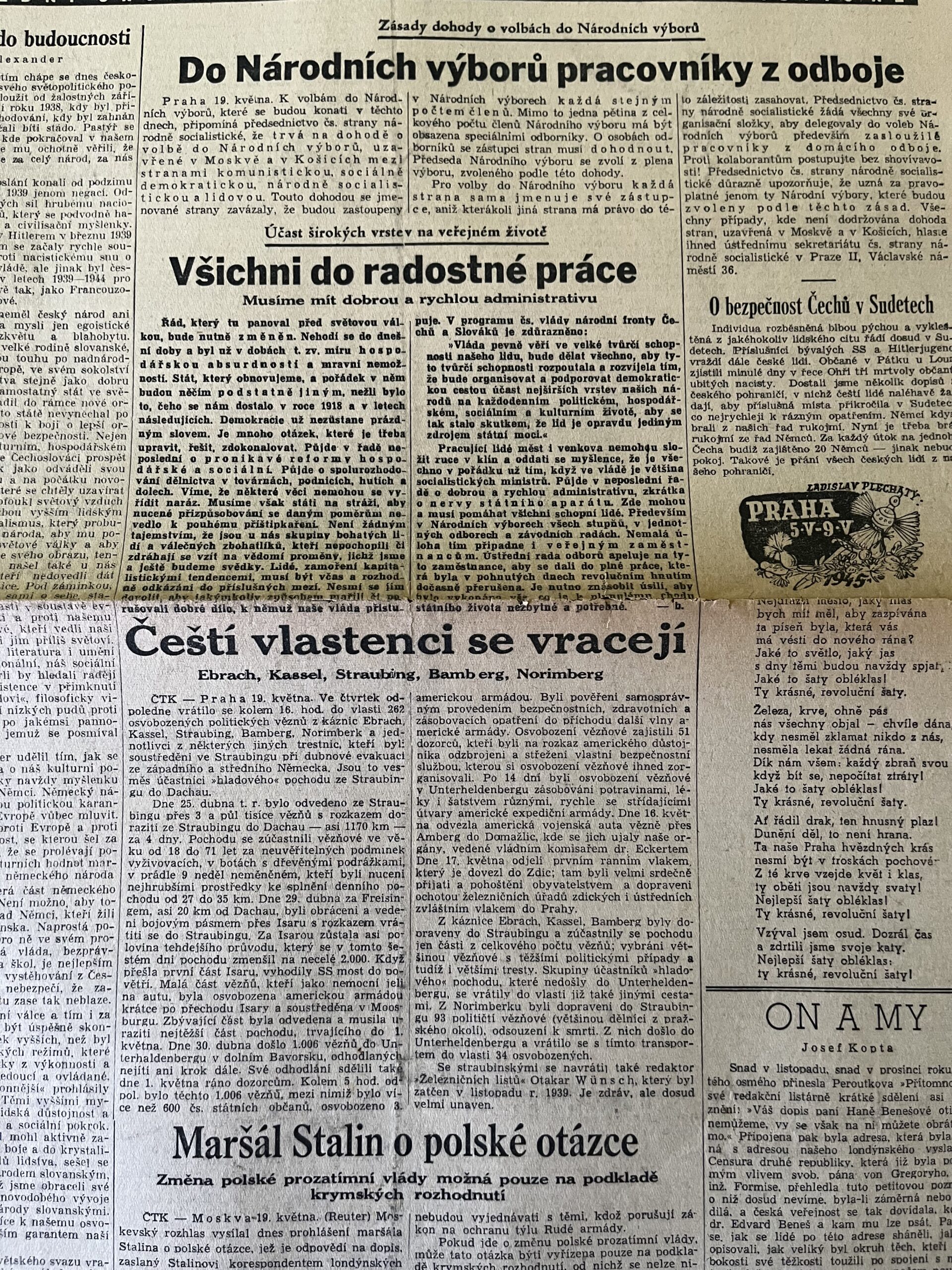 8 (K3-3) Svobodné Slovo,Zdar,Lidová demokracie. Rozměr jedné strany 32 x 47 cm. Celek novin obsahuje 5 x Svobodné Slovo 14.srpna 1945 – Vracejí se nejhrdinnější synové po šesti letech doma…aj., 4 strany. Svobodné Slovo 20.května 1945 – Do Národních výborů pracovníky z odboje. Všichni do radostné práce. Čeští vlastenci se vracejí…aj., 4 strany. Svobodné Slovo 19.května 1945 – Očista veřejného života pokračuje. Podniky musí sloužit národu…aj. 4 strany. Svobodné Slovo 19.srpna 1945 – Pracovní povinnost pro všechny. Český národ Rudé armádě…aj., 4 strany. Svobodné Slovo 22.srpna 1945 – Vrátili se jako vítězové. Okupace Japonska započne v neděli…aj., 4 strany. Večerní Svobodné Slovo 23.května 1945 – Na barikádách padlo 1632 Čechů…aj. 1 list. Lidová demokracie 21.srpna 1945 – Americké okupační síly do Japonska. Československé bratrstvo…aj. 4 strany. Svobodné noviny 28.června 1945 – Charta světové bezpečnosti podepsána. Všeslovanský den na Děvíně…aj. 4 strany. Zdar Zlín 25. a 26. září 1945 – Maršál Montgomery navštívil Československo. Baťova nemocnice zveřejněna…aj. 4 strany. Některé noviny jsou v přehybu poškozeny.