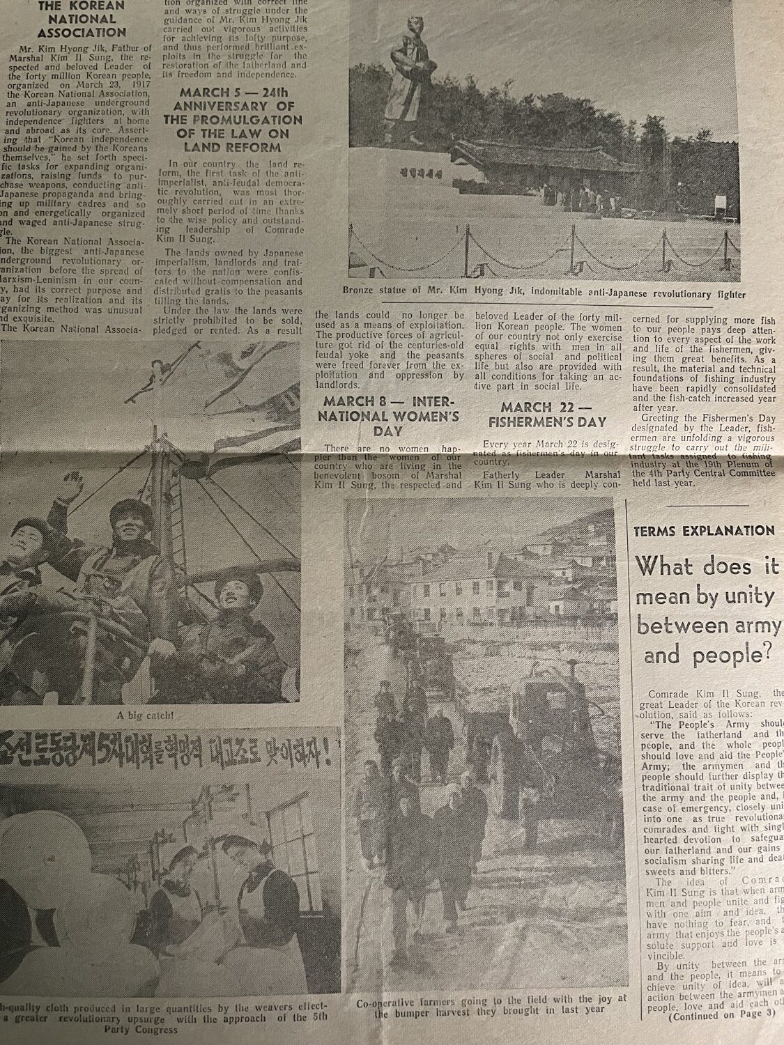 (hhj 9) Rozměr: 27 x 39 cm. Radio Pyongyang – ústřední vysílací výbor. Z obsahu: Snímek Soudruh Kim Ir-Sen na návštěvě dělníků Kangsonu dříve než kdokoli jiný ihned po osvobození. Hlavní programy v březnu. Snímek – Bronzová socha protijaponského revolučního bojovníka. Snímek – všude se staví vícepodlažní bytové domy ad. 4 strany, 7 snímků. Roh novin na stránkách utržený.