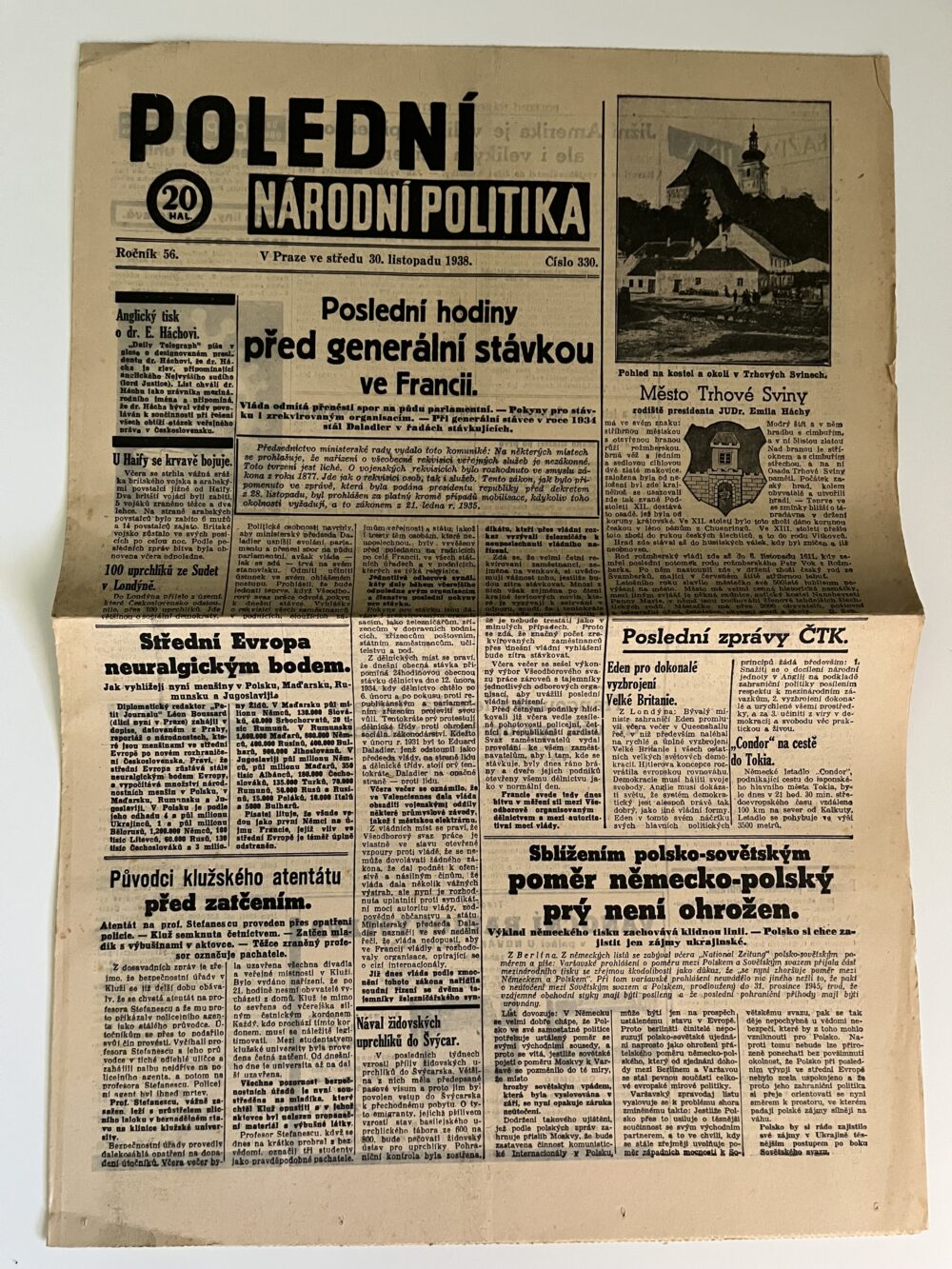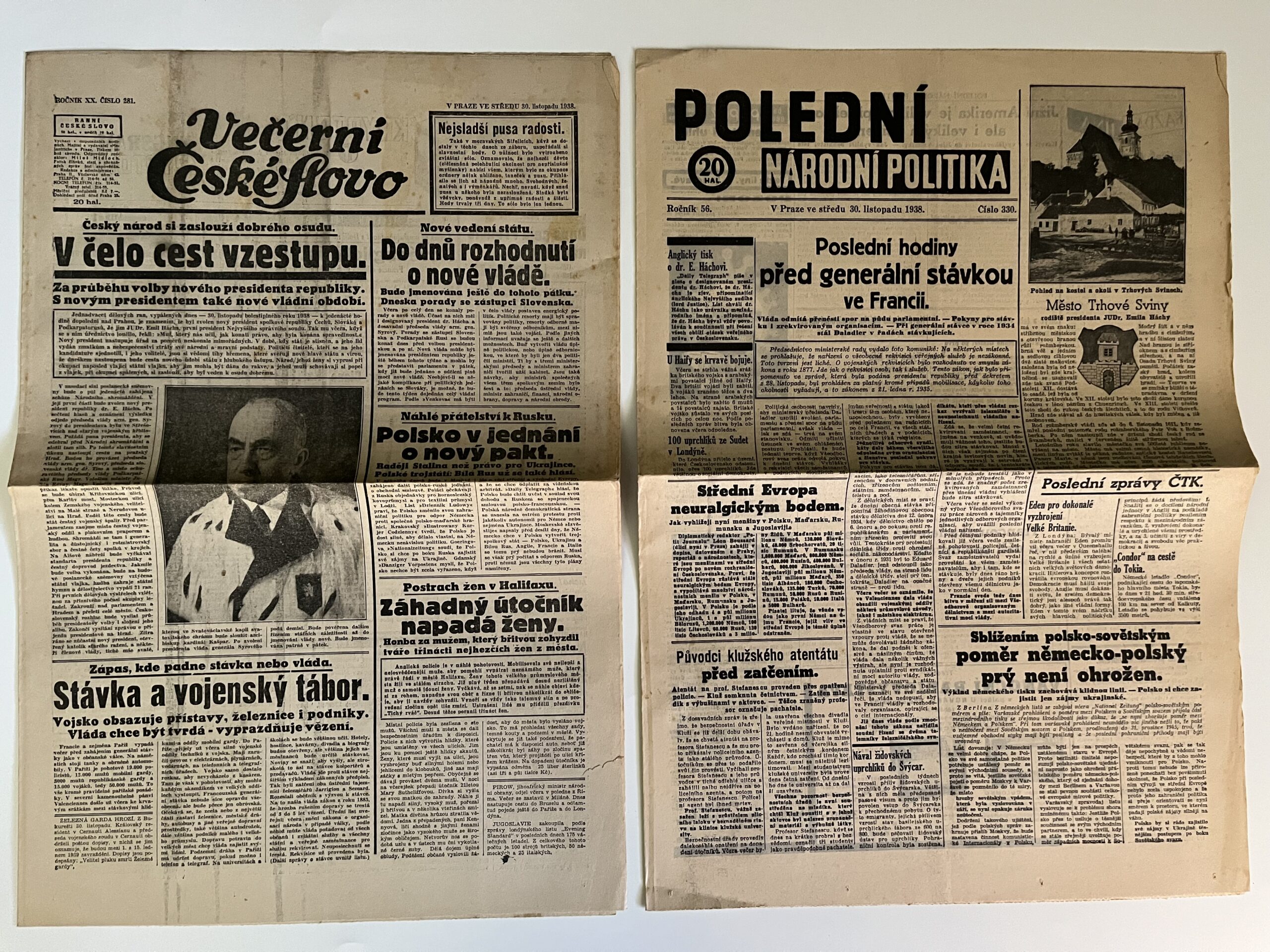 11 (K3-2) Rozměr 32 x 47 cm. Večerní Slovo 30.listopadu 1938 – Český národ si zaslouží dobrého osudu. Stávka a vojenský tábor. Postrach žen v Halifaxu. Nové vedení státu. Do dnů rozhodnutí o nové vládě. Polsko v jednání o nový pakt…ad. 6 stran. Polední národní politika 30.listopadu 1938 – Poslední hodiny před generální stávkou ve Francii. Anglický tisk o dr. E. Háchovi. 100 uprchlíků ze Sudet v Londýně. Město Trhové Sviny, pohled na kostel a okolí…ad. 6 stran.