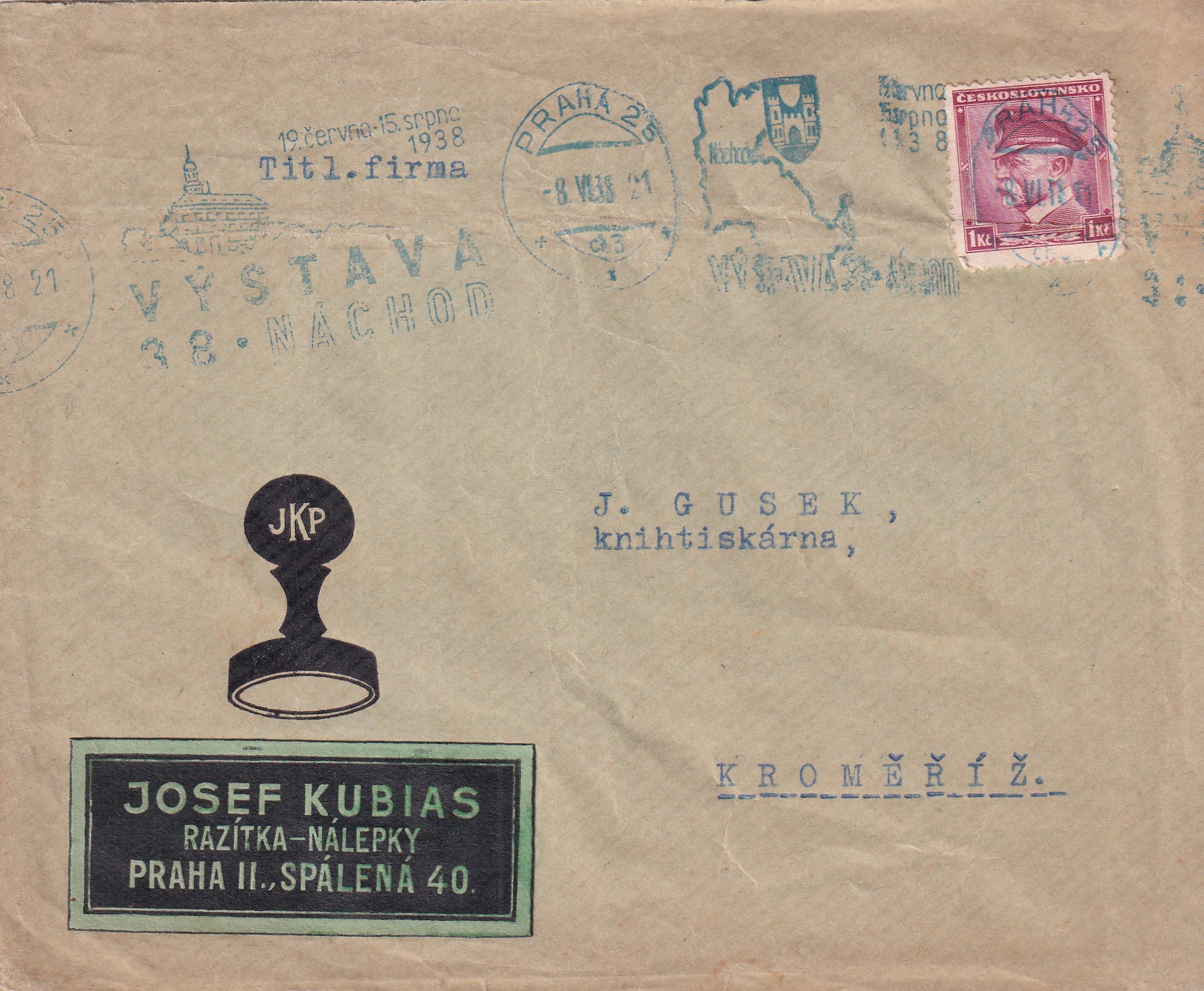 HomeObchodObálky a dopisniceObálka Josef Kubias Razítka – Nálepky Praha, rok 1938