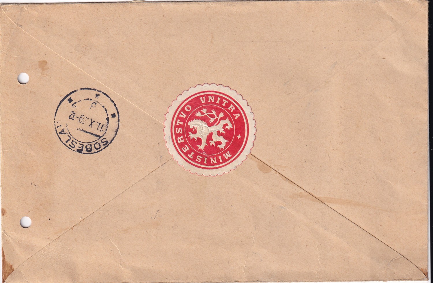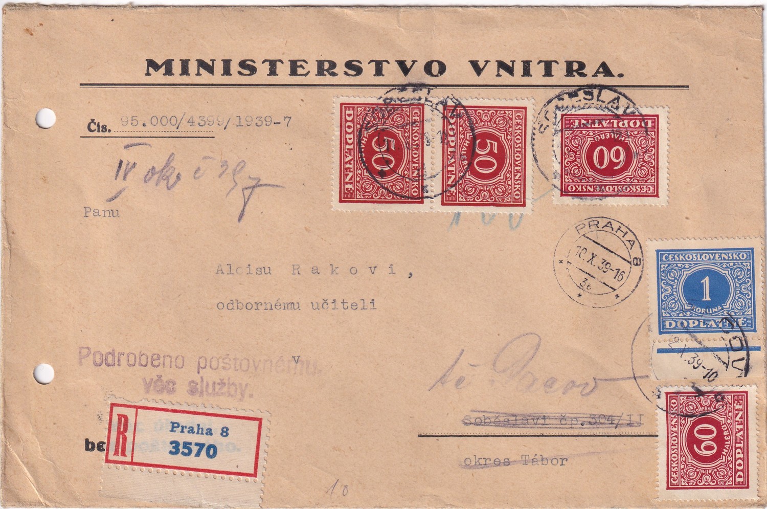 Obálka Ministerstvo vnitra, adresát Pacov  známky, zálepky r.1939 - Obrázek 2