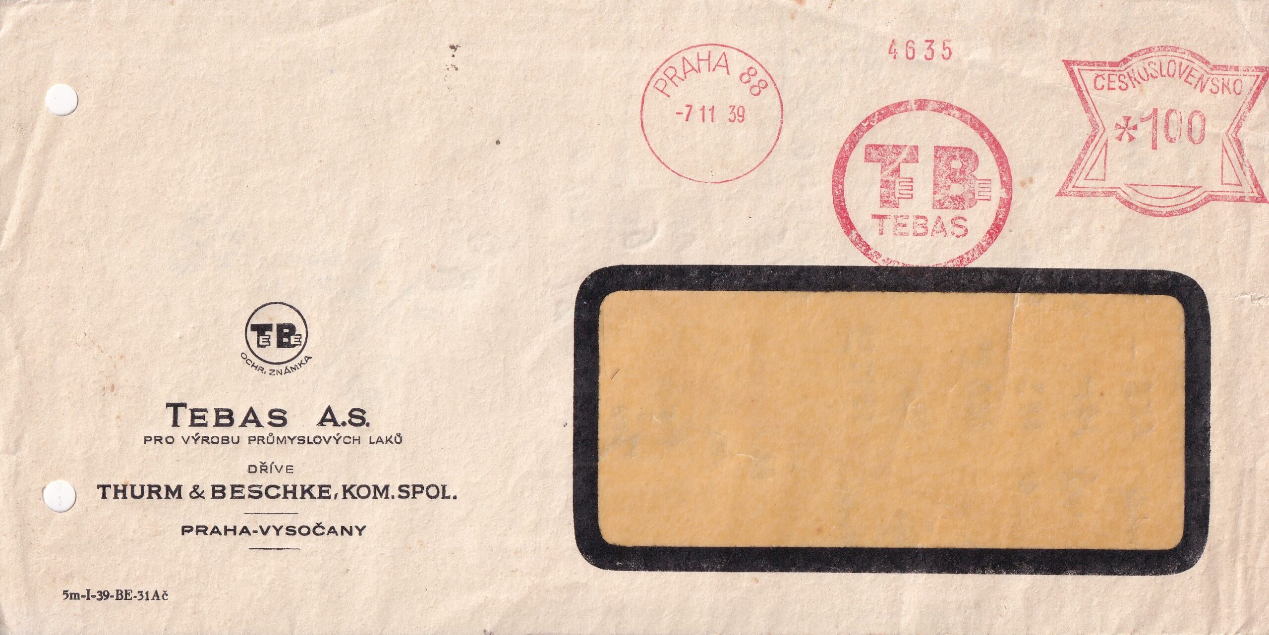 Obálka TEBAS a.s.pro výrobu průmyslových laků, rok 1939