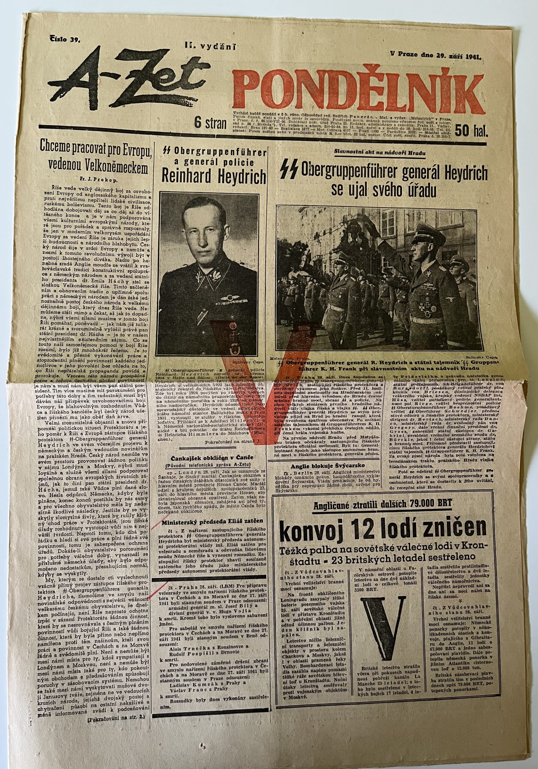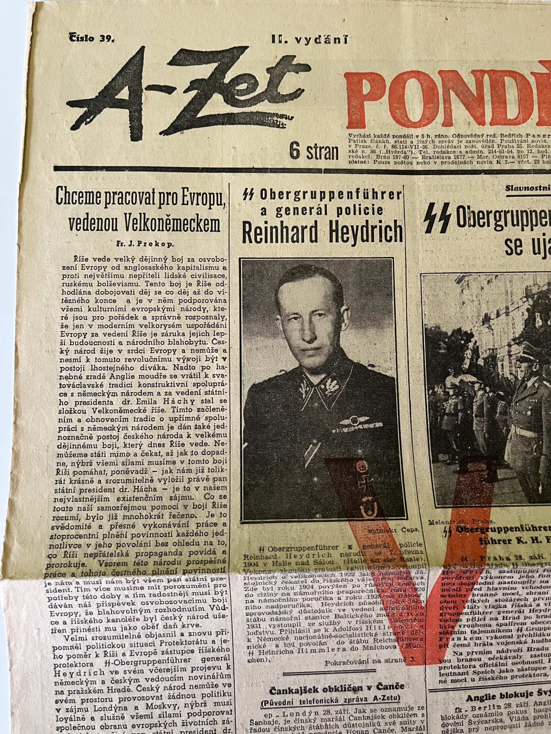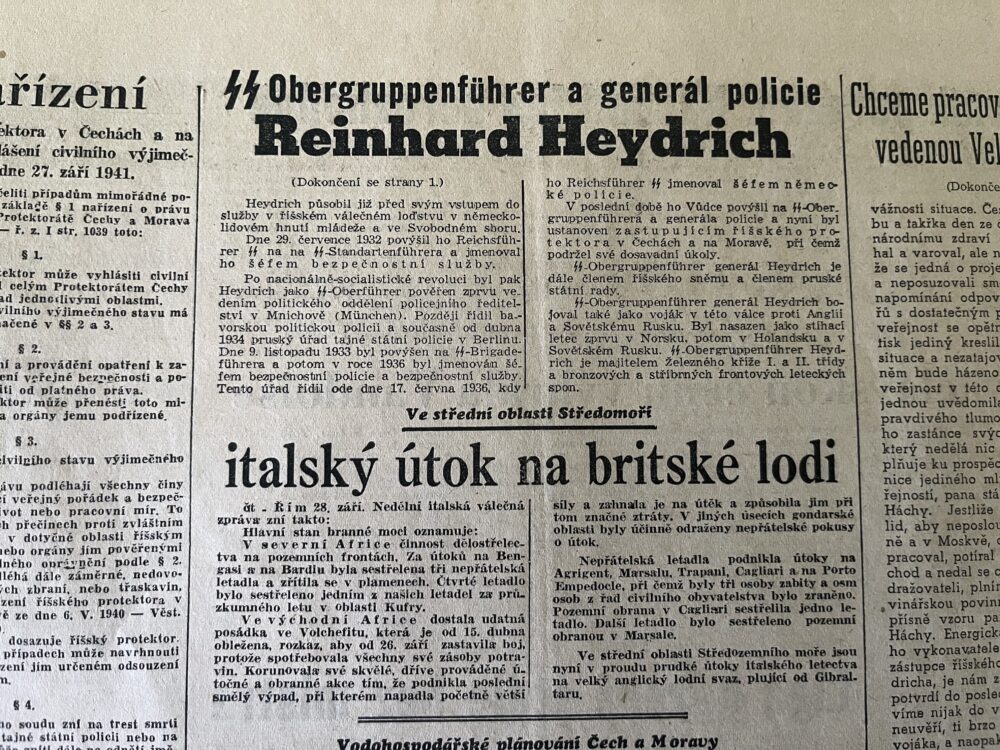 11 (K3-3) Rozměr jedné strany 32 x 47 cm. Noviny A – Zet Obergruppenführer a generál policie Reinhard Heydrich 29. září 1941. Obergruppenführer generál Reinhard Heydrich se ujal svého úřadu…aj. 6 stran.