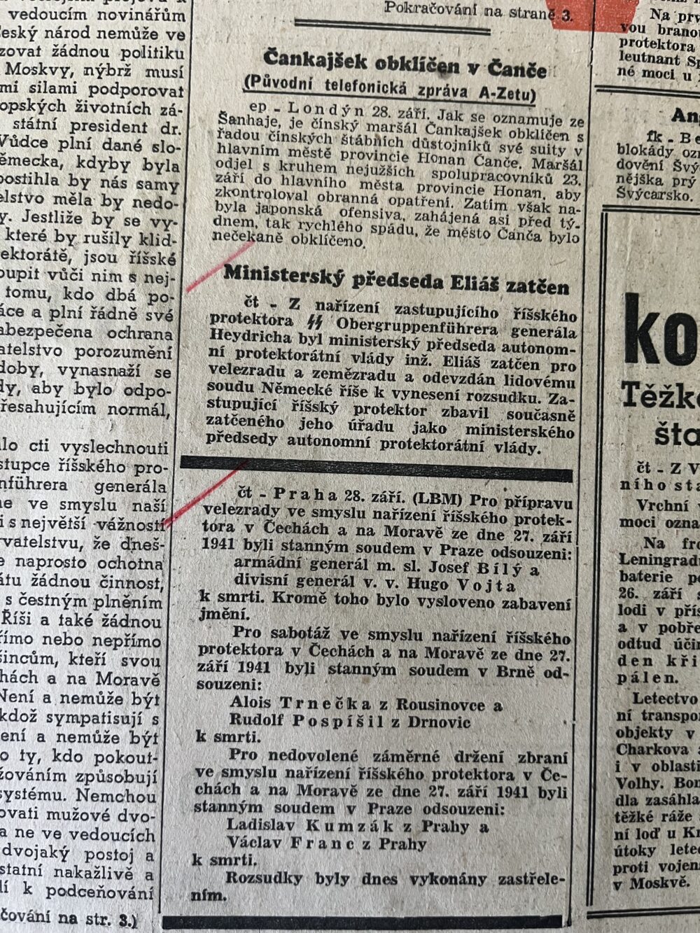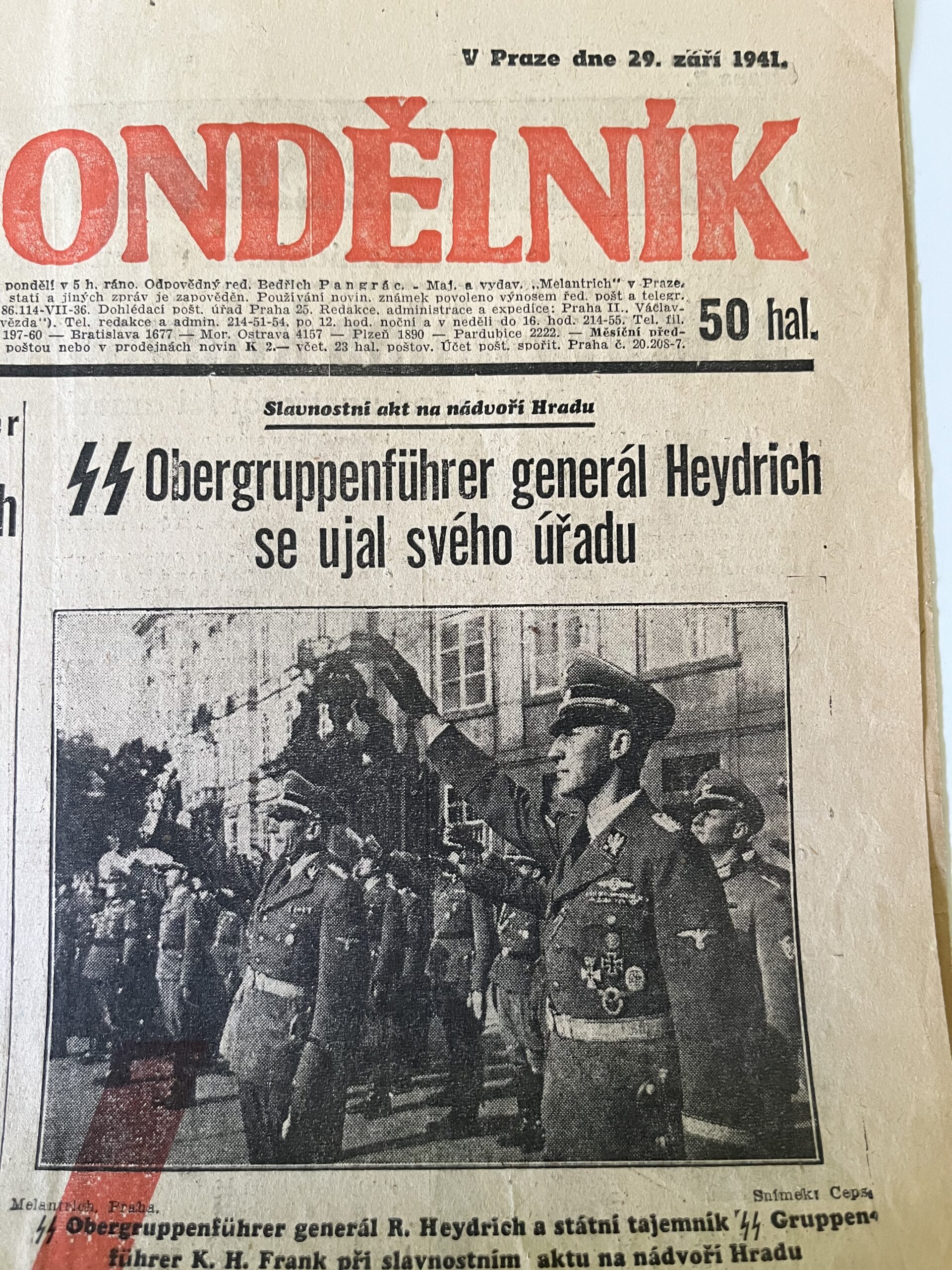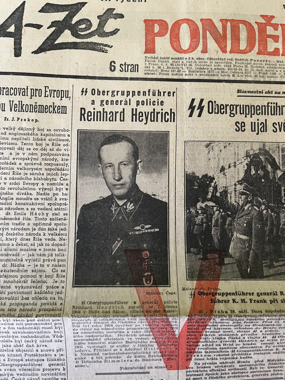 11 (K3-3) Rozměr jedné strany 32 x 47 cm. Noviny A – Zet Obergruppenführer a generál policie Reinhard Heydrich 29. září 1941. Obergruppenführer generál Reinhard Heydrich se ujal svého úřadu…aj. 6 stran.