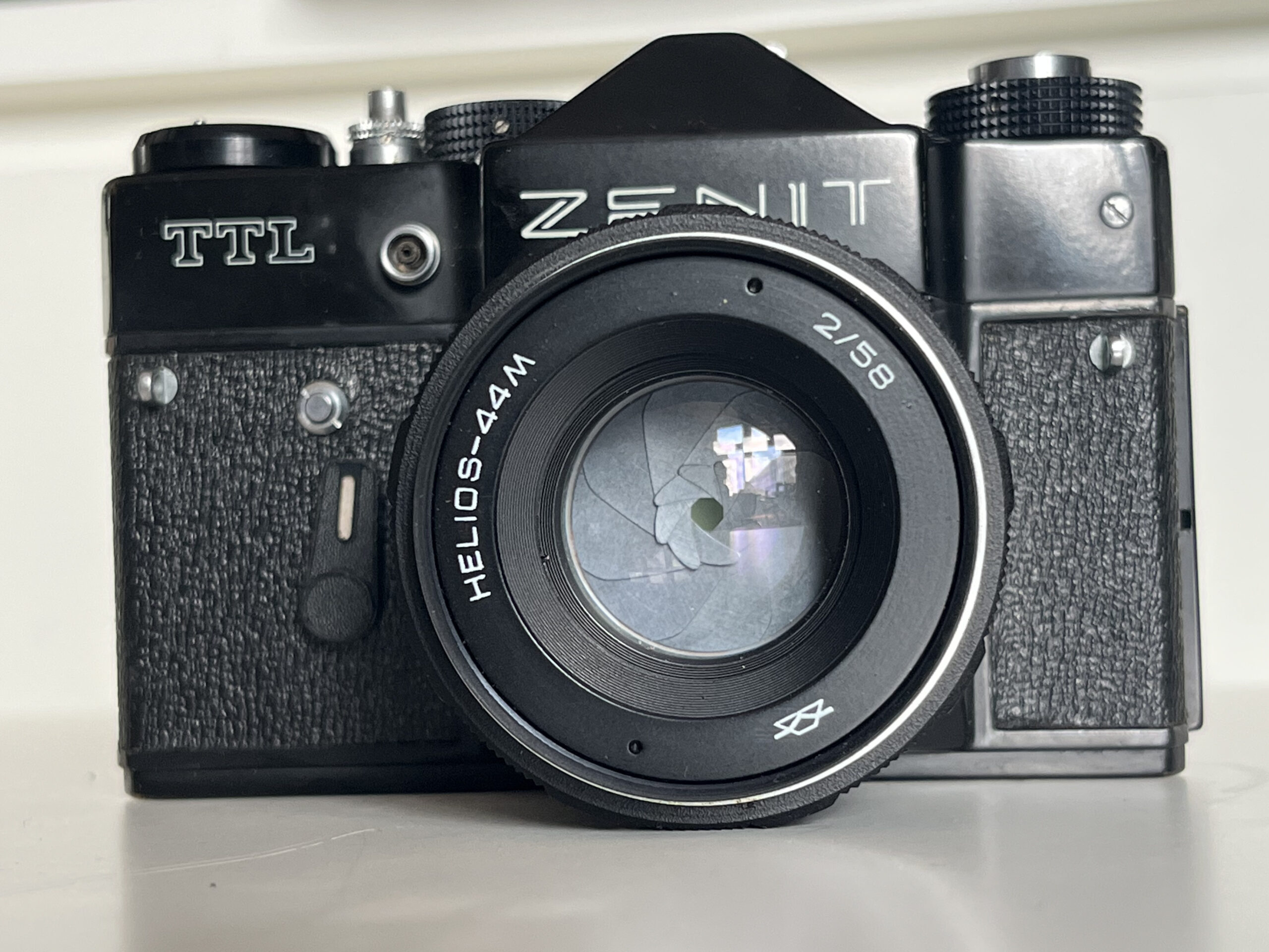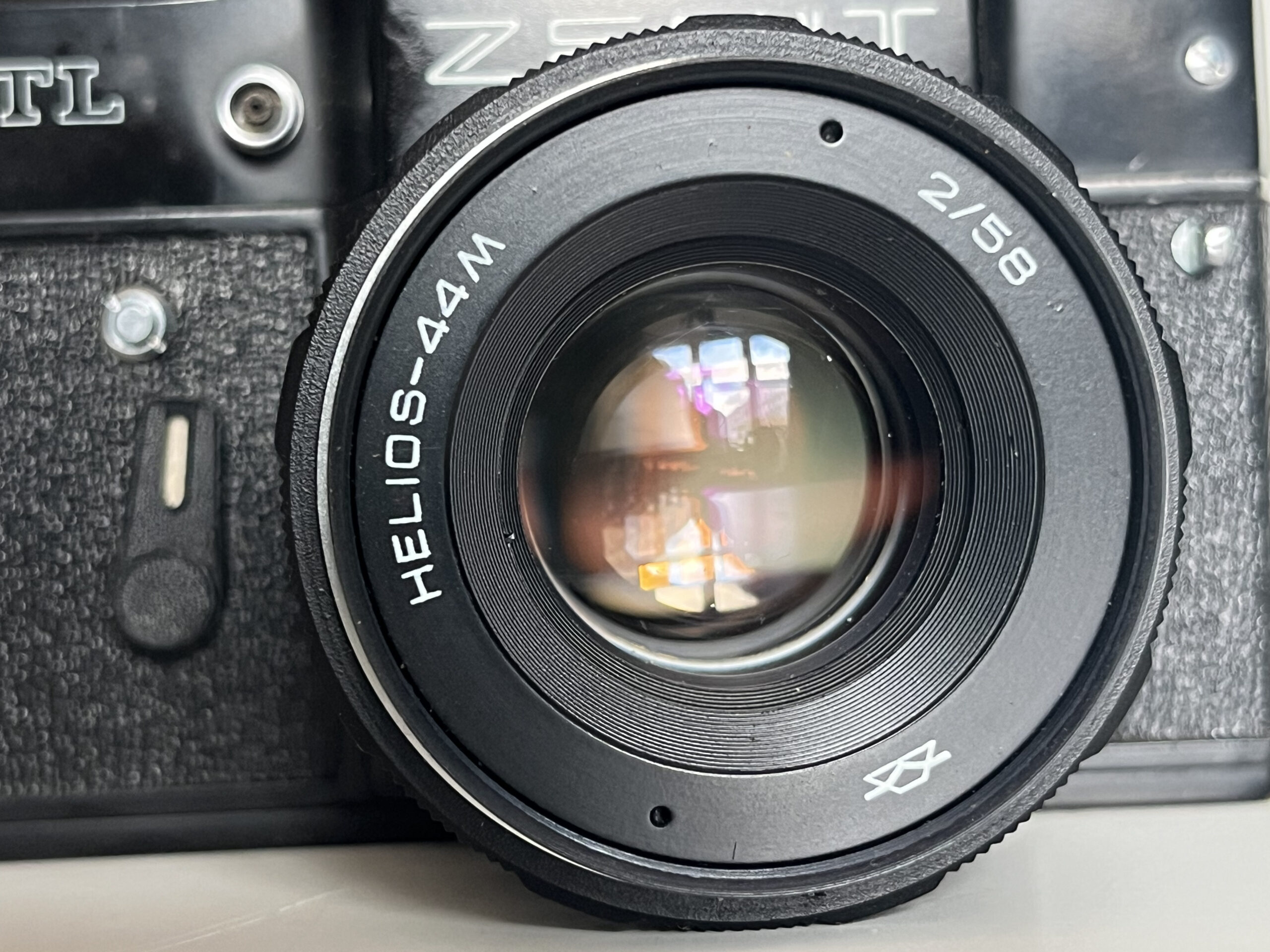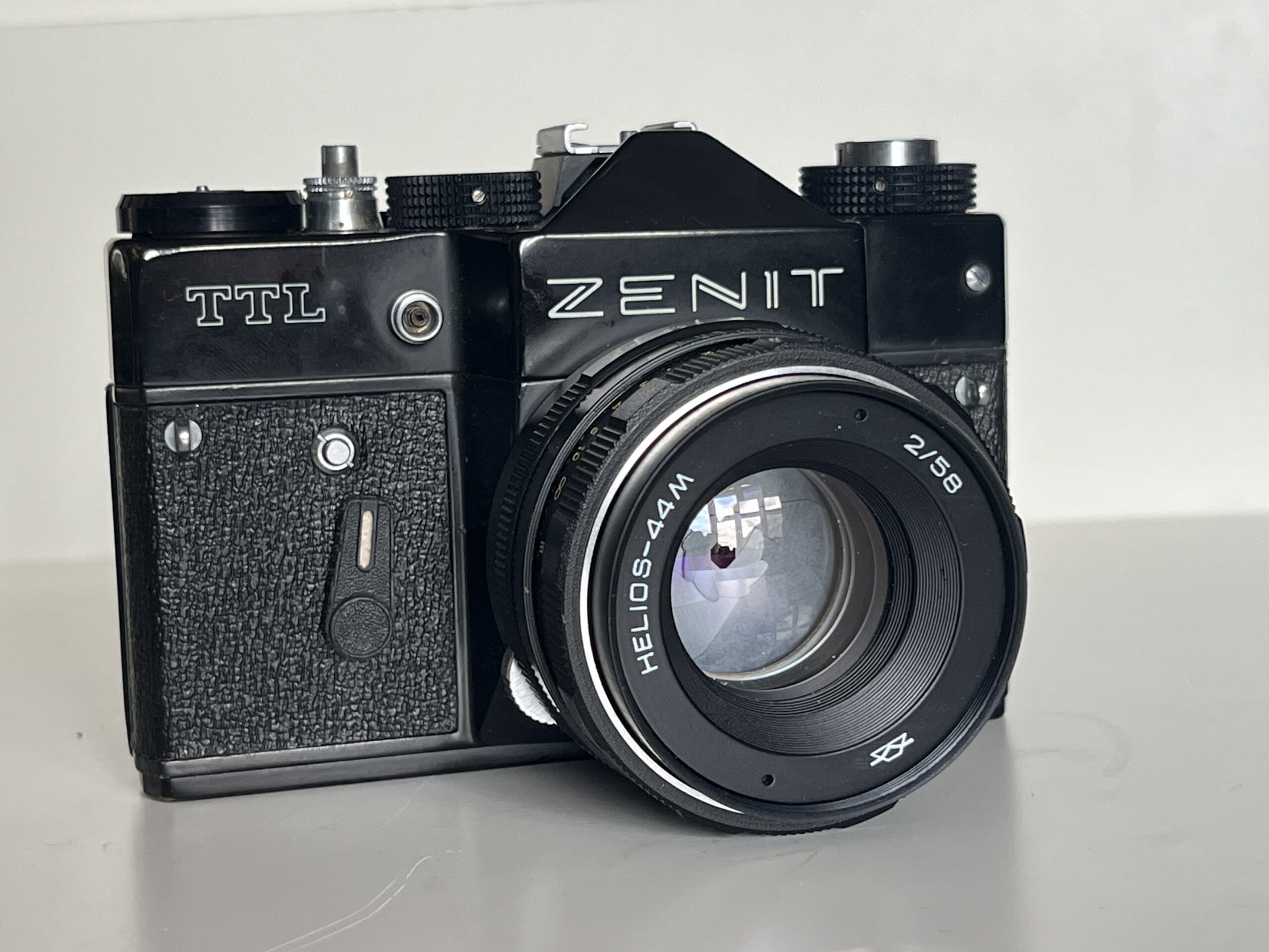 (F-3) Objektiv Helios 44M 58mm f2, závit M42, KMZ, tělo Zenit TTL na kinofilm, s originálním pouzdrem, nefunkční – nesklápí se zrcadlo