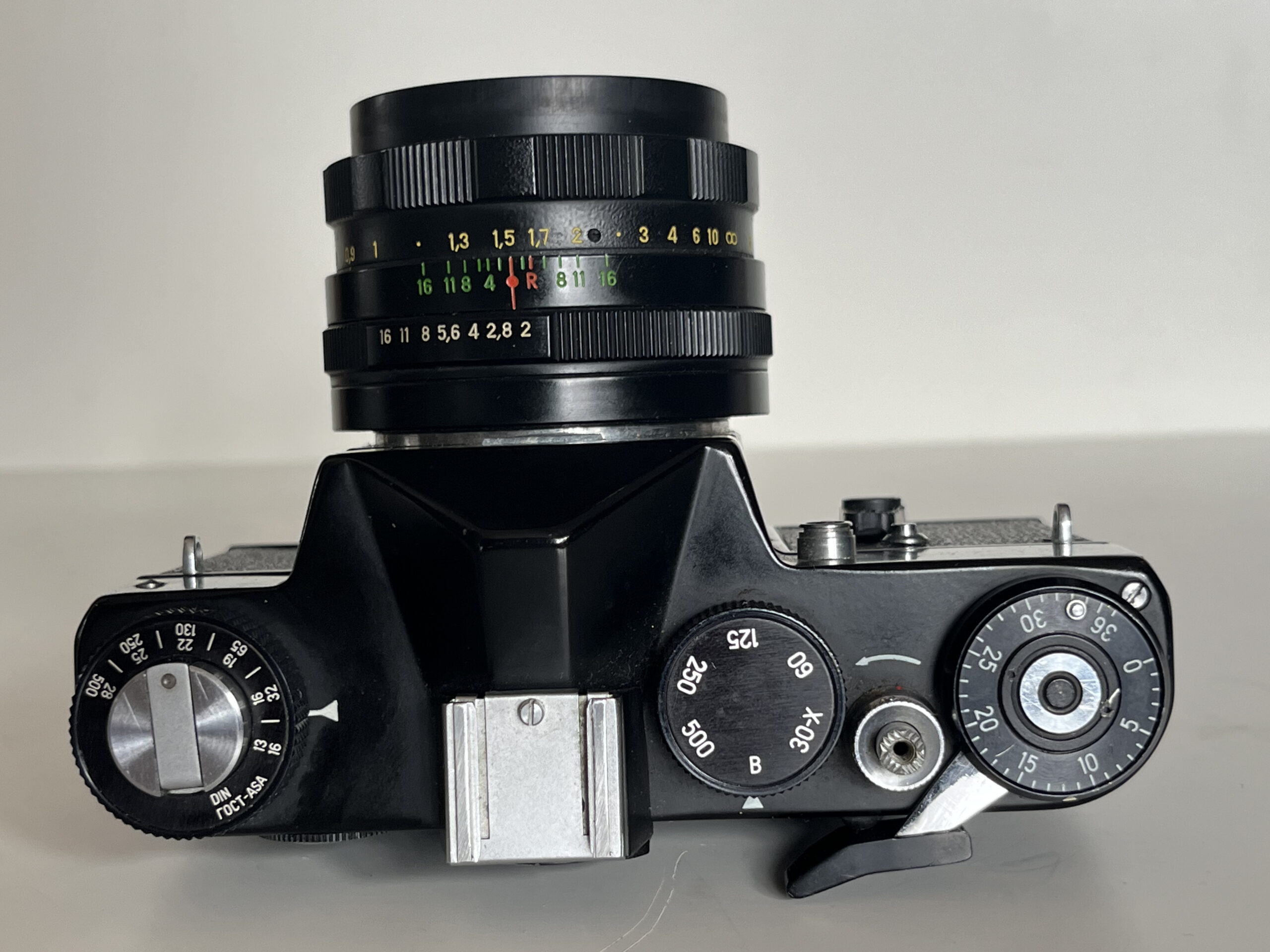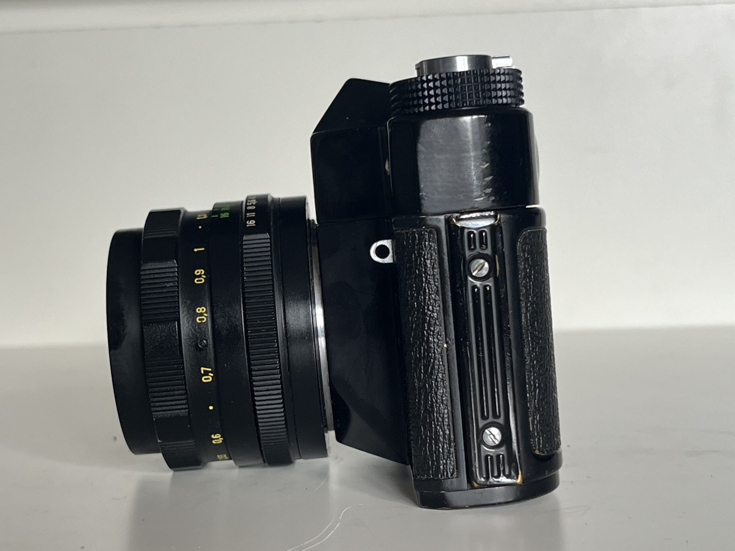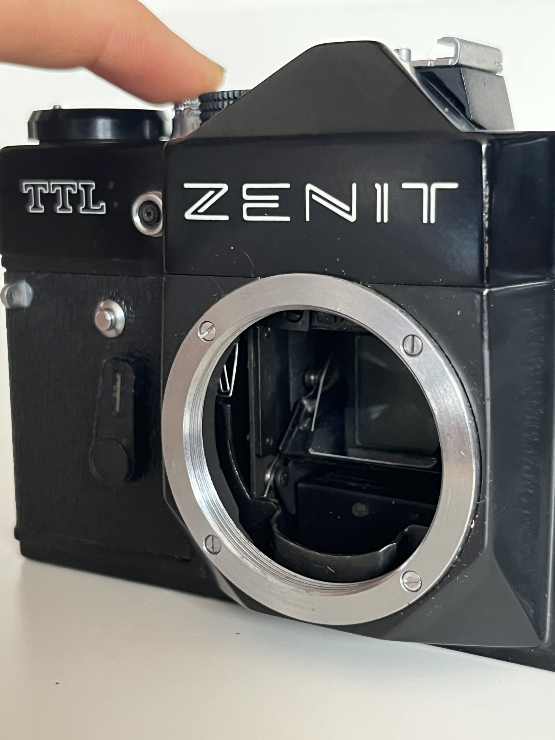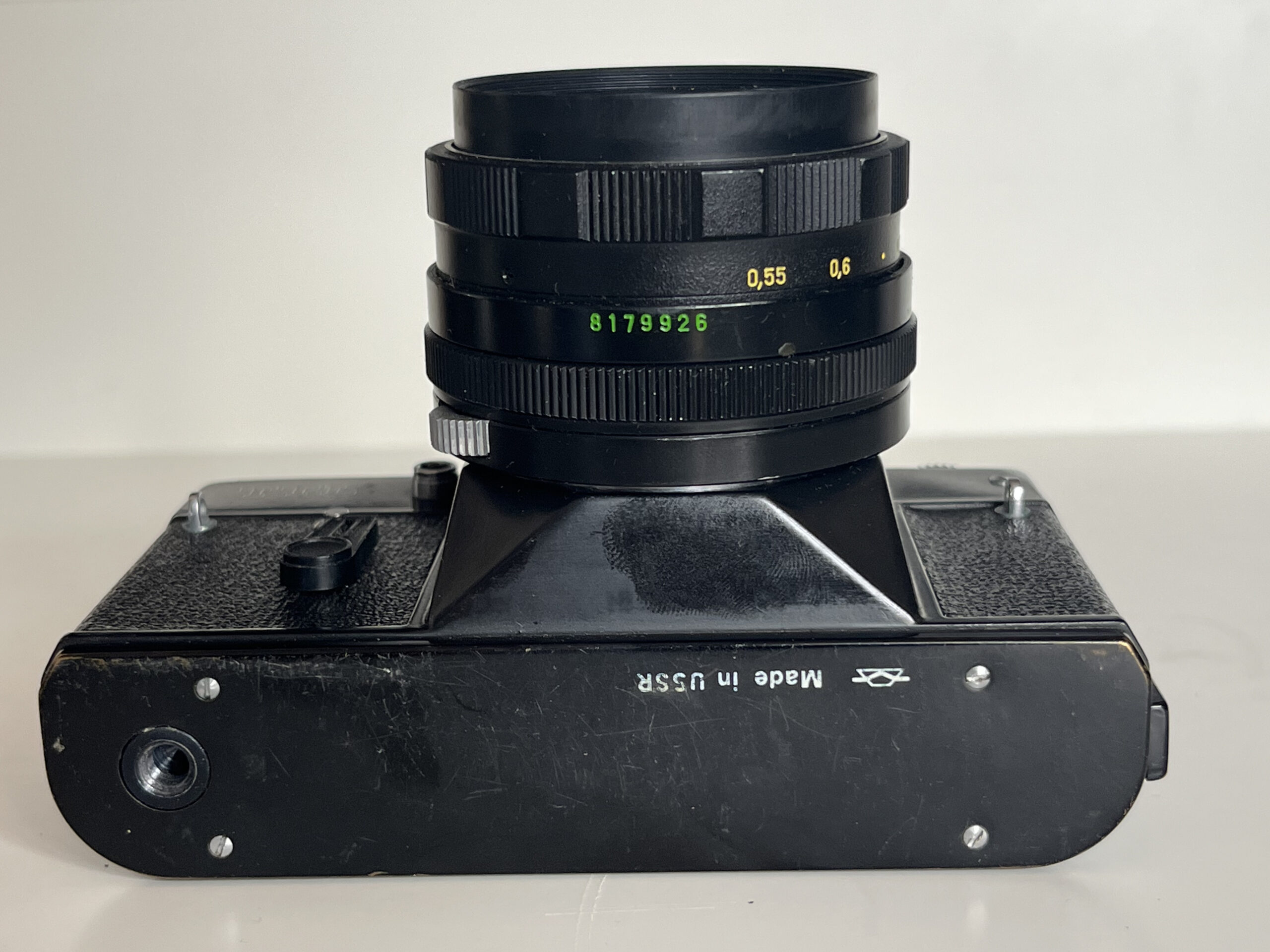 (F-3) Objektiv Helios 44M 58mm f2, závit M42, KMZ, tělo Zenit TTL na kinofilm, s originálním pouzdrem, nefunkční – nesklápí se zrcadlo