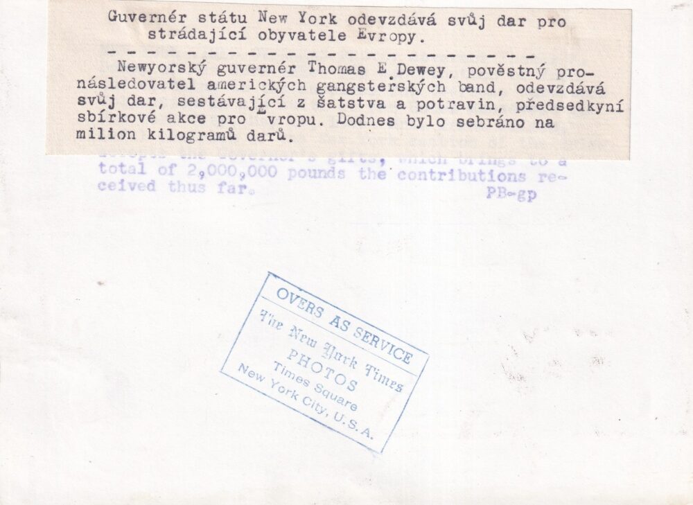 32 (hhd) Rozměr 17,5 x 13 cm. Fotografie s popisem a orig.razítkem. Guvernér státu New York odevzdává svůj dar pro strádající obyvatele Evropy. Foto Times Square New York City, U.S.A.