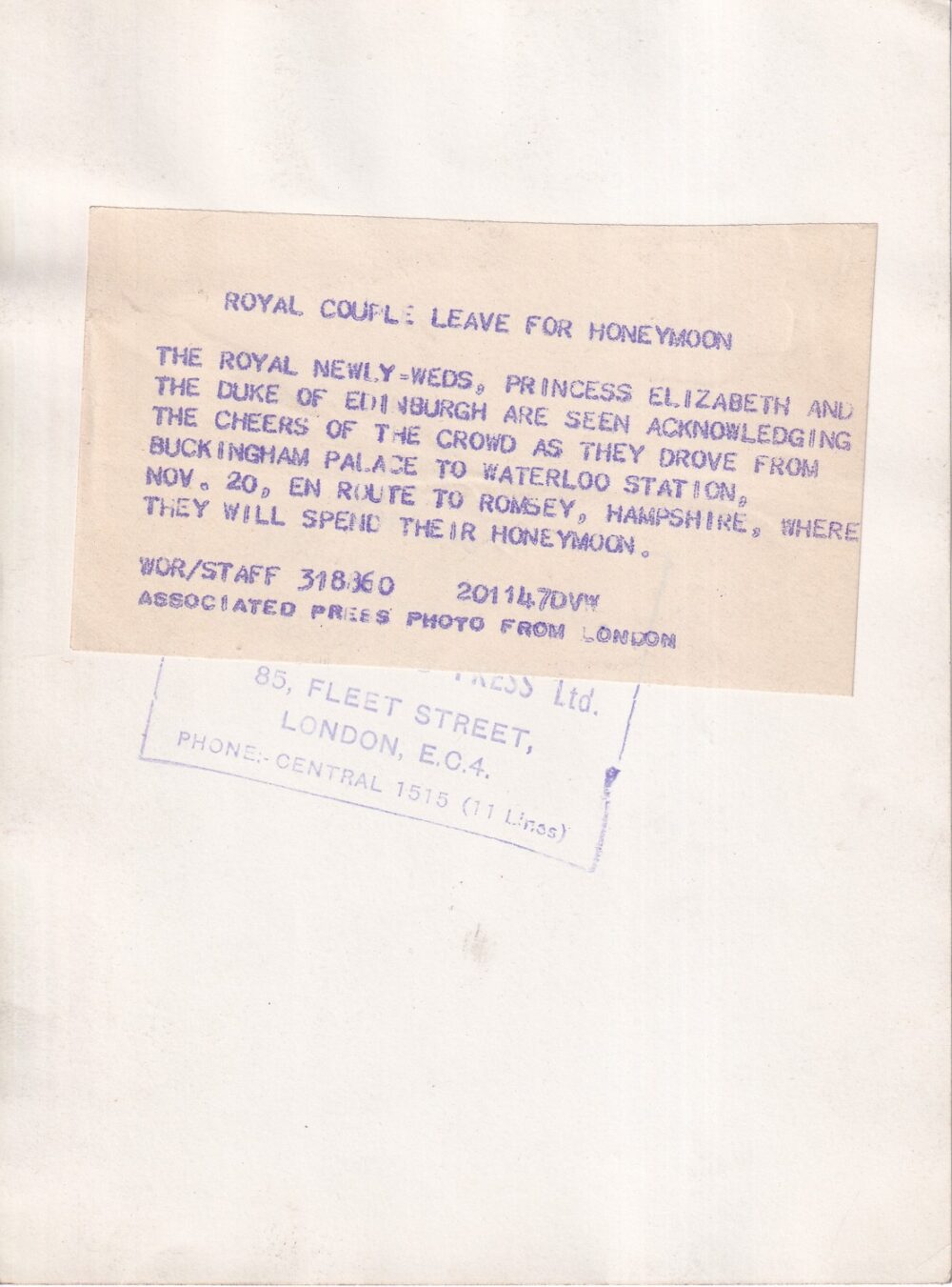 33 (hhd) Rozměr 15 x 20,5 cm. Fotografie s popisem a orig.razítkem. Královský pár odjíždí na líbánky. Foto Londýn