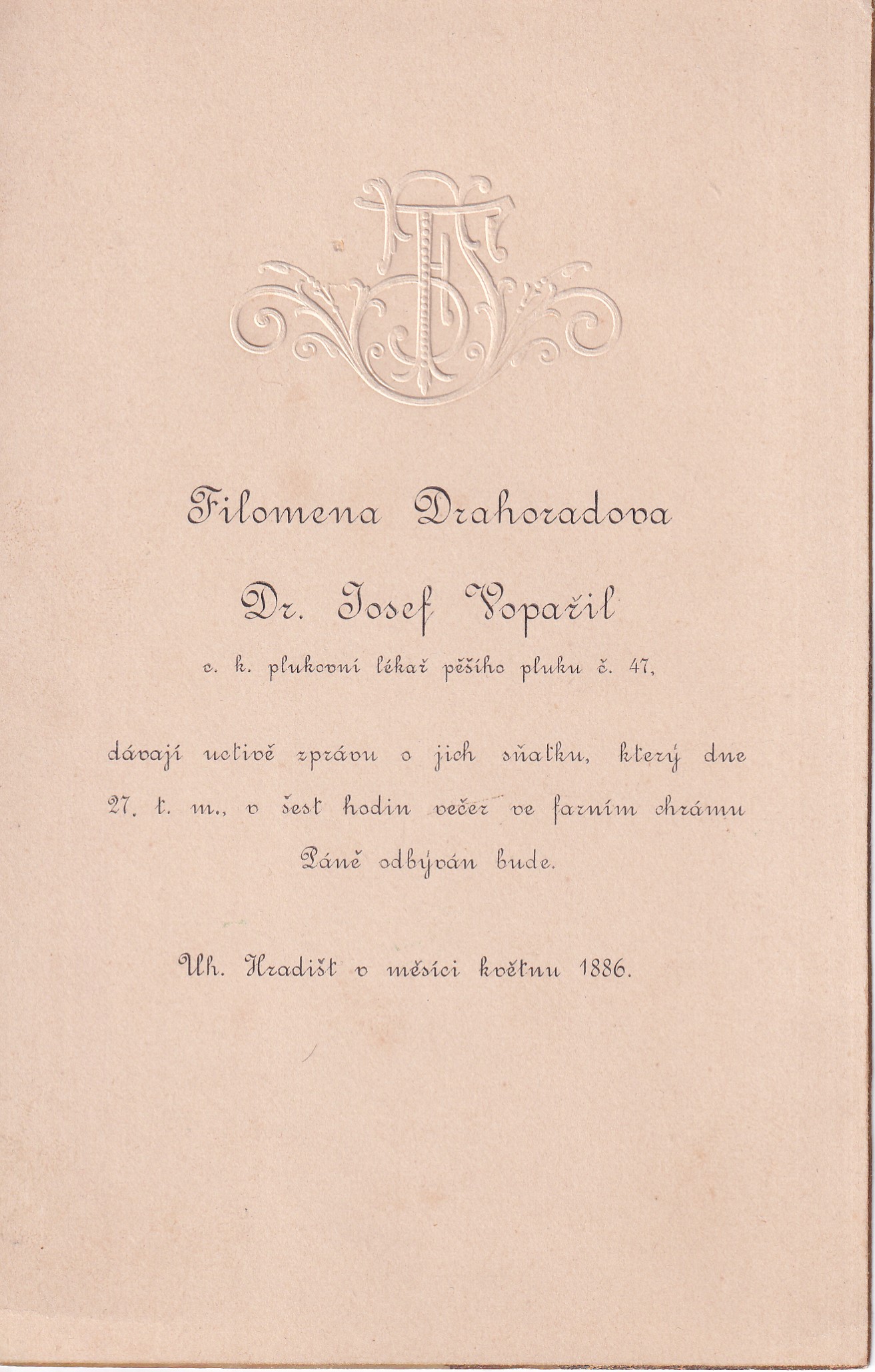 4 (K3-1) Rozměr 11,5 x 17,5 cm tvrdý kartonový papír béžové barvy s lemem zlaté barvy. Oznámení sňatku Filomena Drahoradova a Dr. Josef Vopařil c.k.plukovní lékař pěšího pluku č.47 Uherské Hradiště 27.května 1886