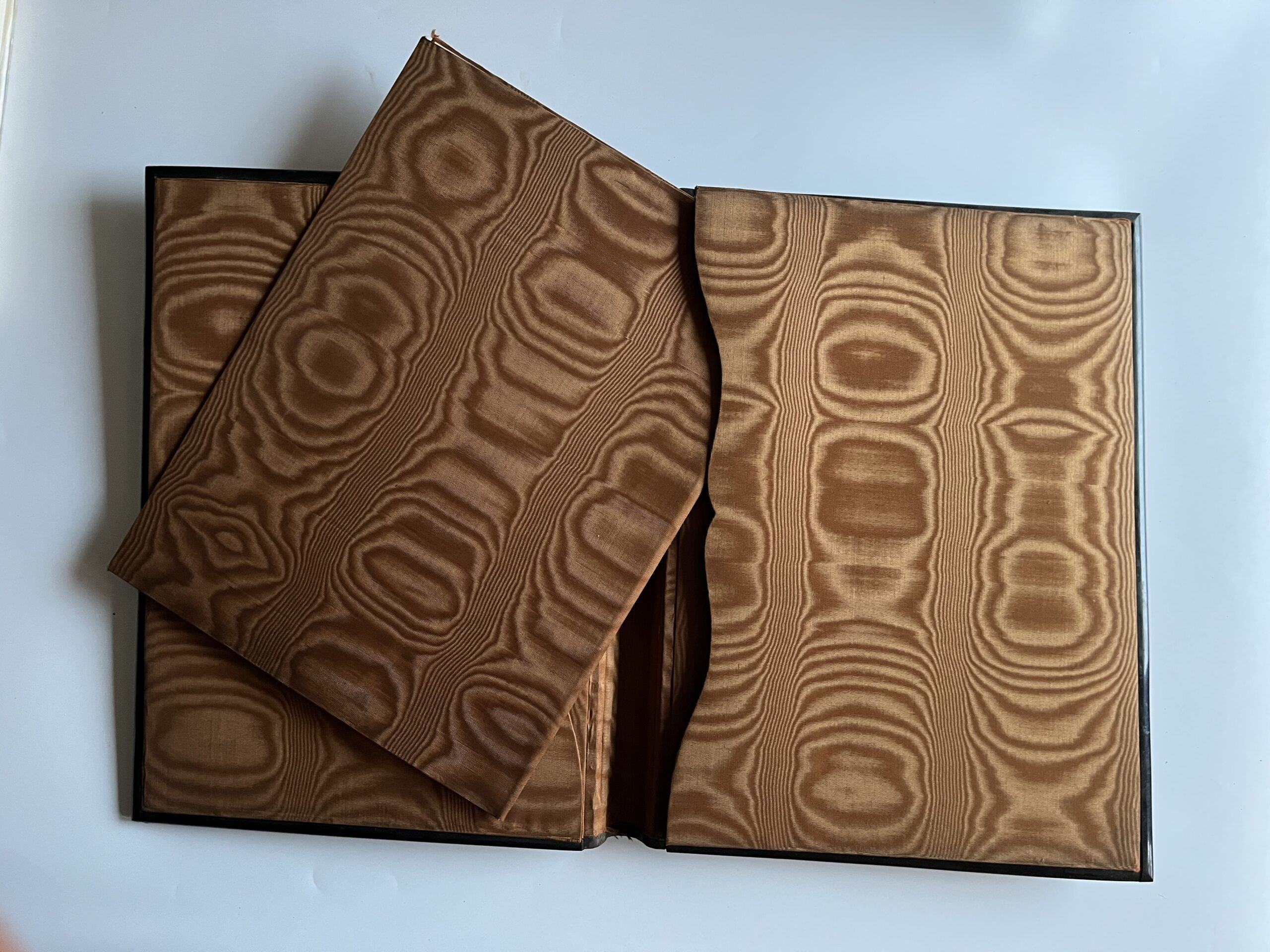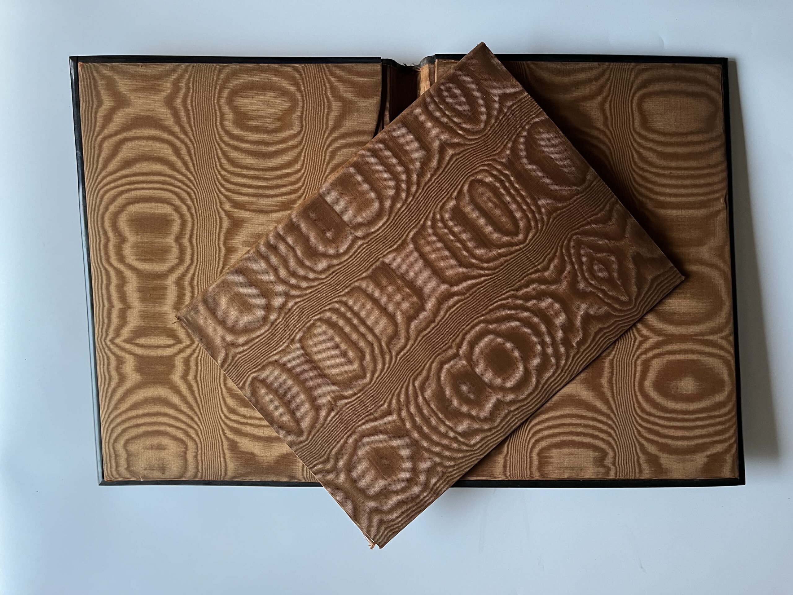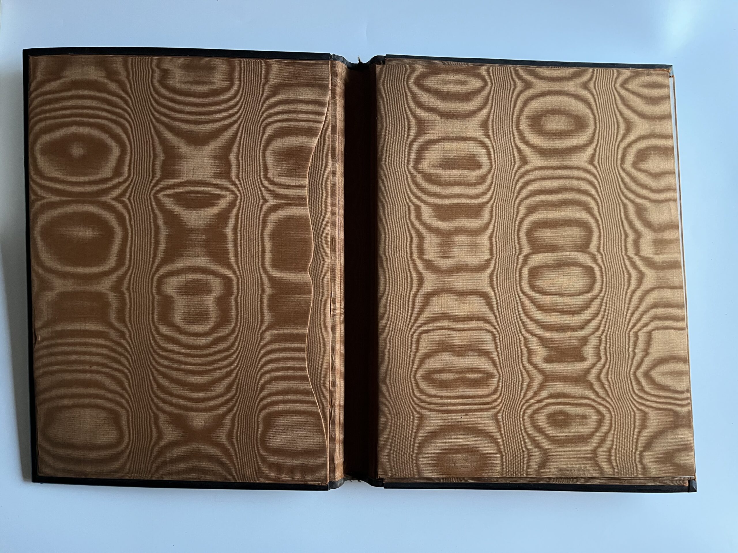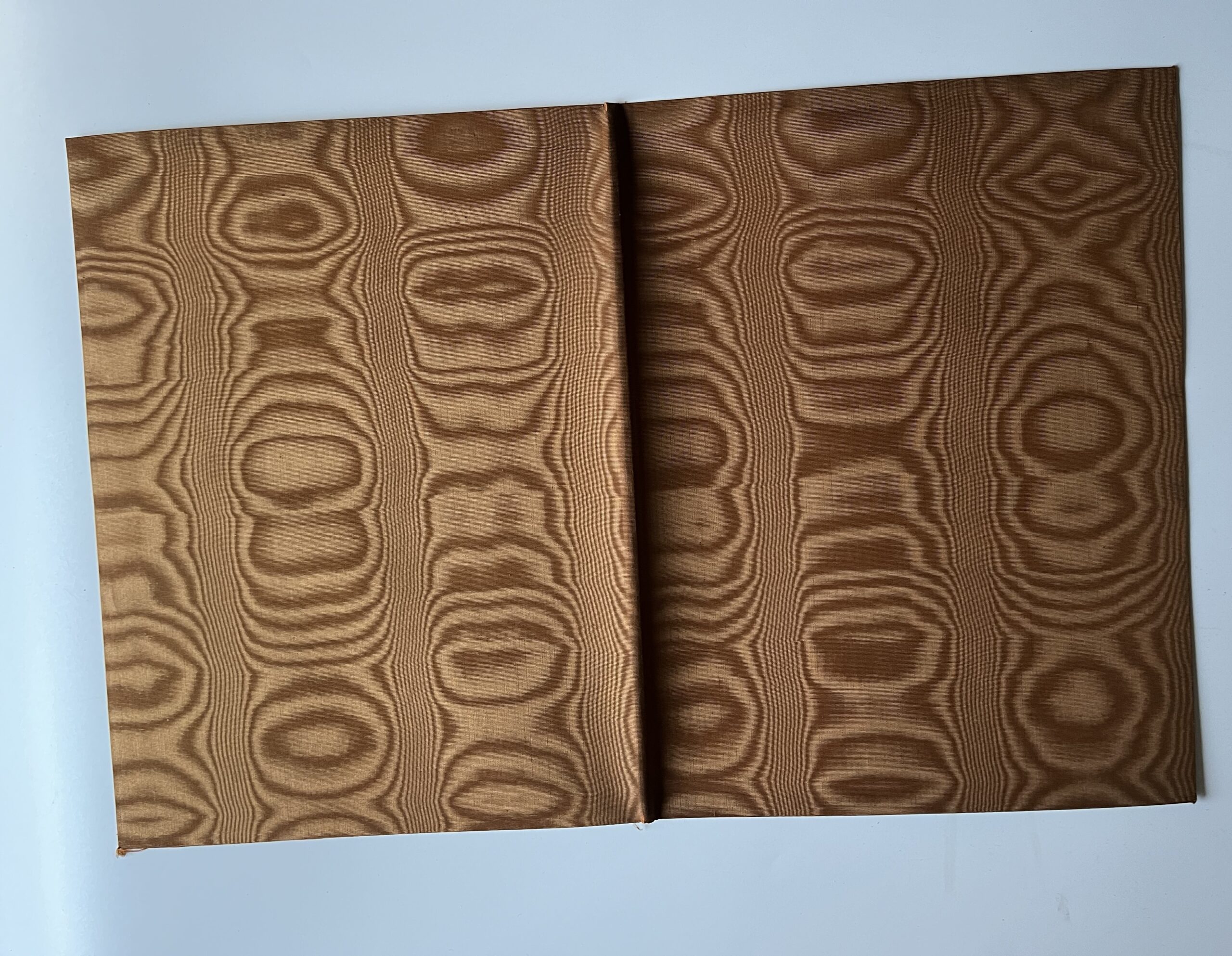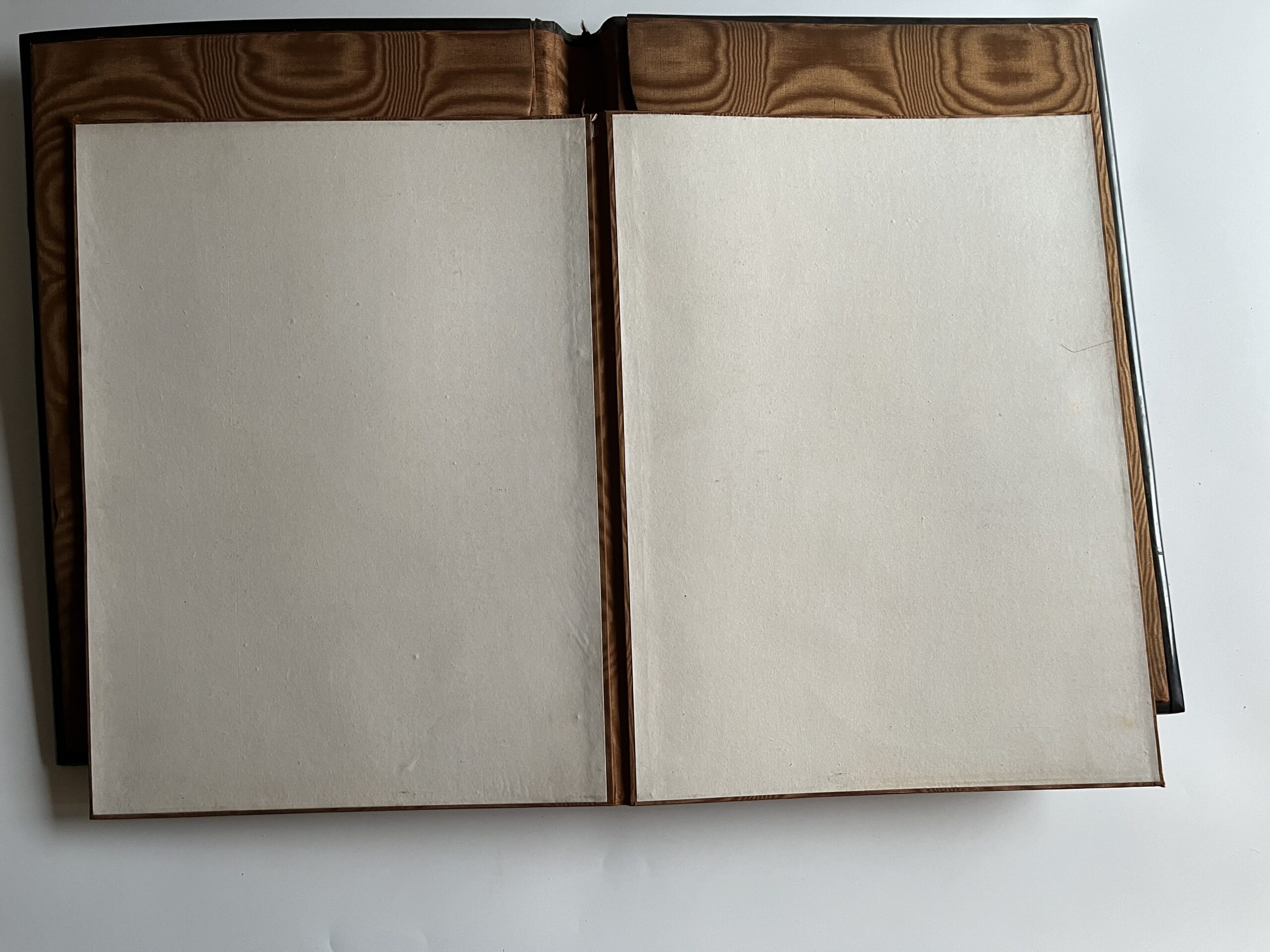 (JJB-23) Desky s vnitřními kapsami jsou polepené lesklou hnědou látkou. Uvnitř jsou vloženy papírové desky také polepené s látkou stejného materiálu. Rozměr 27 x 35 cm, desky jsou zkroucené, hřbet odlepený.