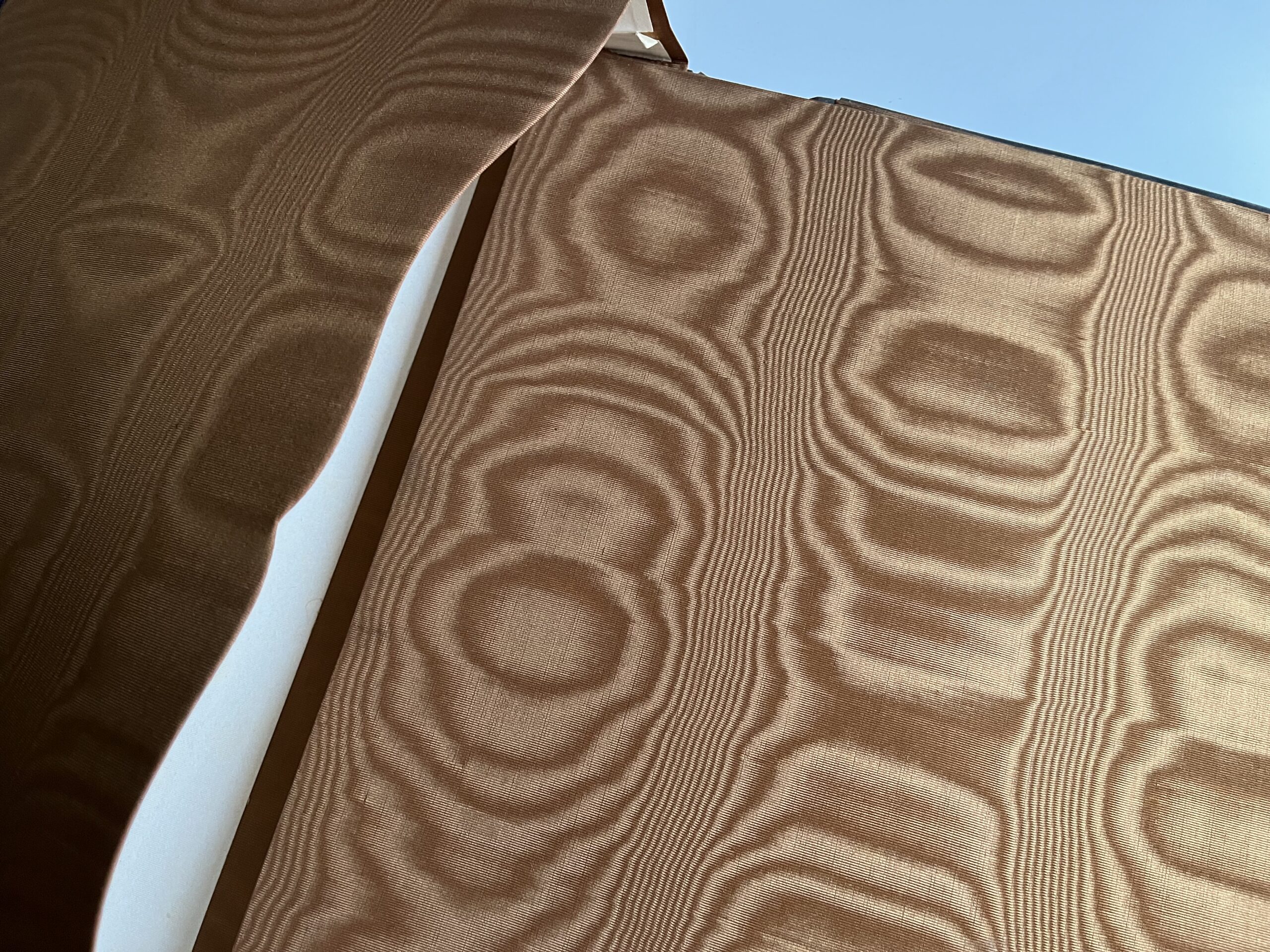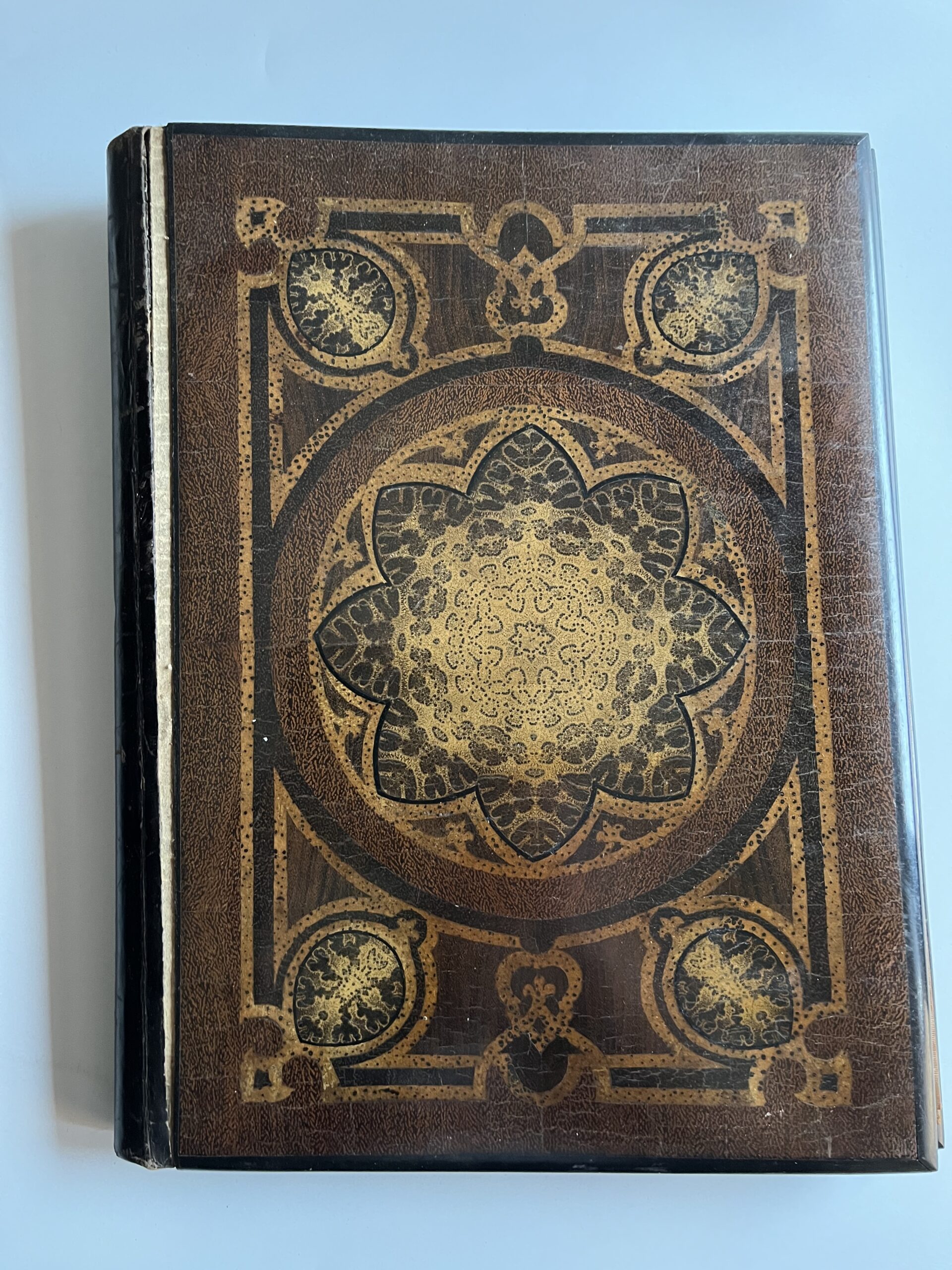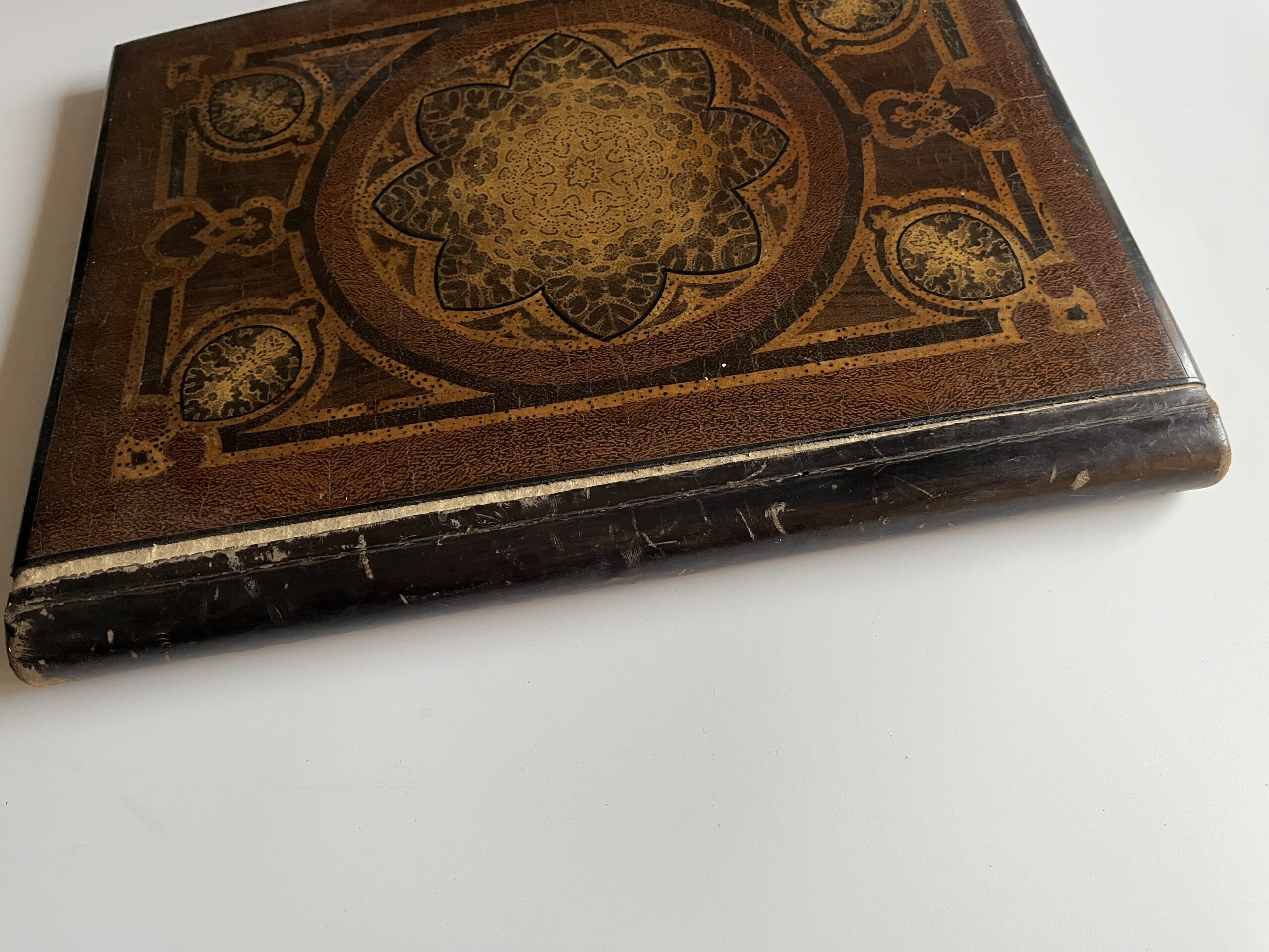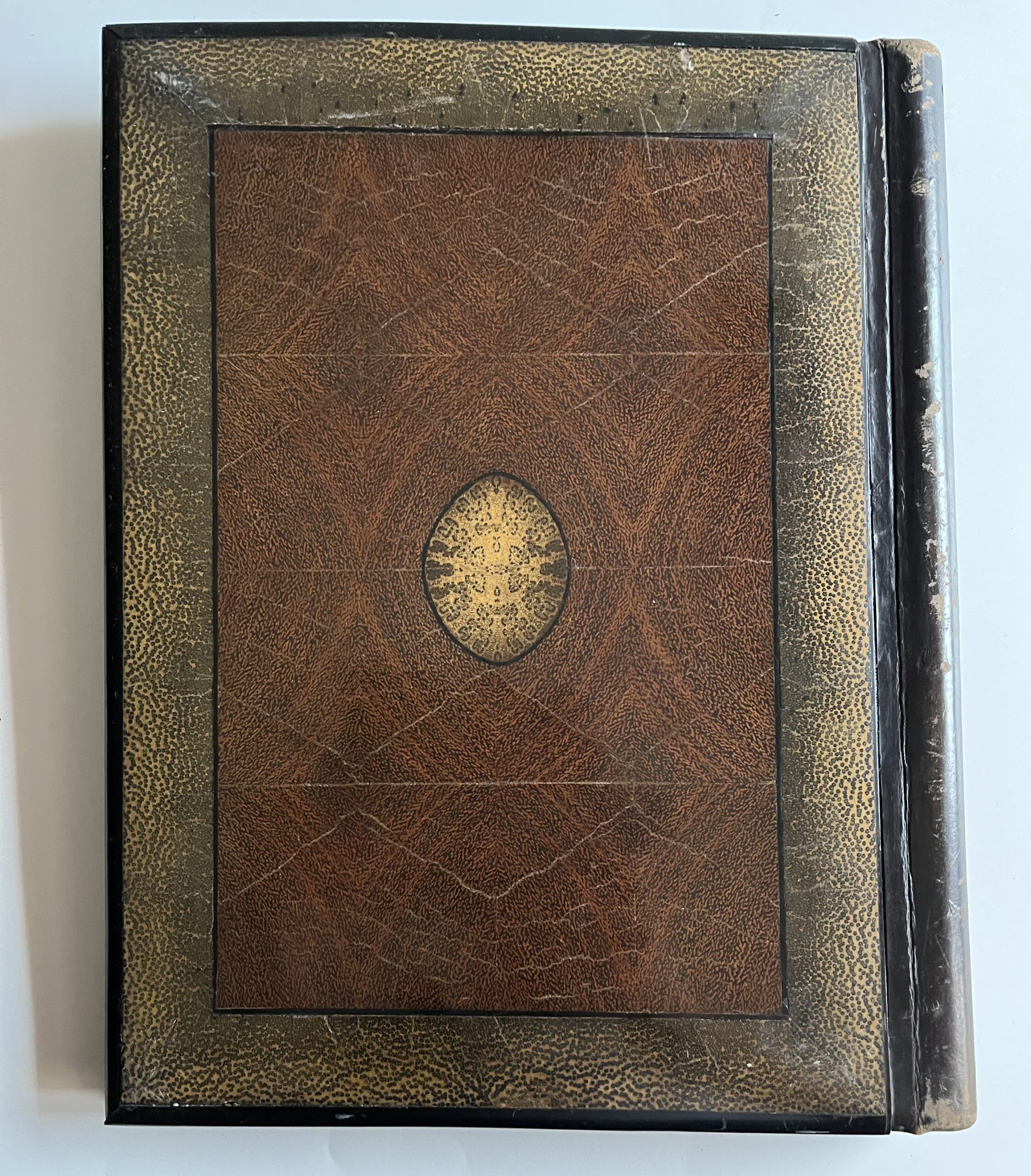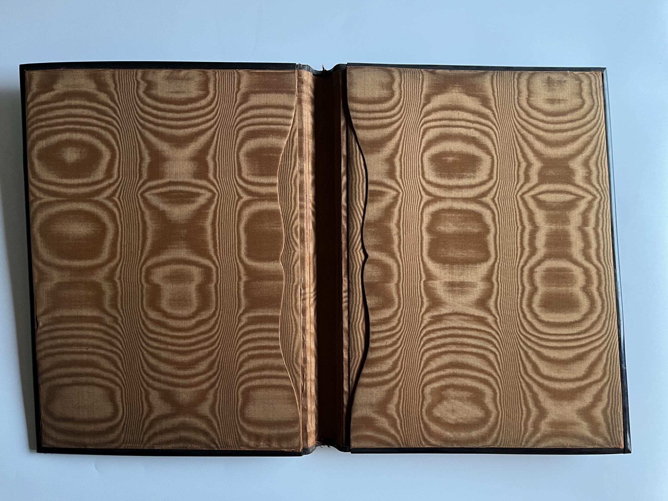 (JJB-23) Desky s vnitřními kapsami jsou polepené lesklou hnědou látkou. Uvnitř jsou vloženy papírové desky také polepené s látkou stejného materiálu. Rozměr 27 x 35 cm, desky jsou zkroucené, hřbet odlepený.