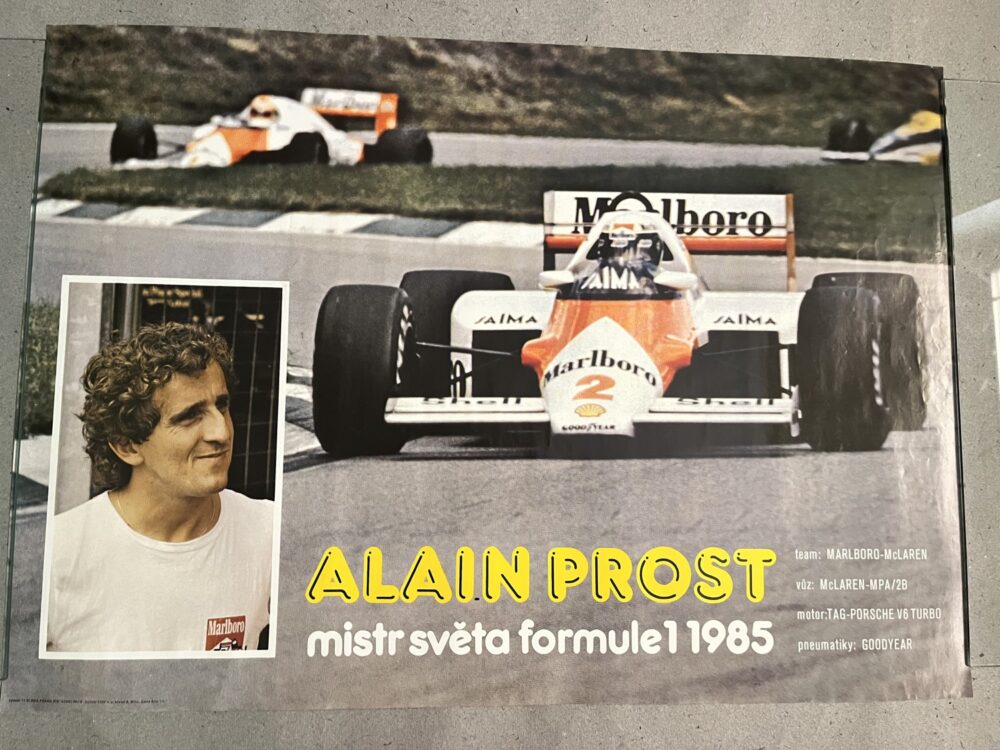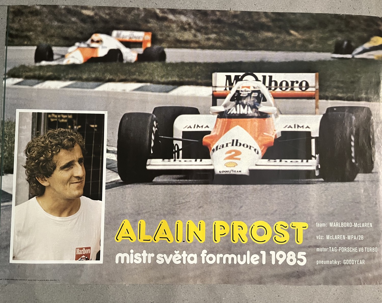 11 (hhh) Rozměr 84 x 59 cm Alain Prost, mistr světa formule 1 1985, team: MARLBORO-McLAREN, vůz: McLAREN-MPA/2B motor: TAG-PORSCHE V6 TURBO,pneumatiky: GOODYEAR. Vydala TJ SLAVIA PRAHA