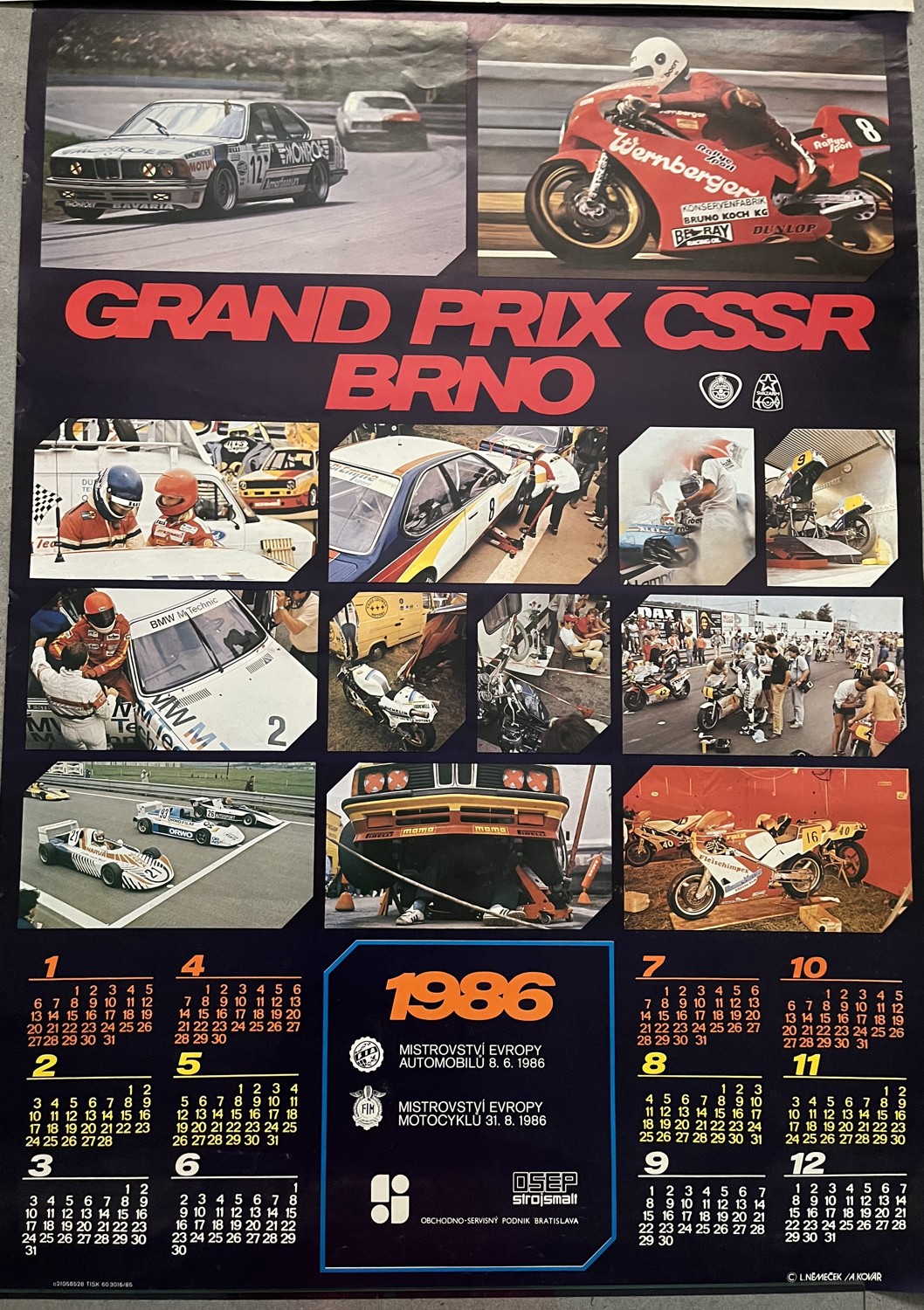 10 (hhh) Rozměr 85 x 60 cm, kalendář 1986. GRAND PRIX ČSSR BRNO, FIA Mistroství Evropy automobilů 8.6. 1986. FIM Mistroství Evropy motocyklů 31.8. 1986