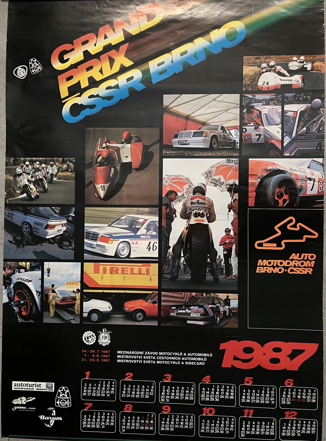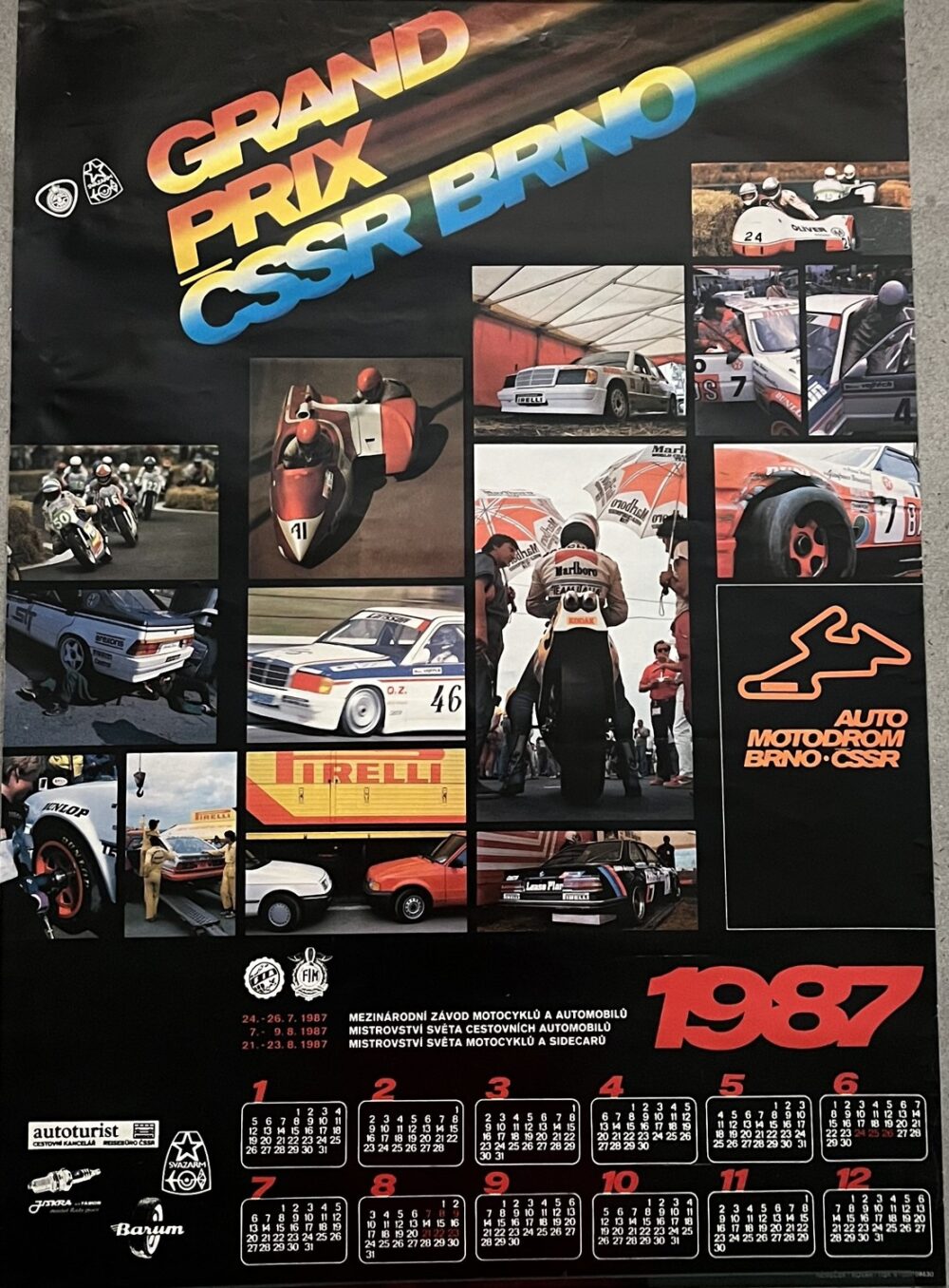 9 (hhh) Rozměr 58,5 x 83 cm. GRAND PRIX ČSSR BRNO. Auto Motodrom Brno ČSSR. Autoturist, Cestovní kancelář Reisebüro ČSSR. Jiskra Tábor. Svazarm. Barum. Němeček/Kovář. Mezinárodní závod motocyklů a automobilů. Mistroství světa cestovních automobilů. Mistroství světa motocyklů a sidecarů 1987, kalendář 1987