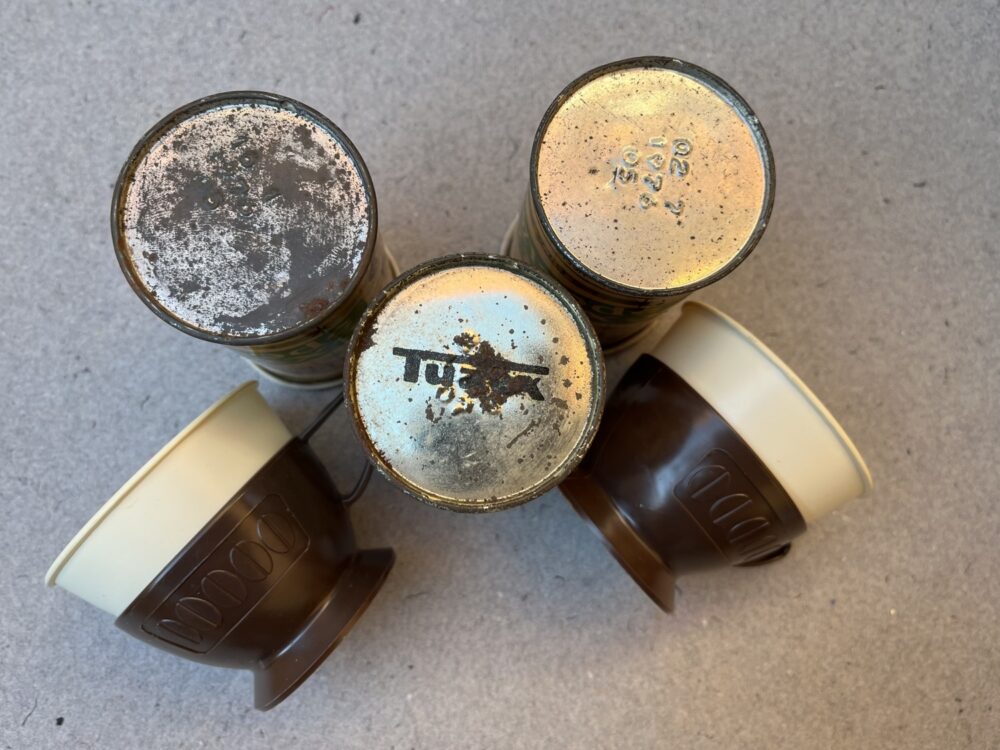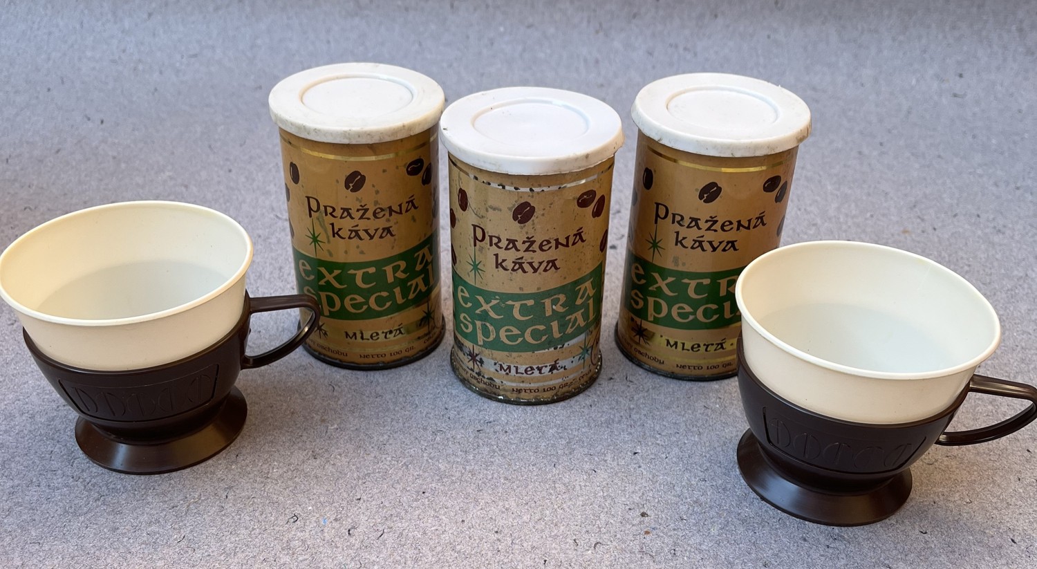 74 (t1) Rozměr: Plechovky průměr 5,5 cm, v. 10 cm, kelímky na kávu Pap – Sušice průměr 7,5 cm, v. 7 cm.