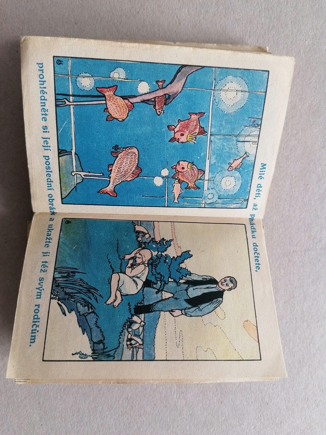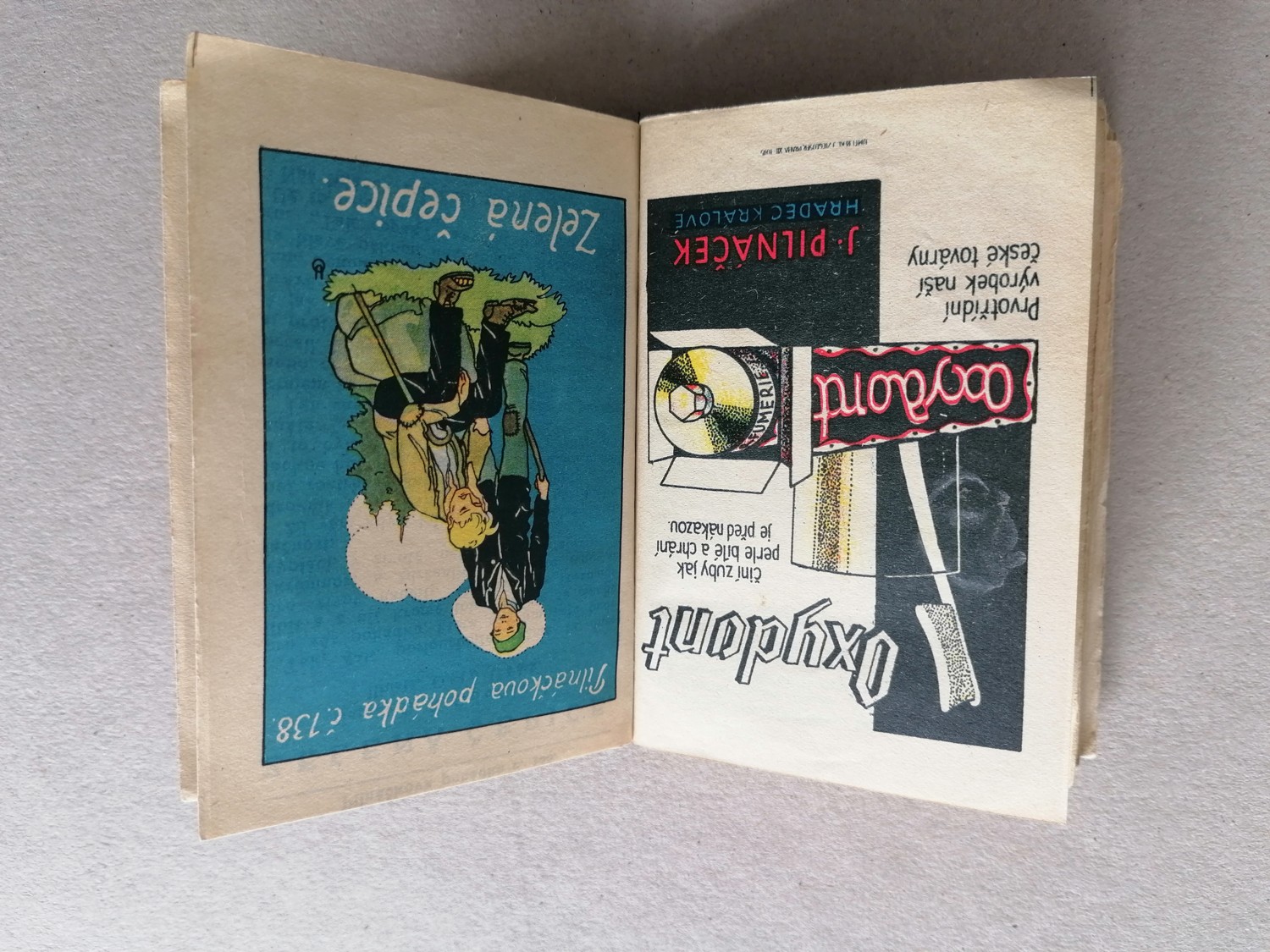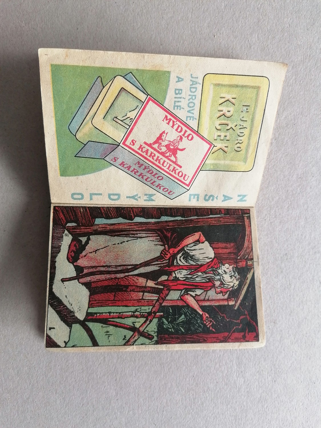 36 (ggt) Rozměr 8 x 11,5 cm. Krček – mýdlo smrček, Karel Kulík káva, kakao, čaj, Štefanka – cikorka, vločky Libín, Vita Togo, Triumph créme, Orientální mýdlo, Luka v Slaném, mýdlo s Karkulkou, Česká mouka, Chloe mýdlo Krček, Pilnáčkůvohol, Oxydont, Lanolia mýdlo vzácné vůně. Zelená čepice. Dva Robinsoni. Němeček. Jirka zbojník. Krásná princezna Zora. Divotvorný meč. Jak se ježek oholil. Vodní král. Král a bača a jiné pohádky. Mírně rozpadlá vazba.