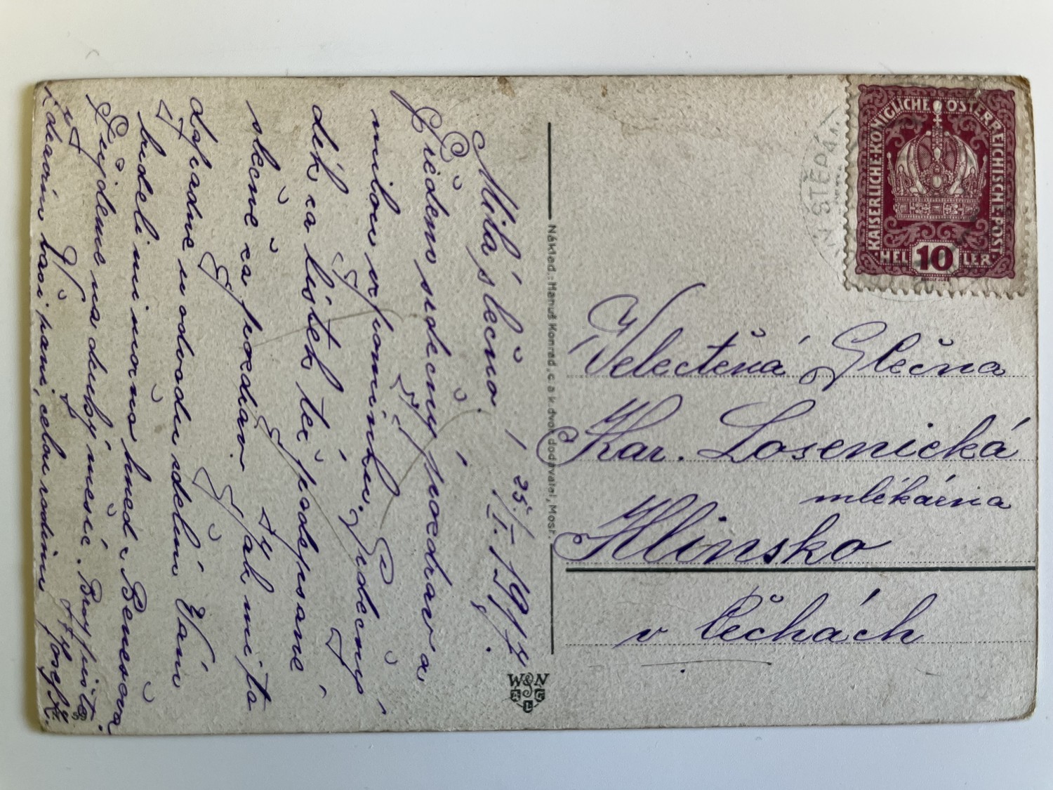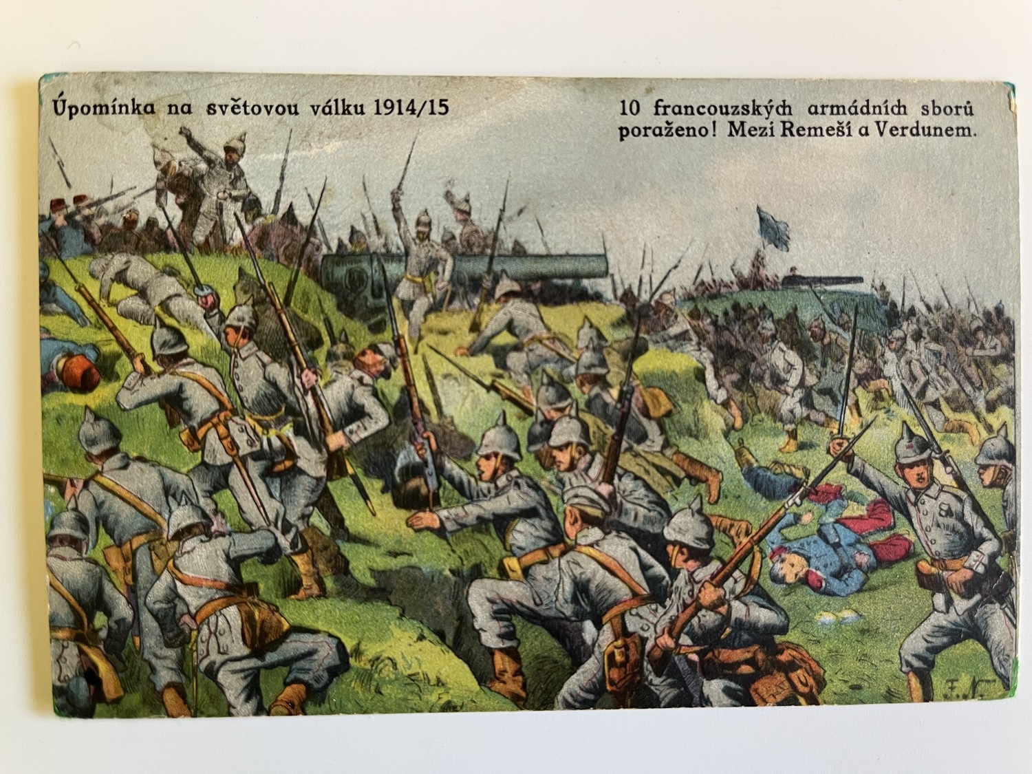 (hhl 63) MF prošlá, 1917. Adresát mlékárna Hlinsko (okres Chrudim). Upomínka na světovou válku 1914 / 1915 10 francouzských armádních sborů poraženo! Mezi Remeší s Verdunem. Vojáci, bitva, bojiště, výstroj, výzbroj, pušky…