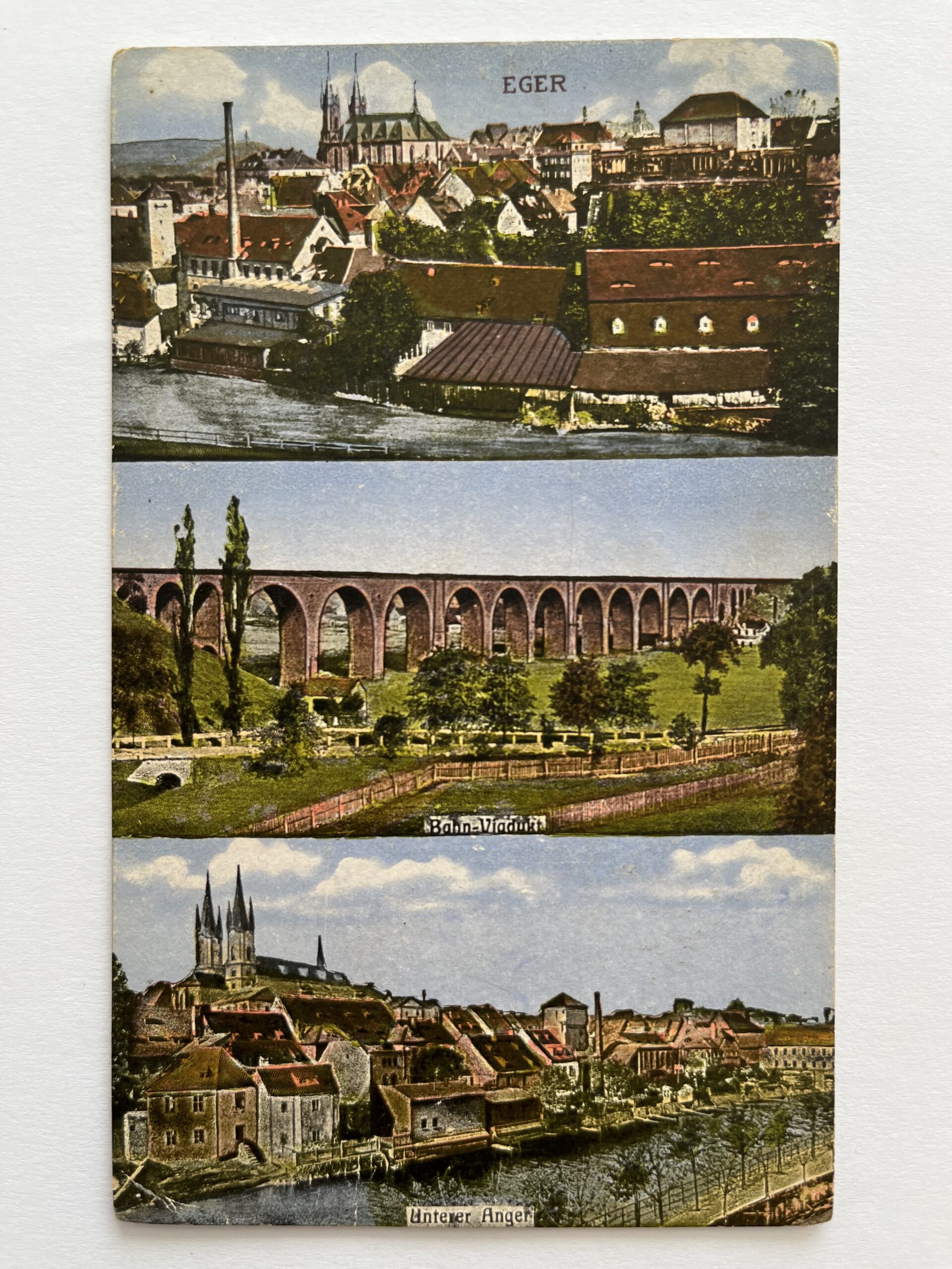 Pohlednice Cheb – železniční viadukt, koláž r. 1918