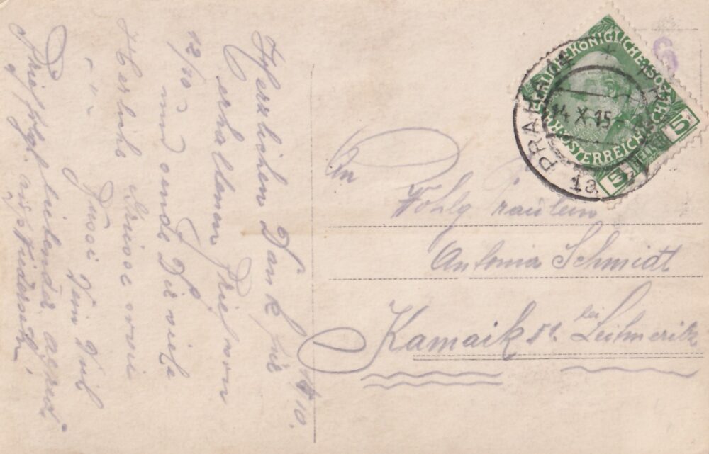 (NJ-99) Rozměr: 9×14 cm; Rakousko-Uhersko 1867-1918; Prošlá se známkou, razítko Praha, adresováno: A. Schmidt, Kamýk;