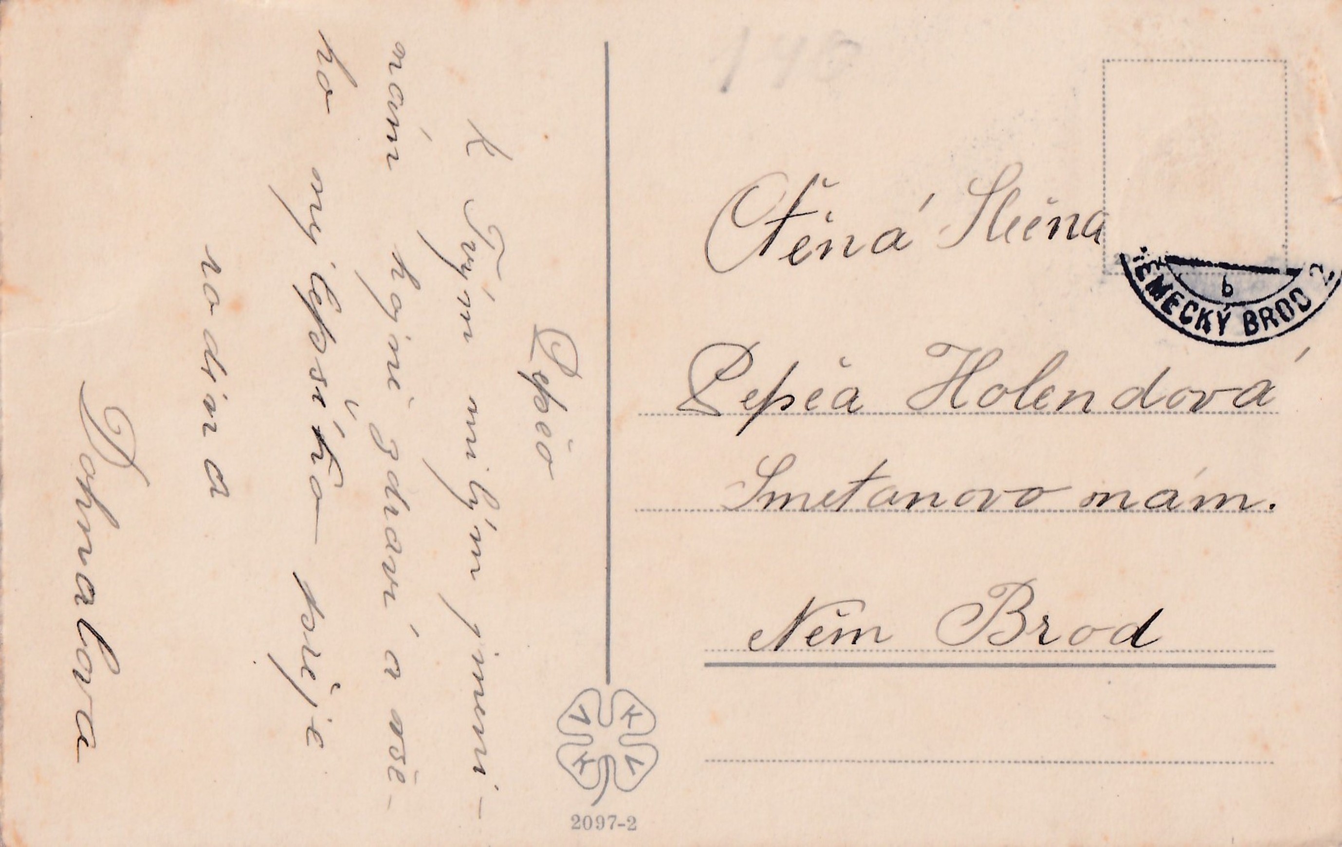 (OF-99) Rozměr: 9×14 cm; Prošlá se známkou, razítko Německý Brod (Havlíčkův Brod), adresováno: S. Holendová, Německý Brod;