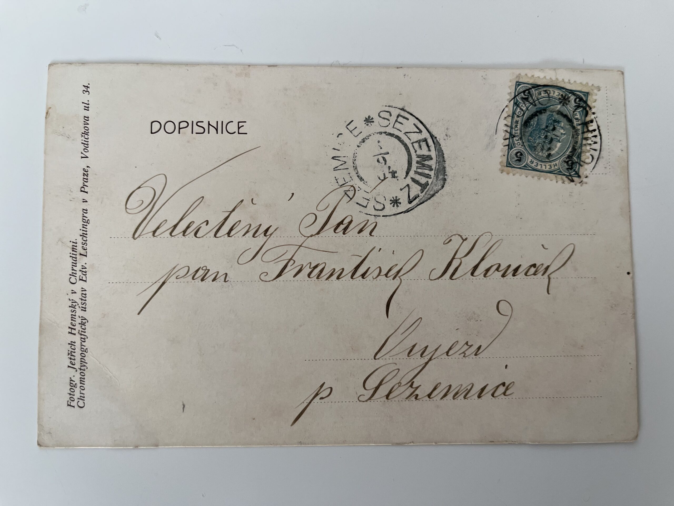 (Pardubice-17) Pohlednice malý formát, prošlá poštou, 1904. Pozdrav z Chvojna. Koláž – Kostel. Obecná škola. Pošta. Obchodní dům Adolfa Seinera. Lesovna.