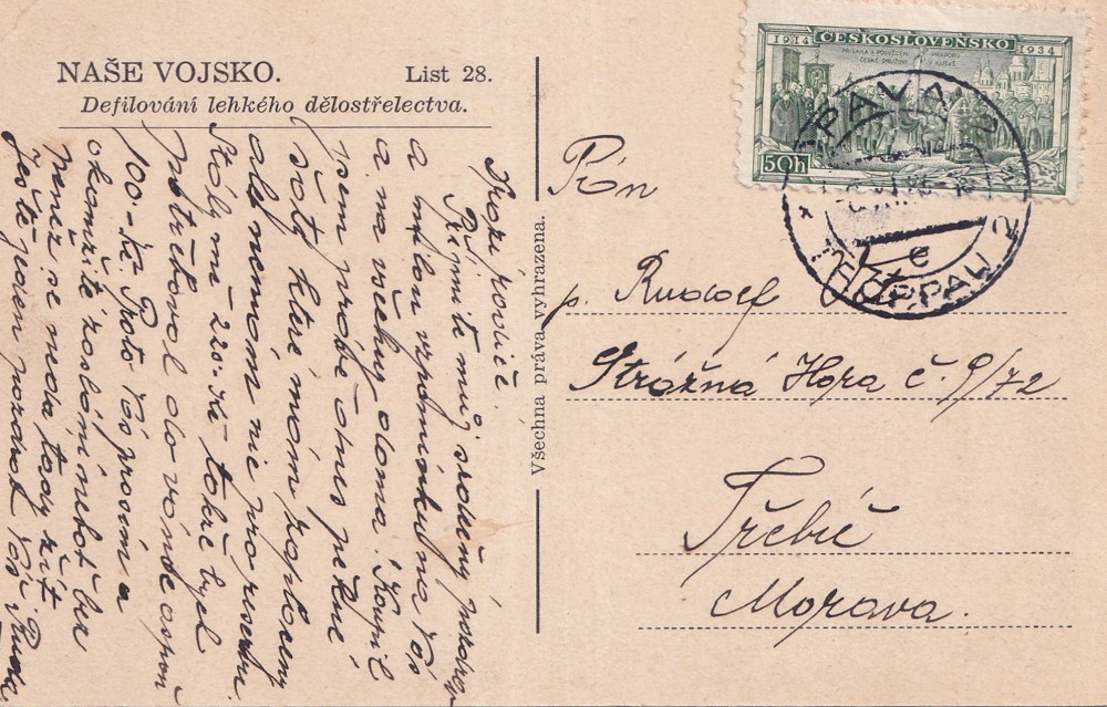 65 (hhg) rozměr 14 x 9 cm. Adresováno Třebíč. Razítko Opava