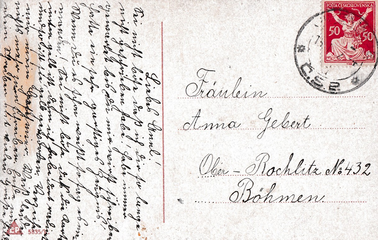 (MP-99) Rozměř: 9×14 cm; Prošlá se známkou, razítko nečitelné, adresováno: Anna Gebert, Rokytnice nad Jizerou;