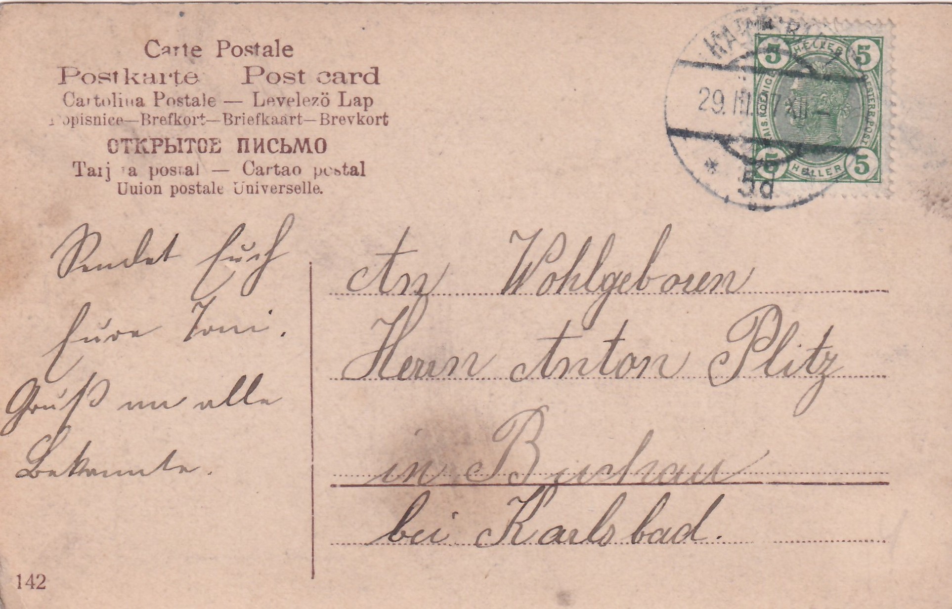 (MA-99) Rozměr: 9×14 cm; Rakousko-Uhersko 1867-1918; Prošlý se známkou, razítko nečitelné, adresováno: Anton Plitz, Bochov;