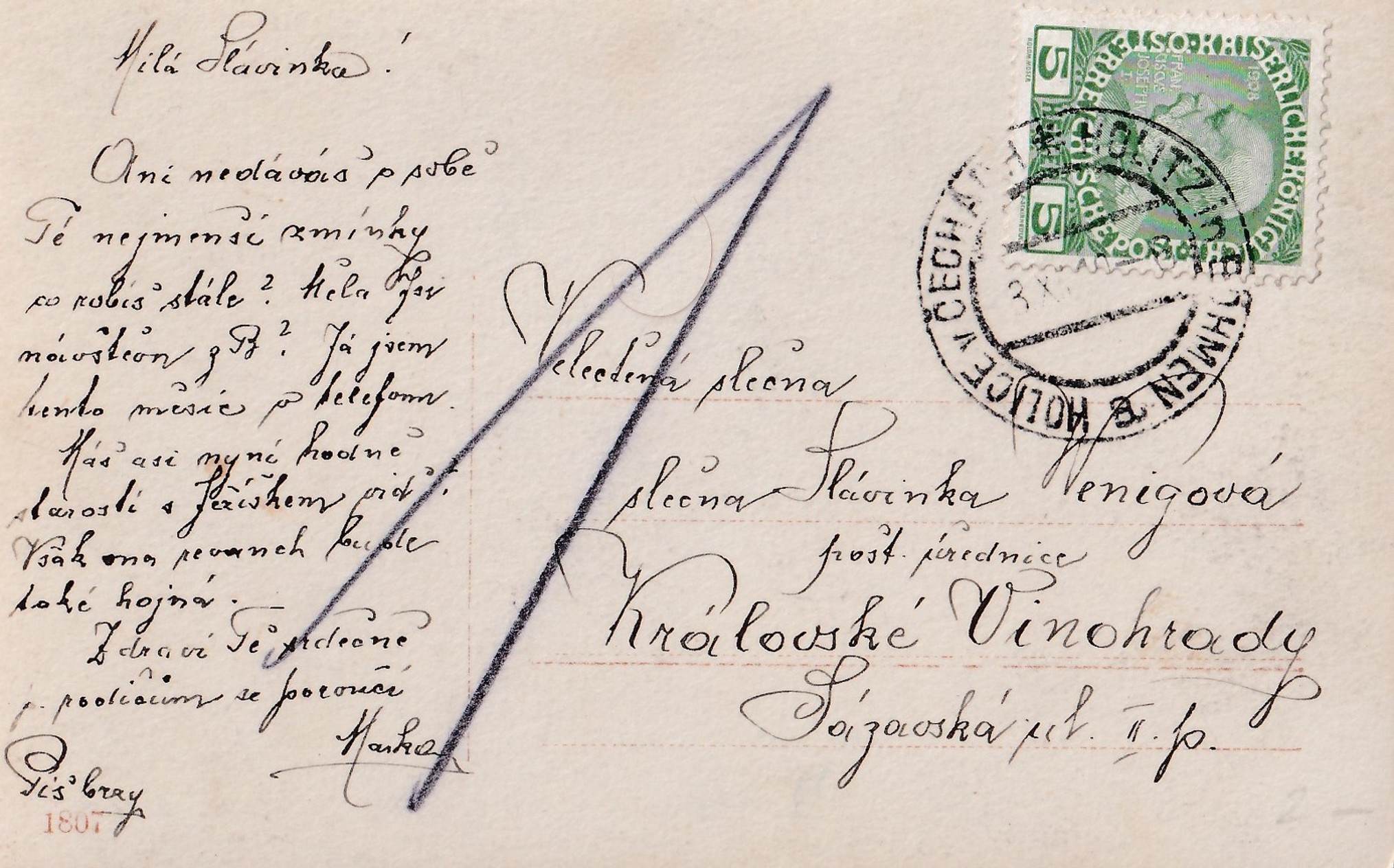 (MW-99) Rozměr: 9×14 cm; Prošlá se známkou, razítko Holice, adresováno: Slávinka Wenigová, poštovní úřednice, Praha;
