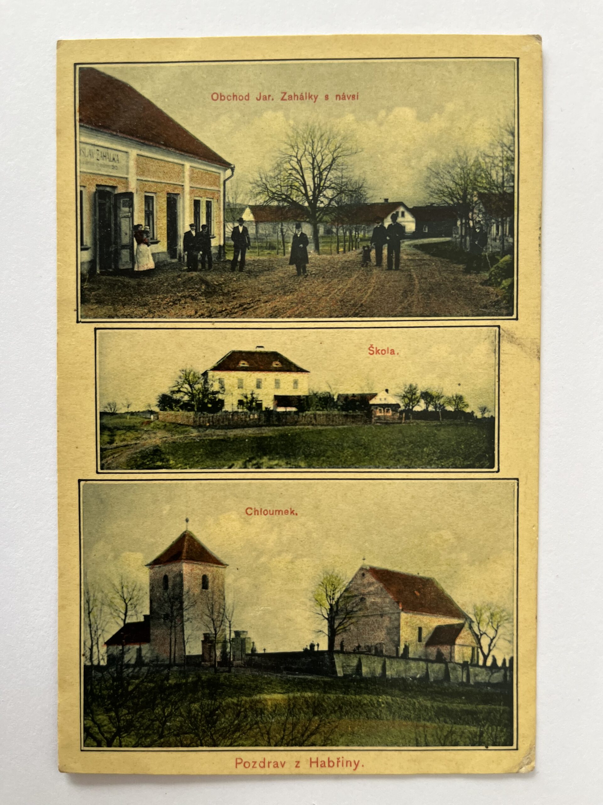 (Hradec Králové-68) Pohlednice malý formát, prošlá poštou. HABŘINA – Chloumek, obchod Zahálky, náves, škola. Koláž. Okres Hradec Králové.