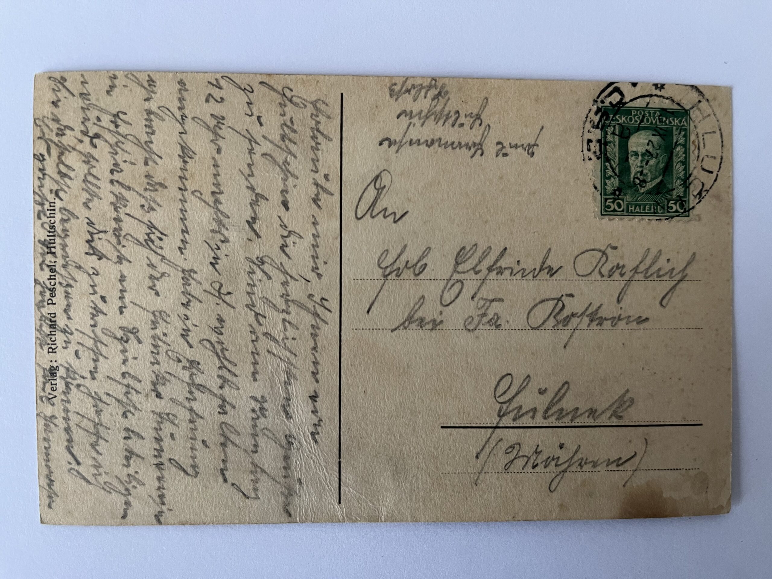 (Opava-31) Pohlednice malý formát, prošlá poštou, 1927. HLUČÍN – Zámek, dámský ústav Karoliny. Koláž. Okres Opava.
