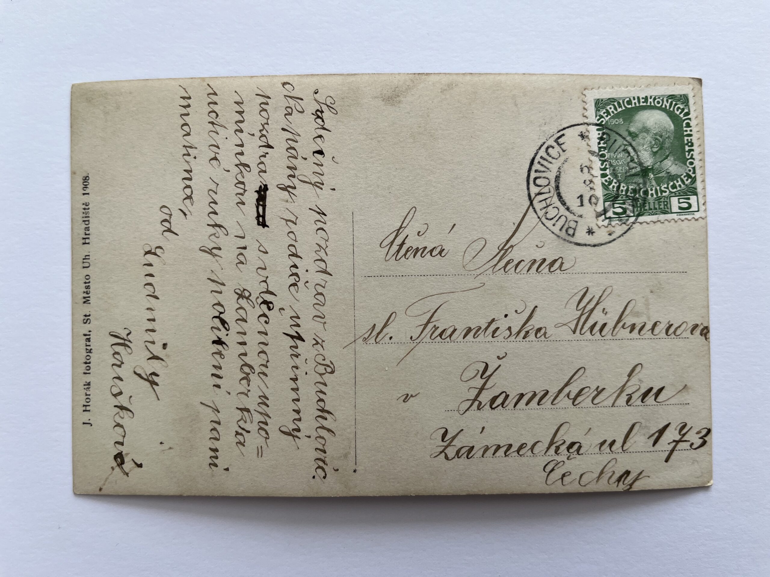 (Uherské Hradiště hhw) Pohlednice malý formát, prošlá poštou, 1910. Hrad Buchlov – Kaple sv. Barborka, hlavní brána, první nádvoří, druhé nádvoří. Fotograf Jan Horák, Staré Město 1907.