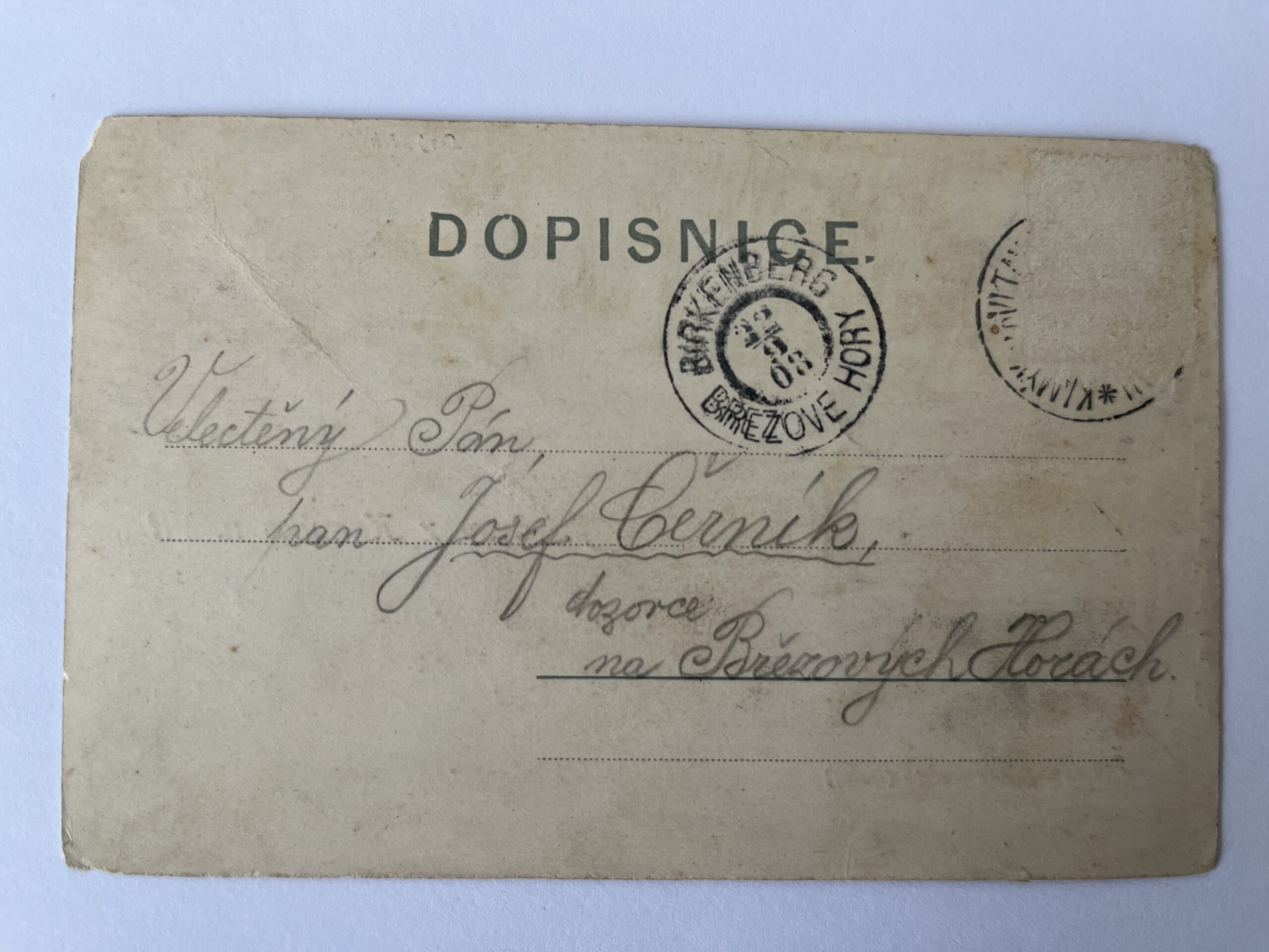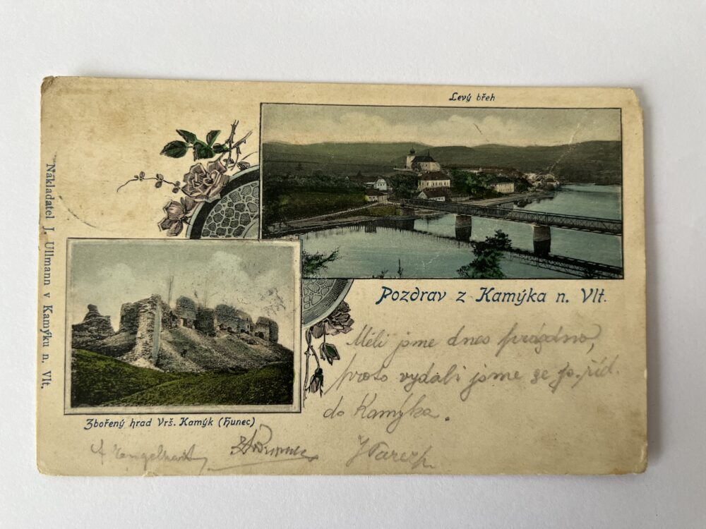 (Příbram-29) Pohlednice malý formát, prošlá poštou, 1903. Kamýk nad Vltavou – Levý břeh. Zřícenina hradu Vrškamýk – Hunec, koláž. Okres Příbram.