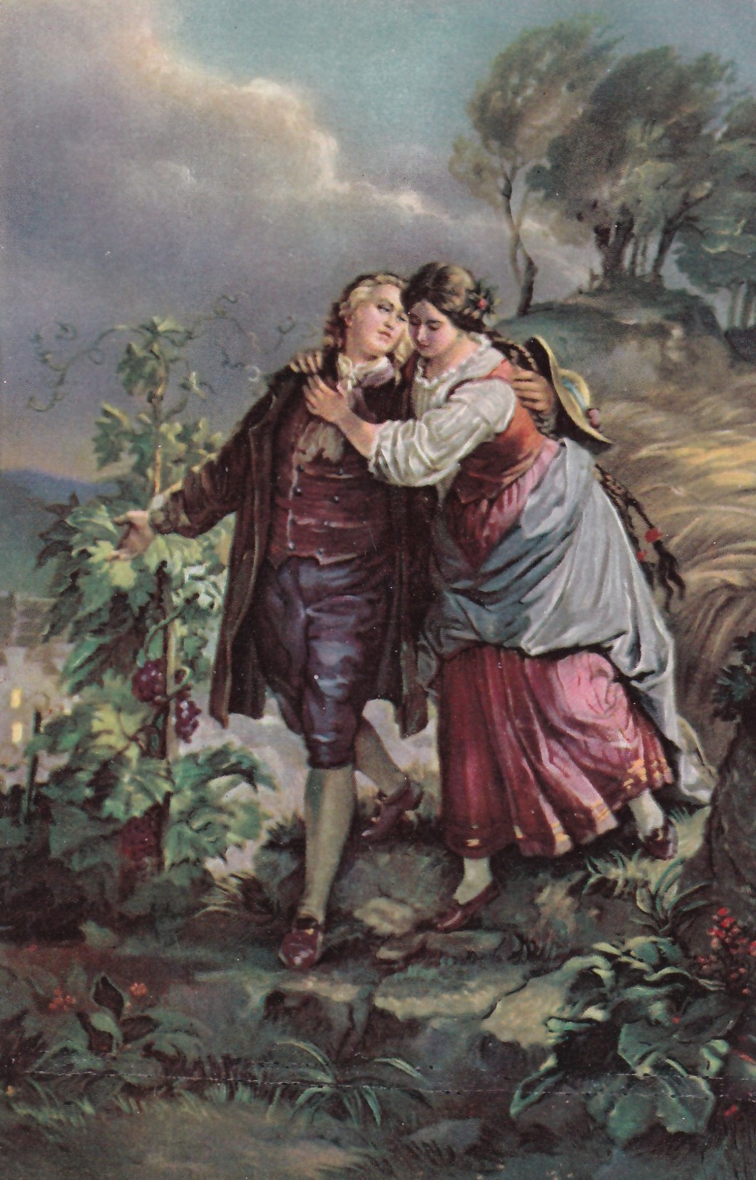 SKU: 643 Category:Pohlednice Tags:Hermann und Dorothea auf dem Heimweg, Kaulbach, móda, muži, OB, oblek, páry, pohlednice, pohledy, příroda, první polovina 20století 1900-1945, šaty, umění a ornamenty, ženy