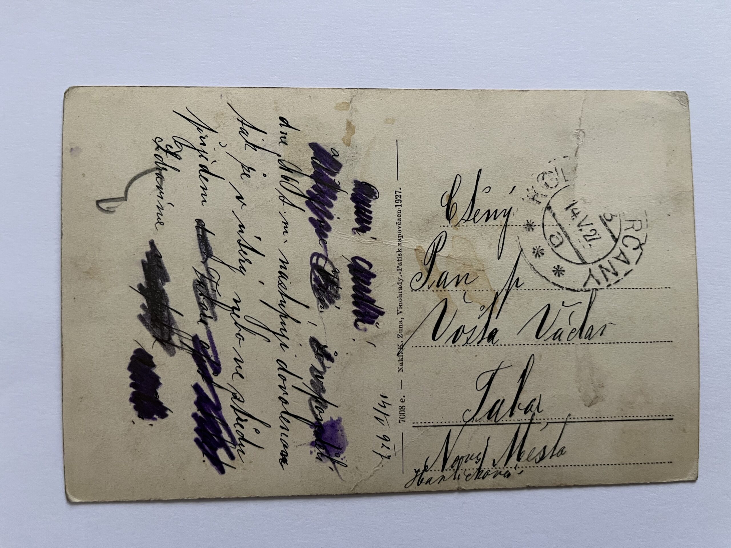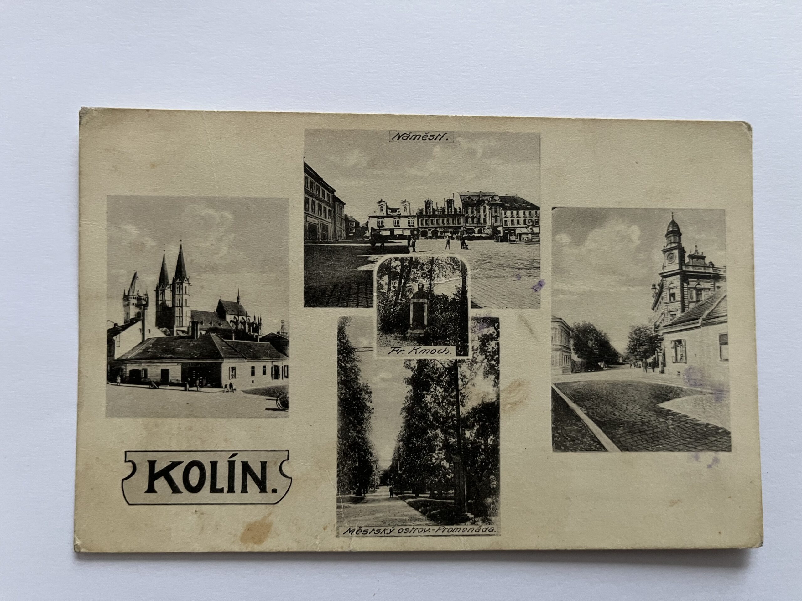 (Kolín 66) Pohlednice malý formát, prošlá poštou, 1927. Kolín, koláž – Náměstí. Památník Františka Kmocha. Městský ostrov – Promenáda.