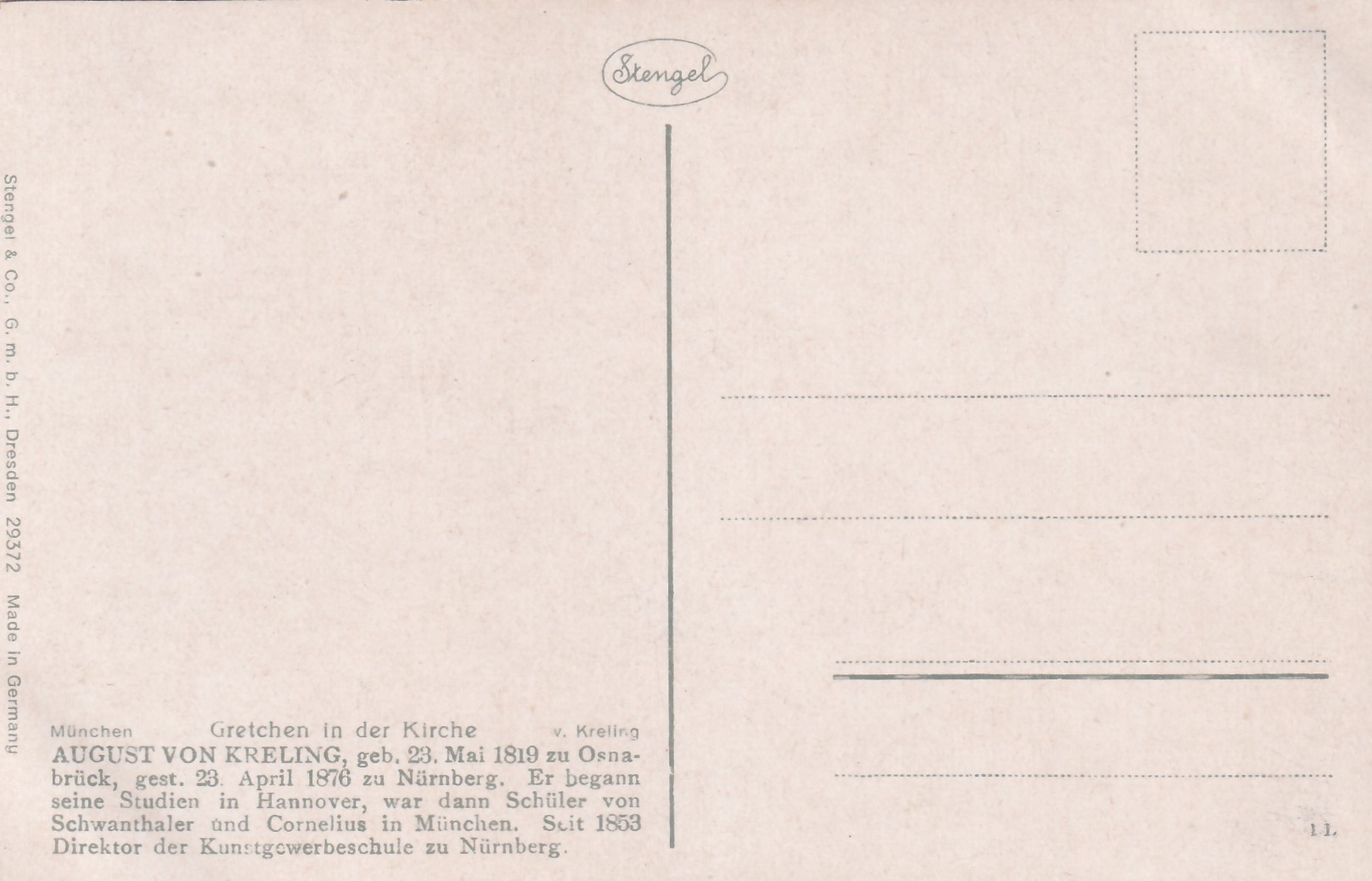 (OB-99) Rozměr: 14×9 cm; pohlednice má zlatý okraj, zezadu uveden umělec a informace o něm + název díla, v německém jazyce;
