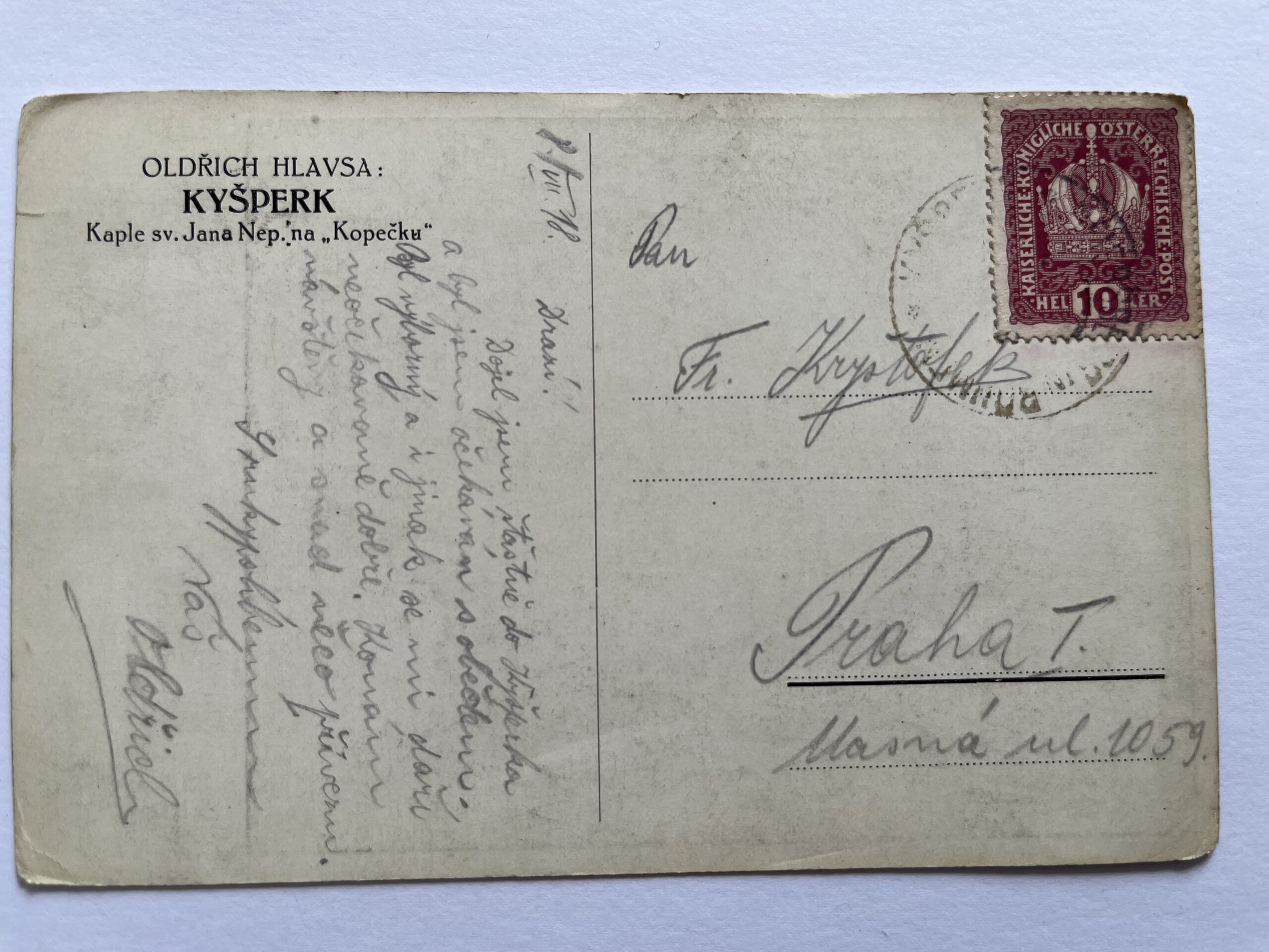 (Ústí nad Orlicí 72) Pohlednice malý formát, prošlá poštou, 1918. Malíř Oldřich Hlavsa: KYŠPERK – Kaple svatého Jana Nepomuckého na Kopečku.