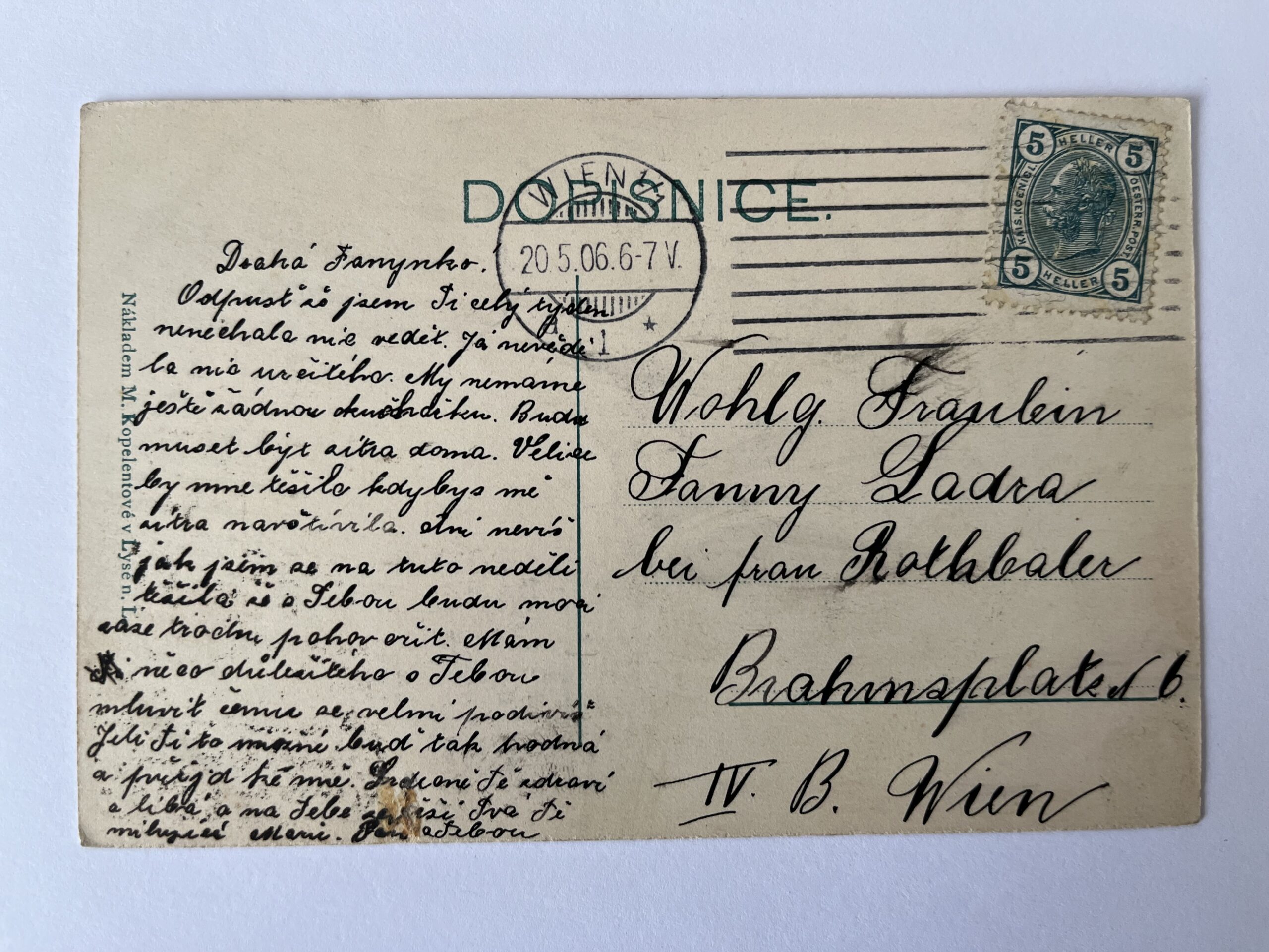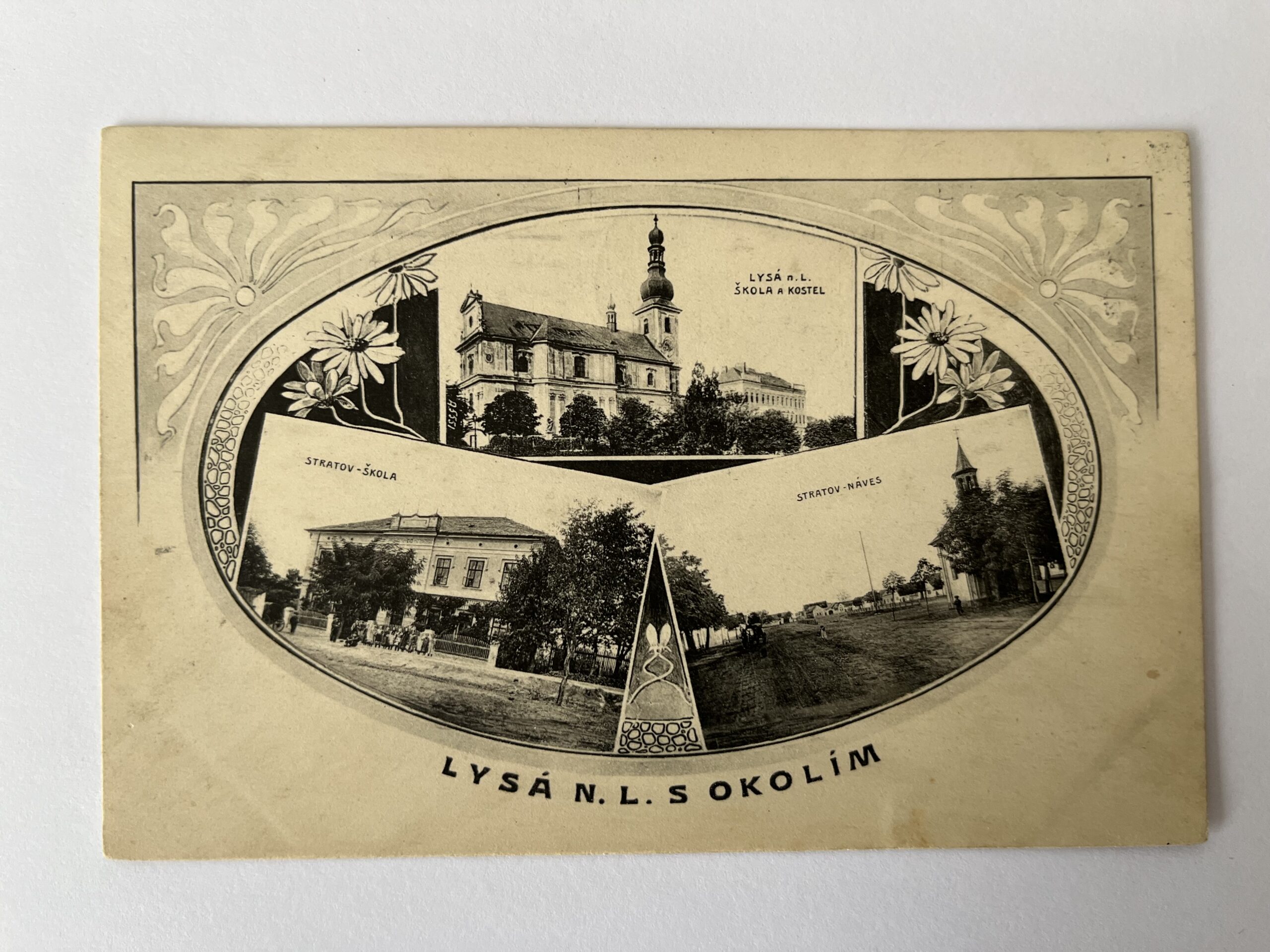 (Nymburk-46) Pohlednice malý formát, prošlá poštou, 1906. Lysá nad Labem – škola, kostel. Stratov – náves, škola. Koláž.