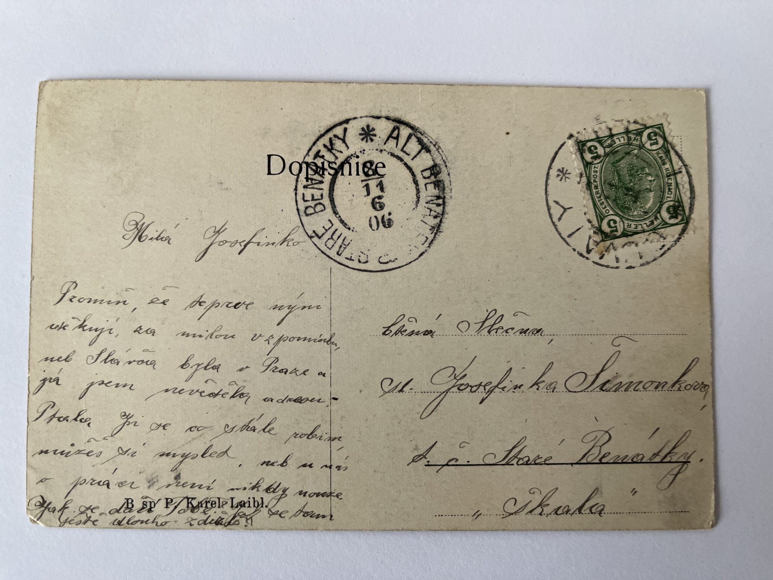 (Beroun-67) Pohlednice malý formát, prošlá poštou, 1906. Adresát: Staré Benátky