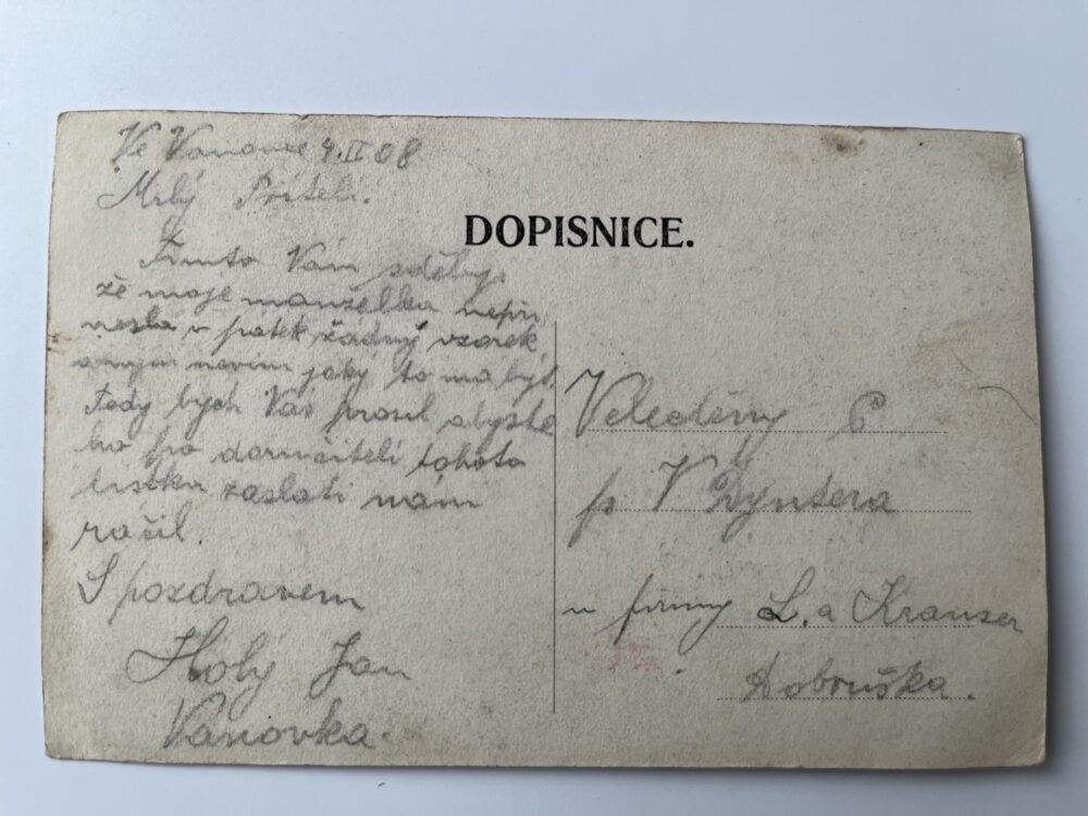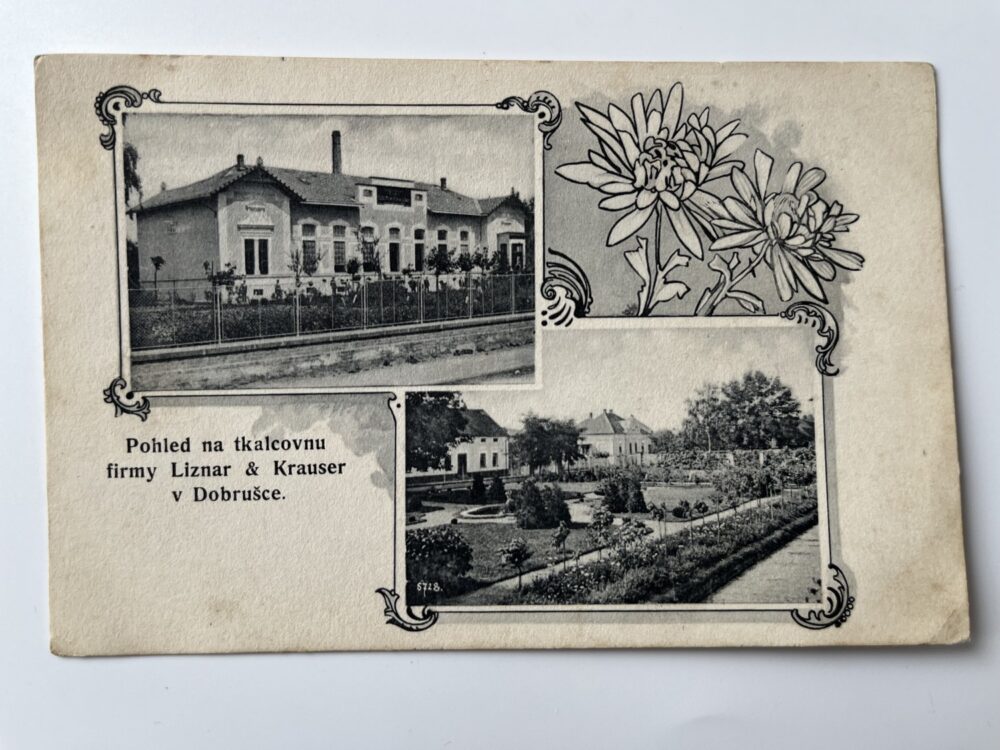 (Rychnov nad Kněžnou-35) Pohlednice malý formát, prošlá poštou. Pohled na tkalcovnu firmy Liznar – Krauser v Dobrušce.