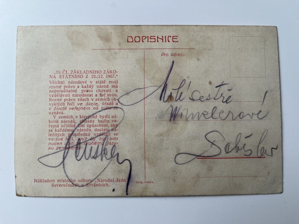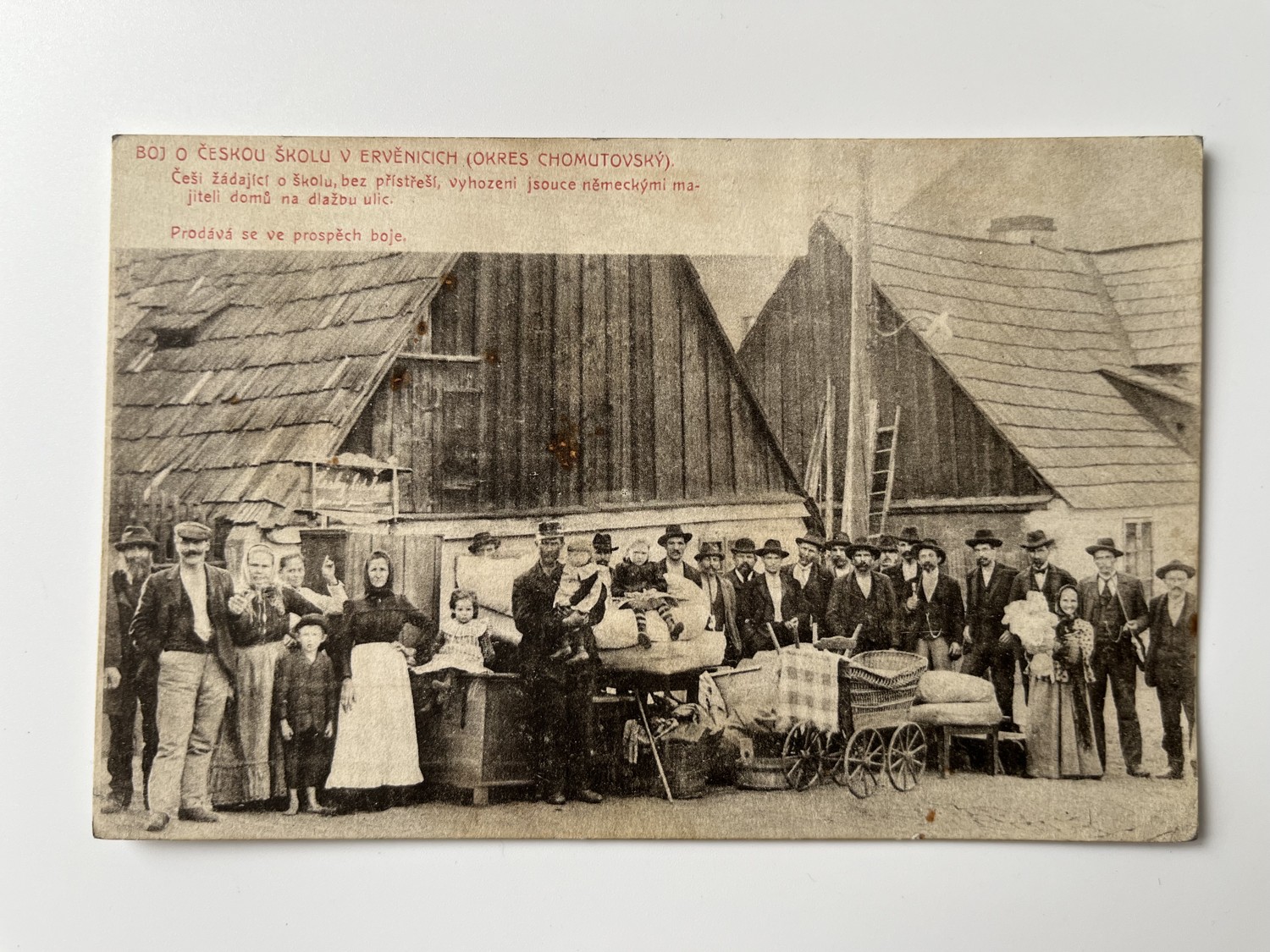 (Chomutov-45) Pohlednice malý formát. Boj o českou školu v Ervěnicích. Češi žádající o školu, bez přístřeší, vyhození jsouce německými majiteli domů na dlažbu ulic.
