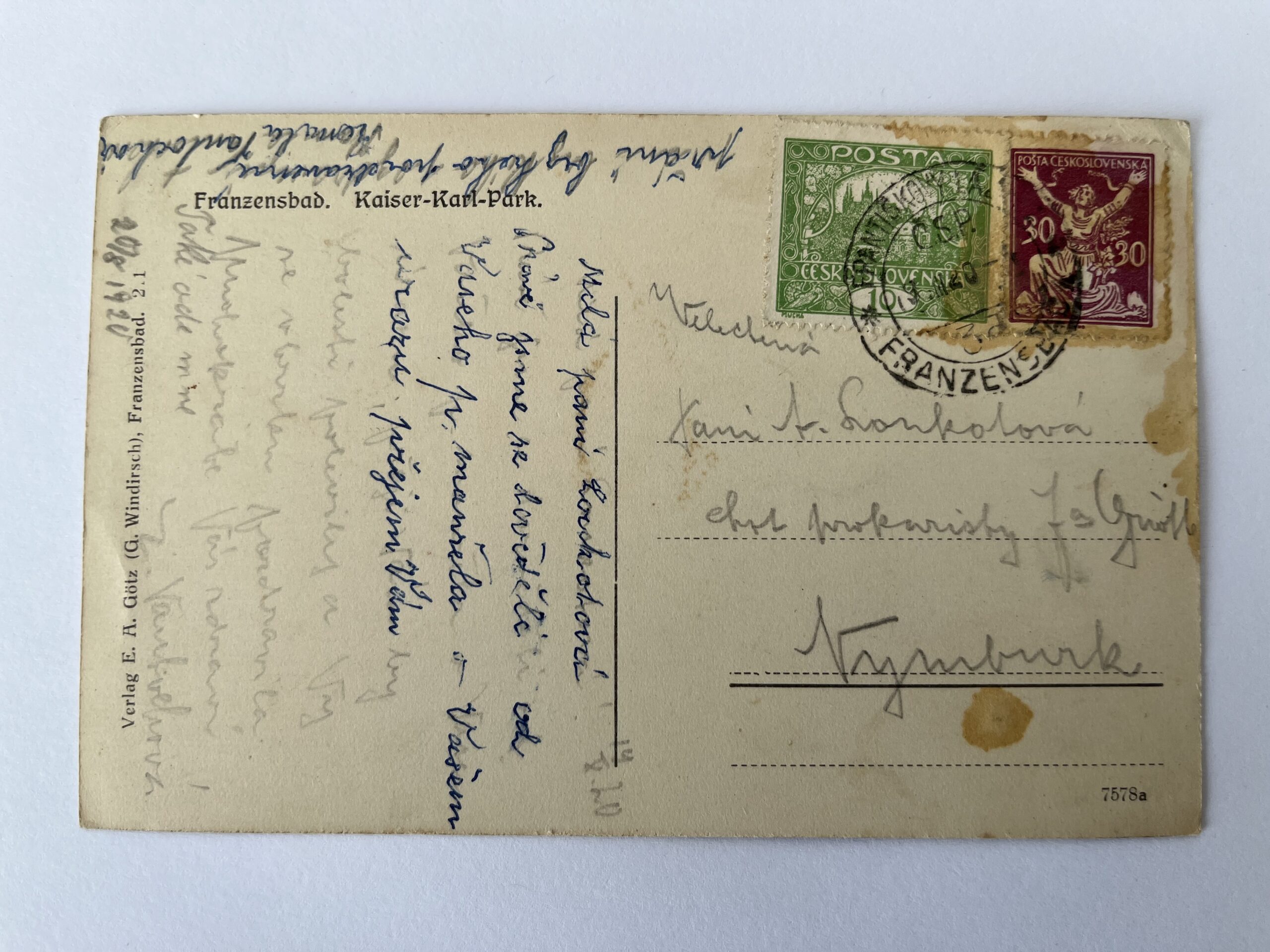 (Cheb-3) Pohlednice malý formát, prošlá poštou, 1920. Adresát choť prokuristy, Nymburk.