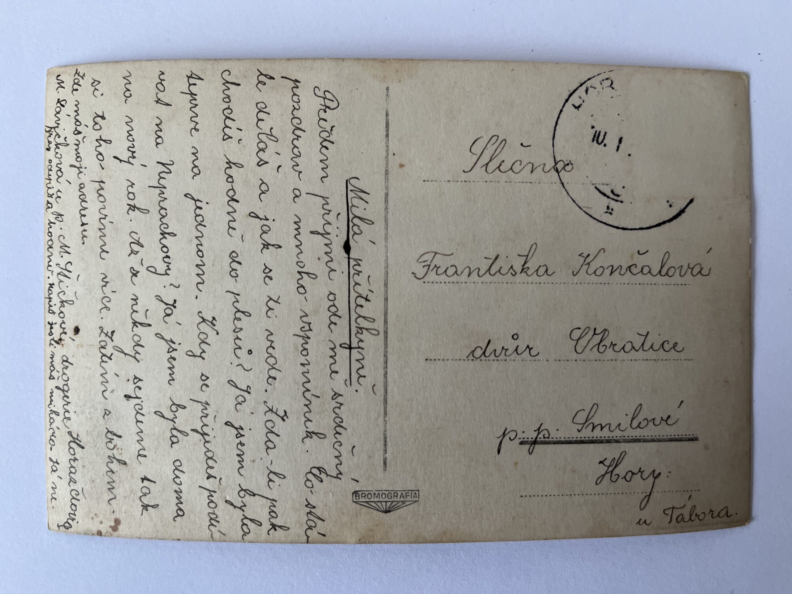 (Klatovy-2) Pohlednice malý formát, prošlá poštou. Adresát Obrátice, Smilovy Hory v okrese Tábor.