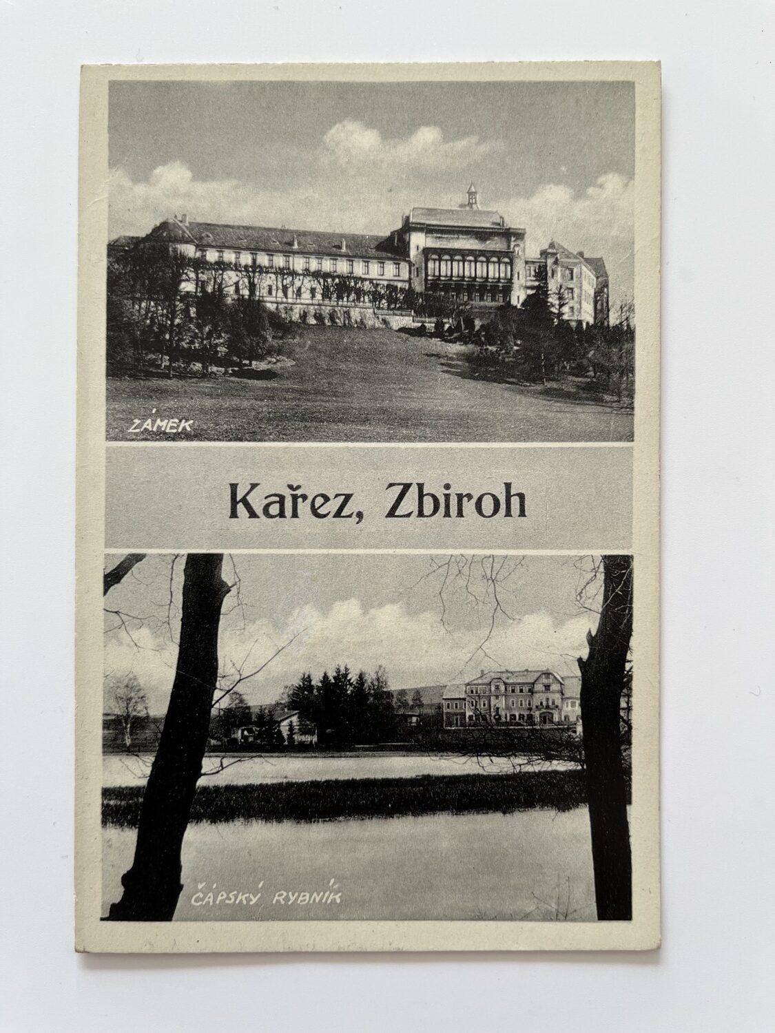 (Rokycany-64) Pohlednice malý formát, prošlá poštou. Kařez, Zbiroh – Zámek. Čápský rybník. Rok 1944