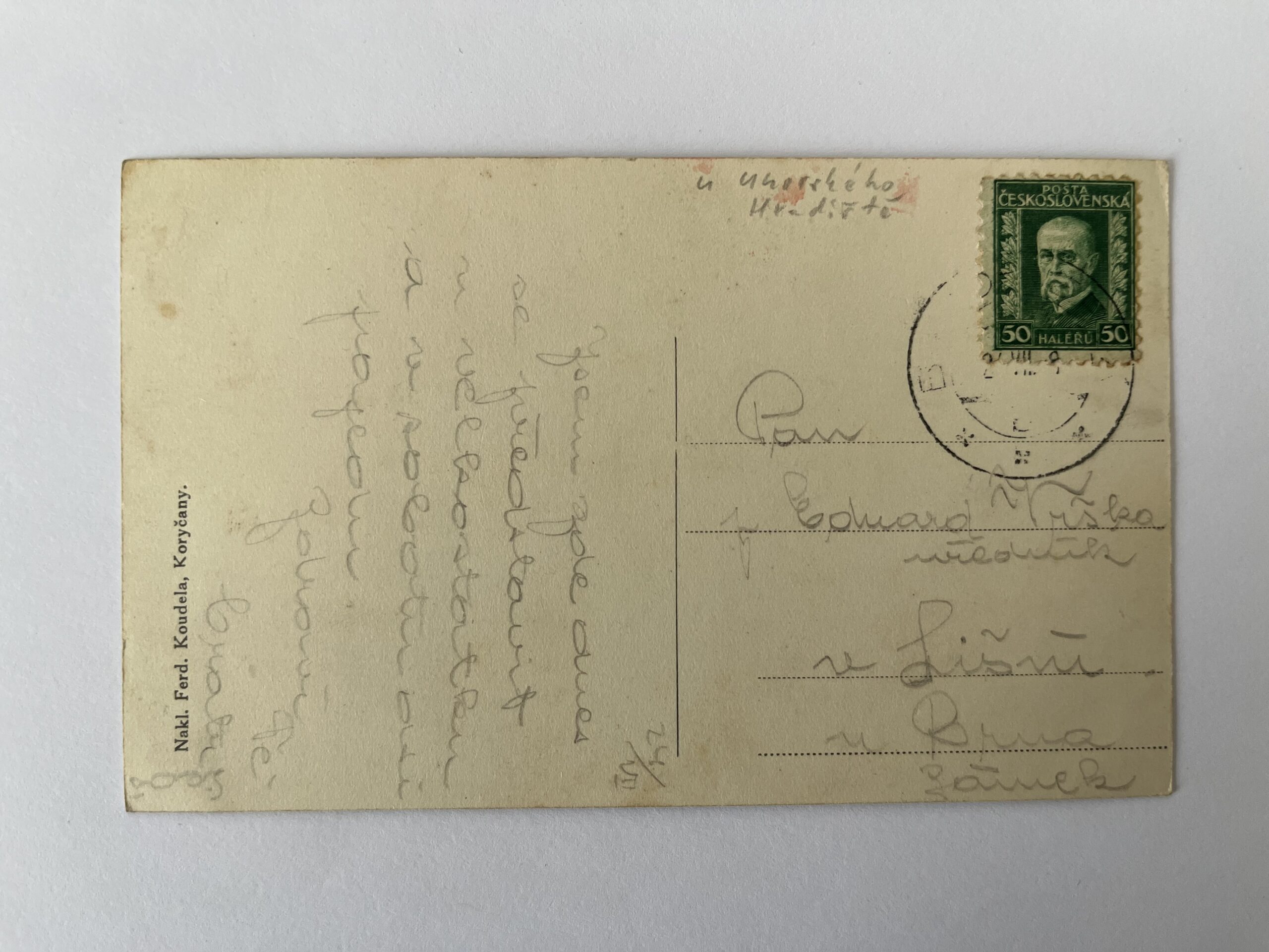 (Kroměříž-53) Pohlednice malý formát, prošlá poštou. Adresát: úředník v Lišni u Brna, zámek.