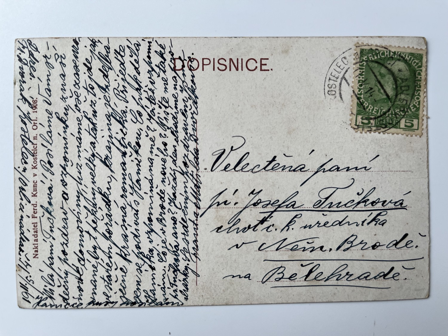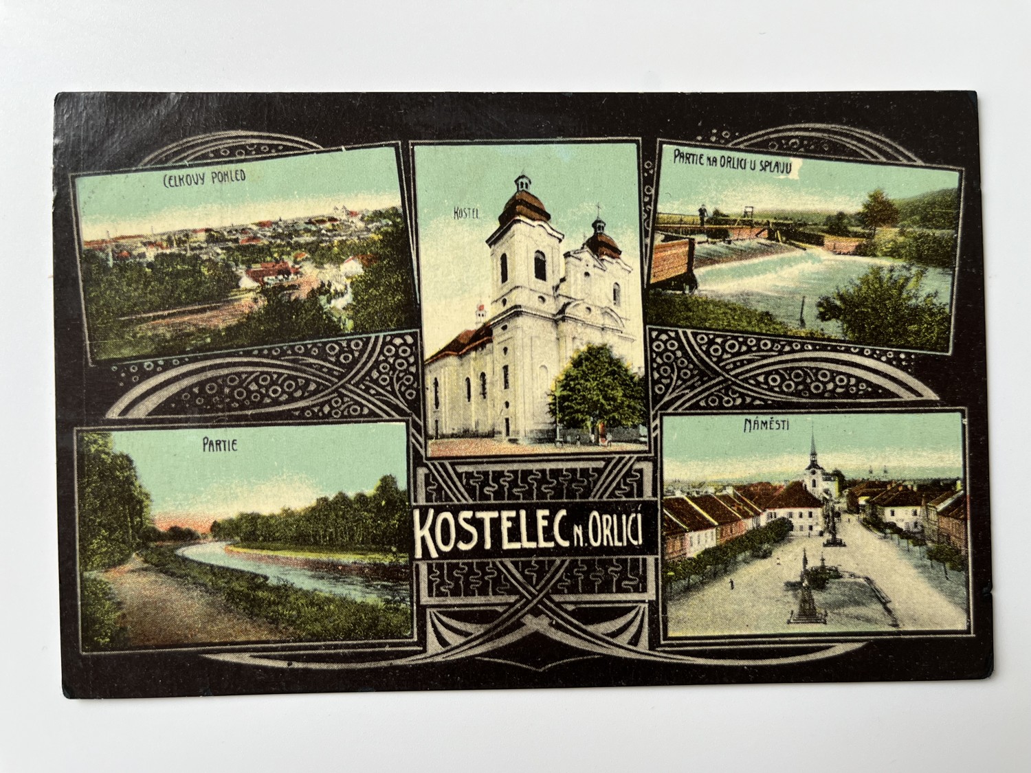 (Rychnov nad Kněžnou-35) Pohlednice malý formát, prošlá poštou. Koláž – Celkový pohled. Partie. Kostel. Partie na Orlici u splavu. Náměstí. Rok 1914.