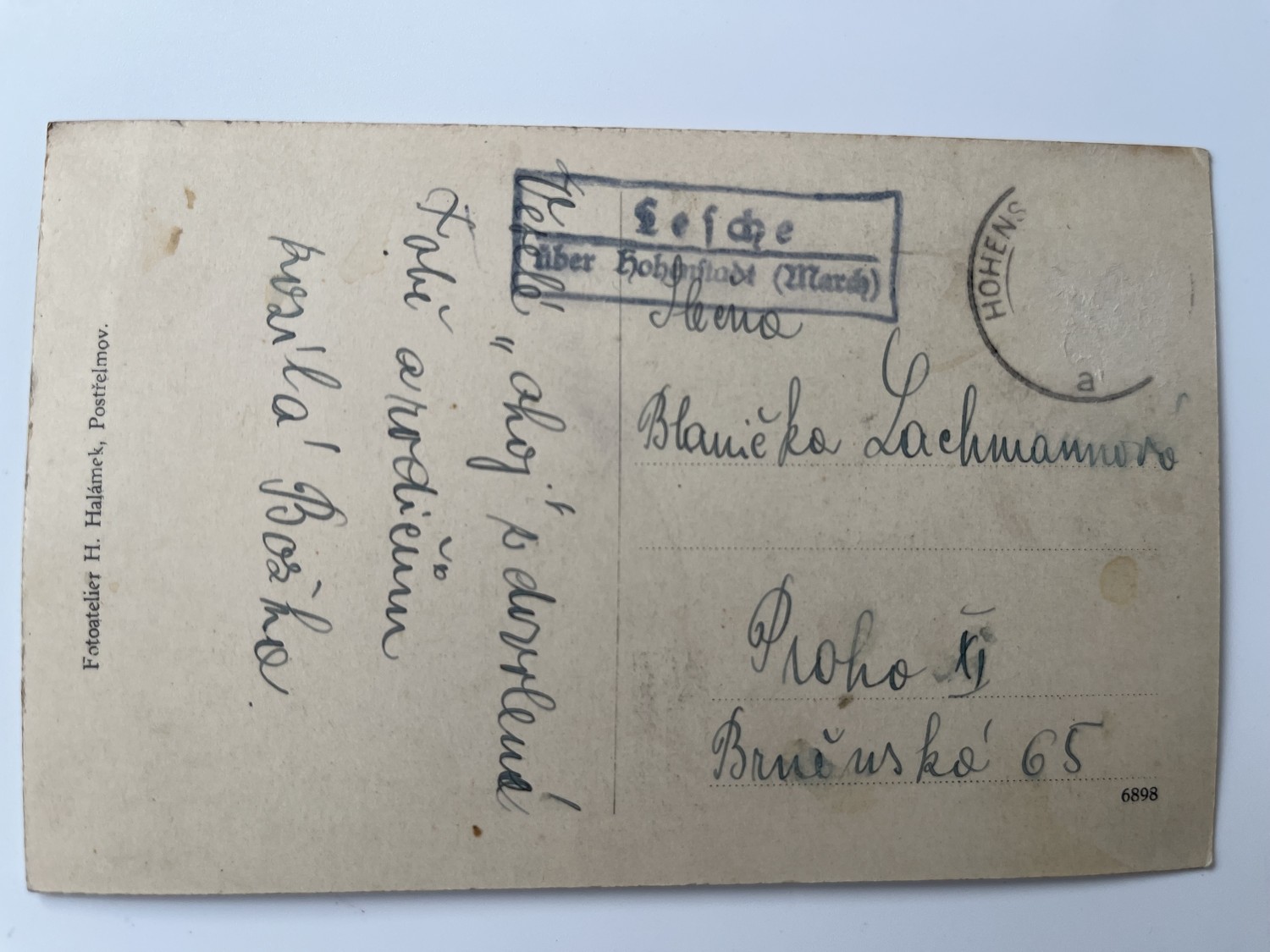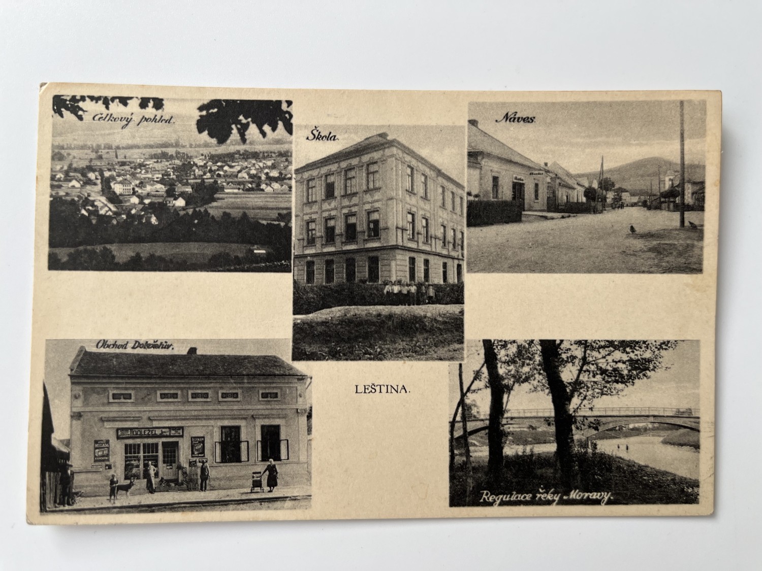 (Šumperk-12) Pohlednice malý formát, prošlá poštou. Leština – Škola. Náves. Celkový pohled. Obchod Doležalův. Regulace řeky Moravy. Koláž.