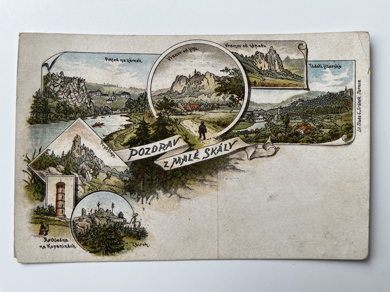 (Jablonec nad Nisou-38) Pohlednice malý formát, čistá. Koláž – Pohled na zámek. Skalní hrad – Vranov od jihu. Skalní hrad – Vranov od západu. Údolí jizerské. Rozhedna na Kopaninách. Zřícenina hradu Zbiroh.